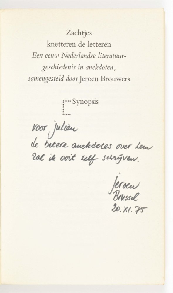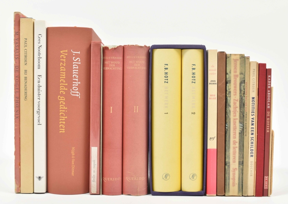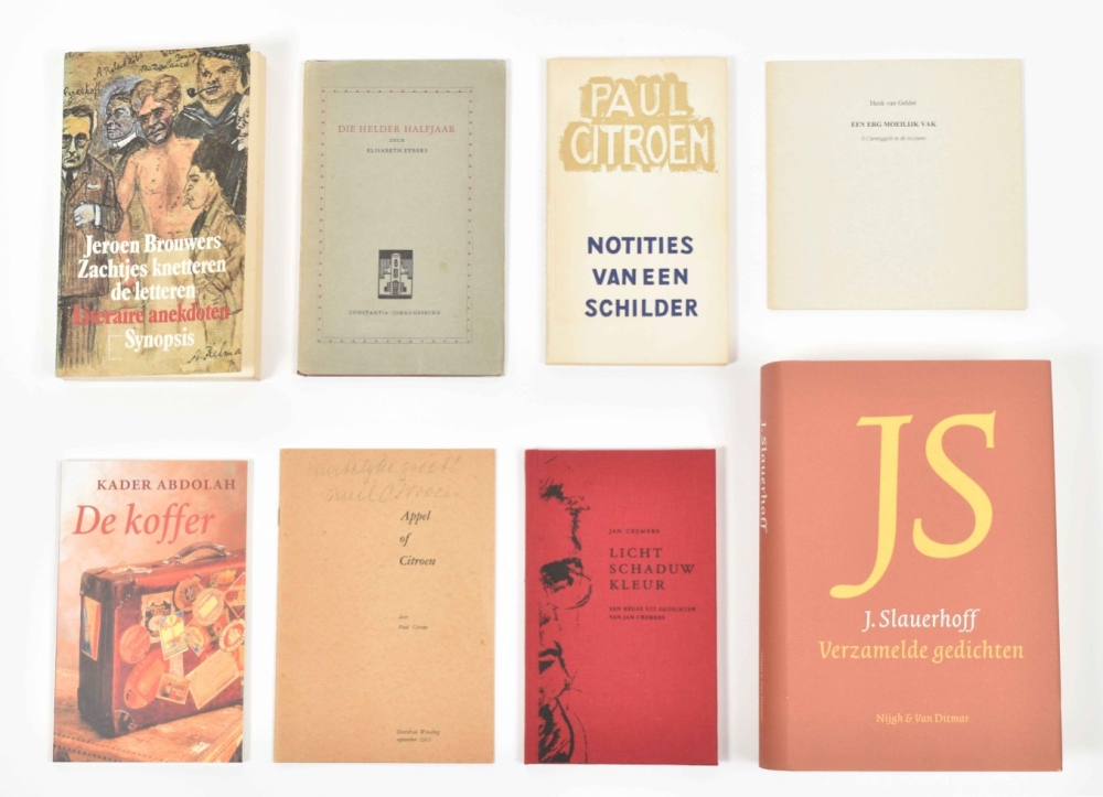 (2) F. B. Hotz. Het Werk 1 and 2. Arbeiderspers, 1997. 2 vols. in slipcase. (3) Jeroen Brouwers. Zachtjes knetteren de letteren. Literaire anekdoten. Synopsis, 1975. Signed with dedication by Brouwers. (4) J. Slauerhoff. Verzamelde gedichten. Nijgh & van Ditmar, 2018. (5) Simon Carmiggelt. Vier kroegmannen. Amst., Galerie Petit, 1975. No. H. C. 3, signed by Carmiggelt and William Kuik (drawings). Added: 5 signed works by Paul Citroen, Kader Abdolah and Jan Cremer. -and 7 more. (total 19)