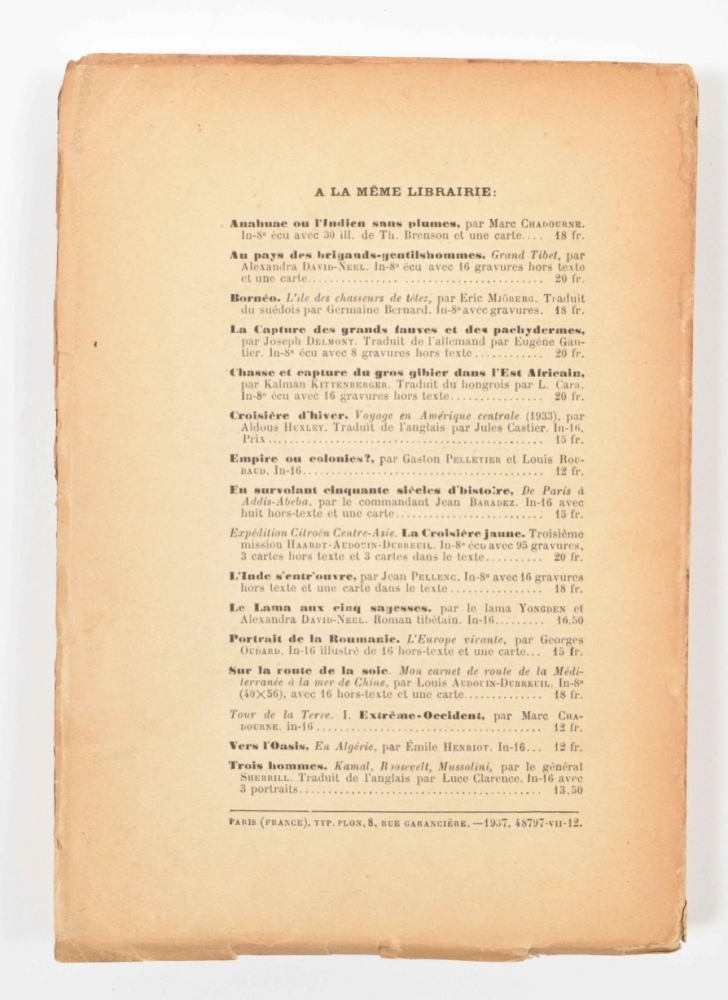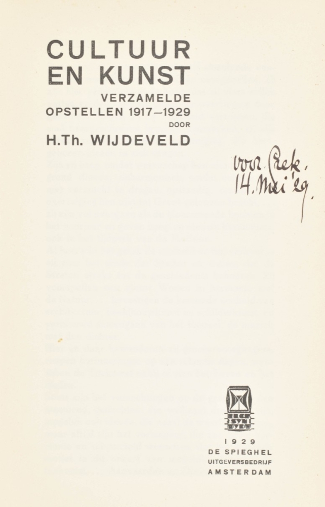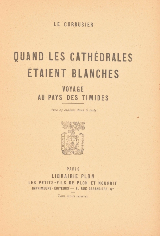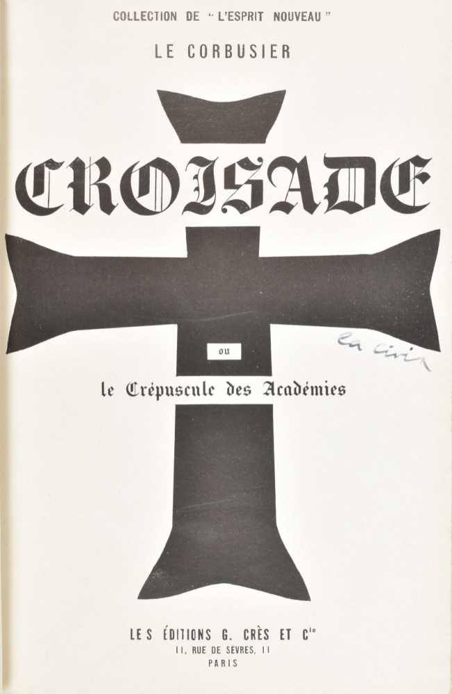 A bit browned along edges, upper outer corner bent. Sl. stained/ foxed. Spine browned and sl. dam at top. Overall a fine copy of this rare publication on the fifth Congrès Internationale d'Architecture Moderne (CIAM). Contains contributions by: Le Corbusier (Solutions de principe); J. LL. Sert; Sirkus; Norbert Bázard; Colonel Vauthier; and Freysinnet, a.o. (2) Le Corbusier. Quand les cathédrales étaient blanches. Voyage au pays des timides. Avec 45 croquis dans le texte. Paris, Plon, 1937, (11), 325 p., ills., orig. picture wr. Printed on poor quality paper, untrimmed and brittle/ browned in margins; wr. torn at upper joint and spine browned. Overall a good copy. (3) Idem. Croisade, ou Le Crépuscule des Académies. Paris, G. Grès et Cie, 1933, 88, (1) p., ills., orig. picture wr., large 8vo. Owner's entry on title-p. Spine strengthened w. strip of tape, traces of former strengthening w. cellotape near spine. Added: 1 other work by H.Th. Wijdeveld. (total 4)