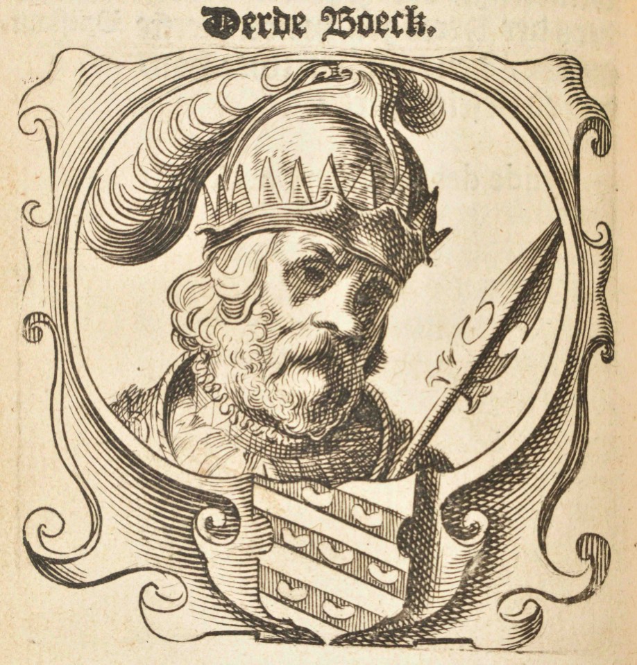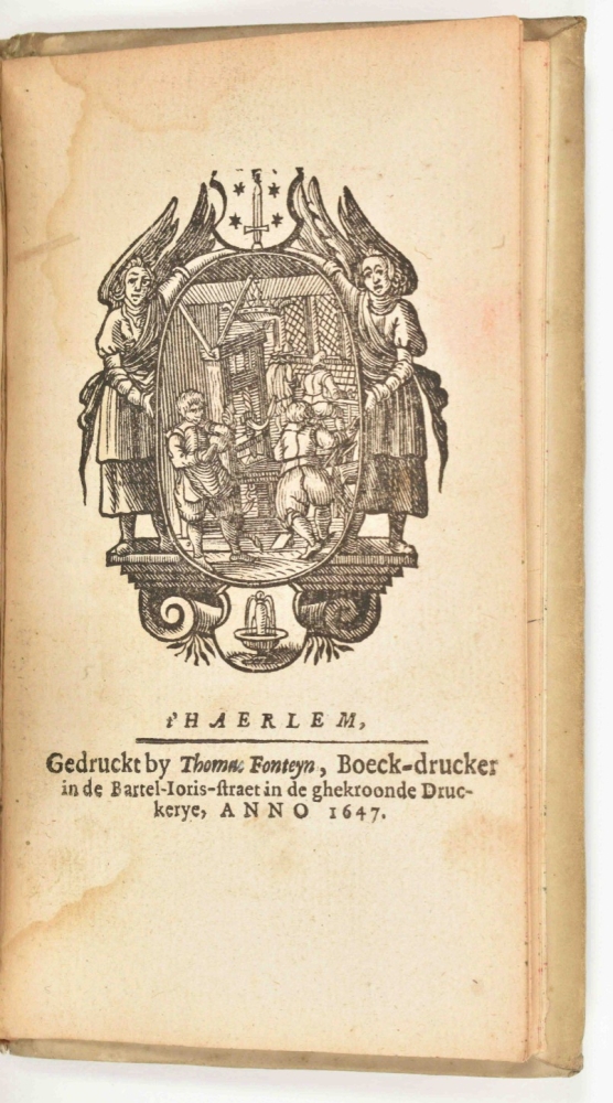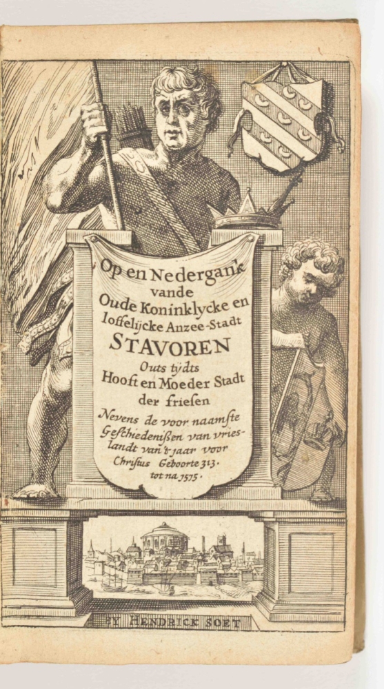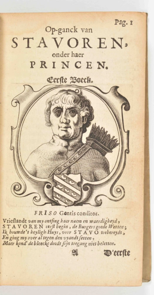 In VI Boecken verdeelt. Op en Nedergank vande oude Koninklycke en loffelijcke Anzee-Stadt Stavoren (...). Haarlem, Thomas Fonteyn, 1647. 6 books in 1 vol. 328p. 16vo. Contemp. vellum binding over boards, manuscript title on spine, ex-libris on front pastedown w. motto 'Grypt als trypt', printer's mark on last printed page, sm. copperplate portrait engr. throughout, flower pressed into book, multiple types, incl. Gothic and Italics.
