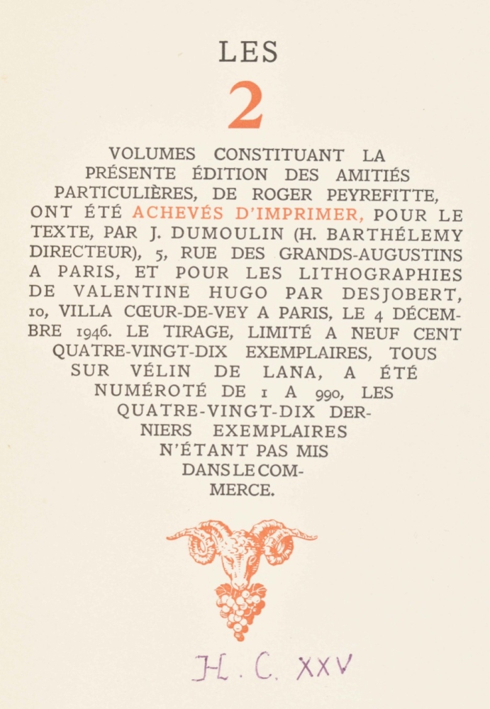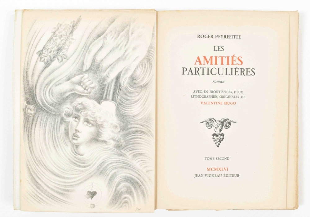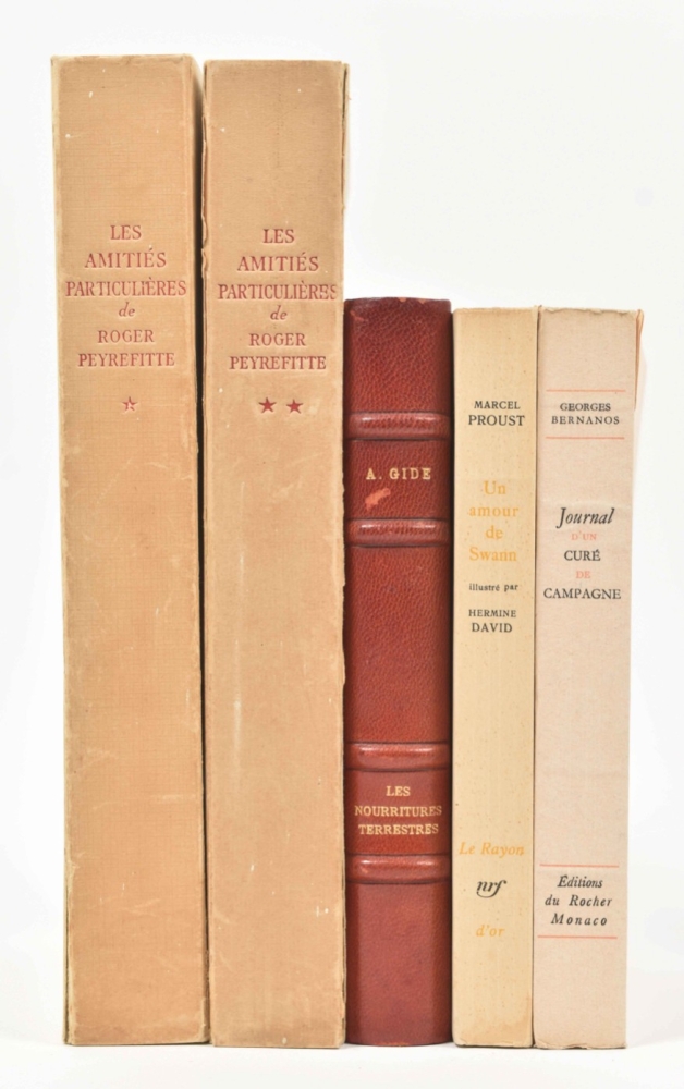(2) André Gide. Les nourritures terrestres. Avec douze aquarelles de Raoul Dufy. Paris, Le rayon d'or, 1950. Hcalf. (3) Roger Peyrefitte. Les amitiés particulières. Avec, en frontispieces, deux lithographes original de Valentine Hugo. Paris, Jean Vigneau, 1946. 2 vols. Sm. folio. Loose quires in cardboard wr. as issued. -and 1 more. All lim. eds. and in fair to good condition. (total 5)