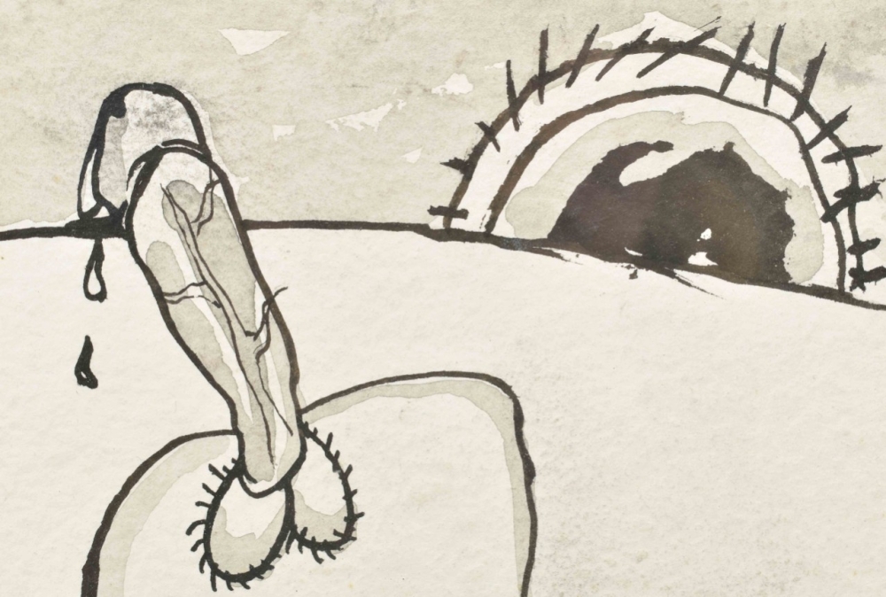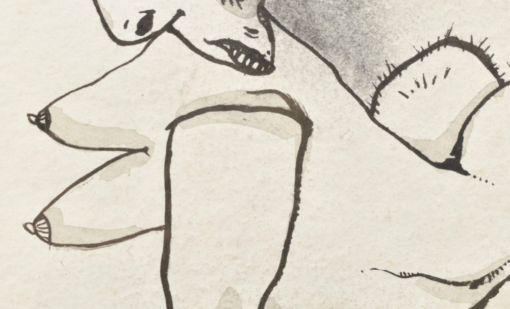 Female figure with fallus, 1972. Indian ink and watercolour on thick paper. Signed and dated in pencil r.b. 33 x 23 cm. In passe-partout, under glass.