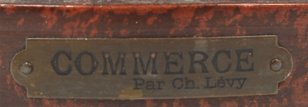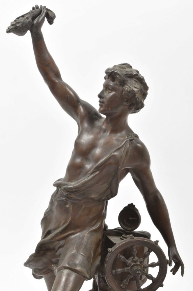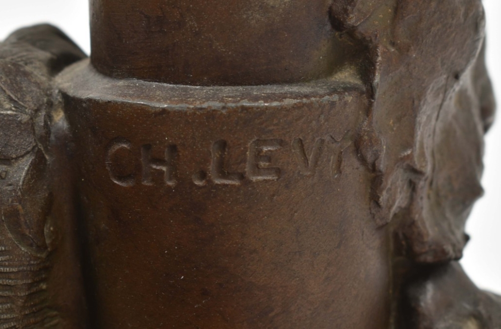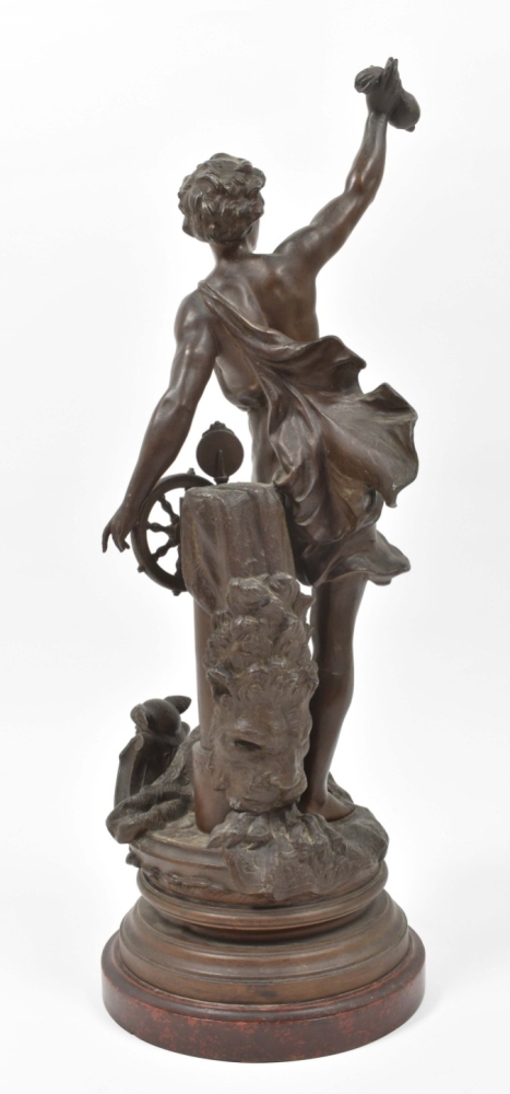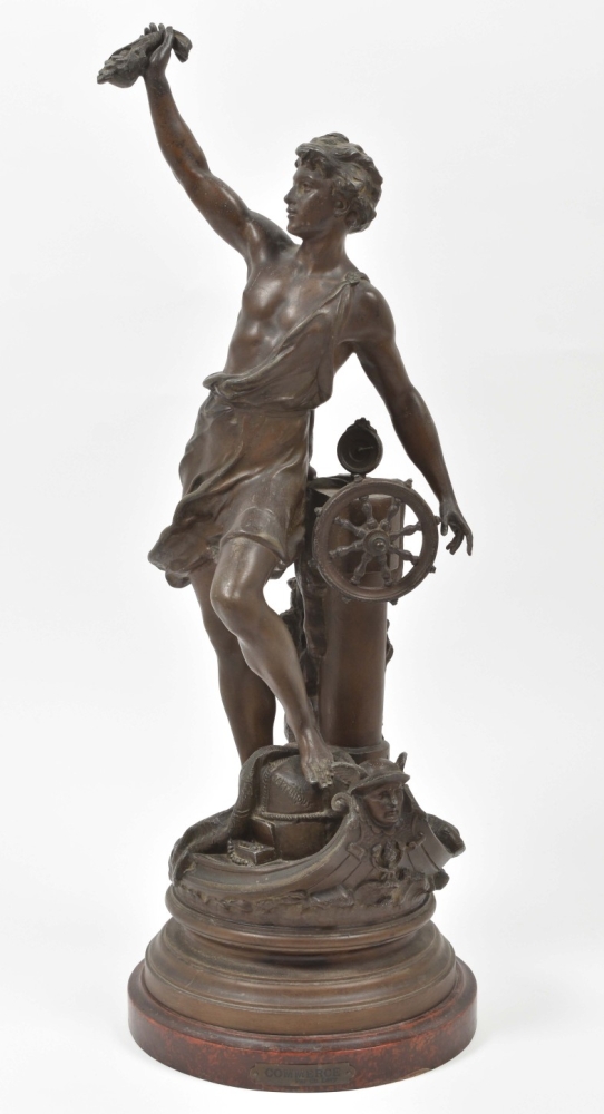 Bronzed metal alloy sculpture, height incl. orig wooden base w. title-shield 67 cm., signed "Ch. Levy" in the base of the column with the ship's steering wheel.