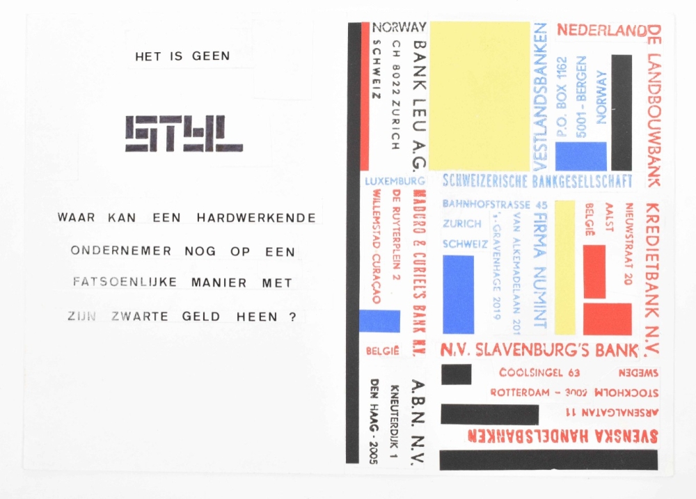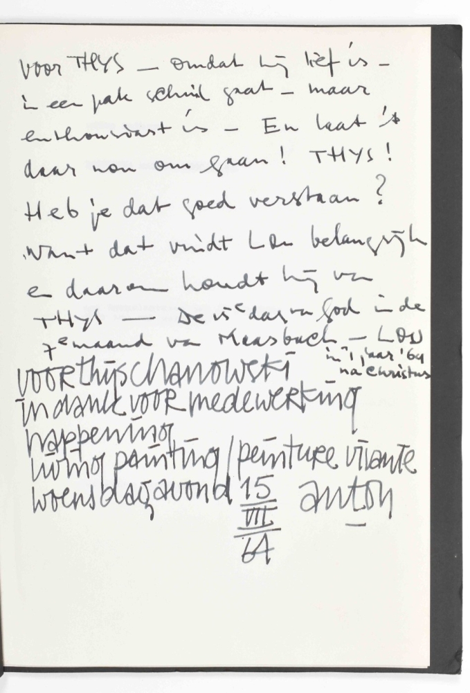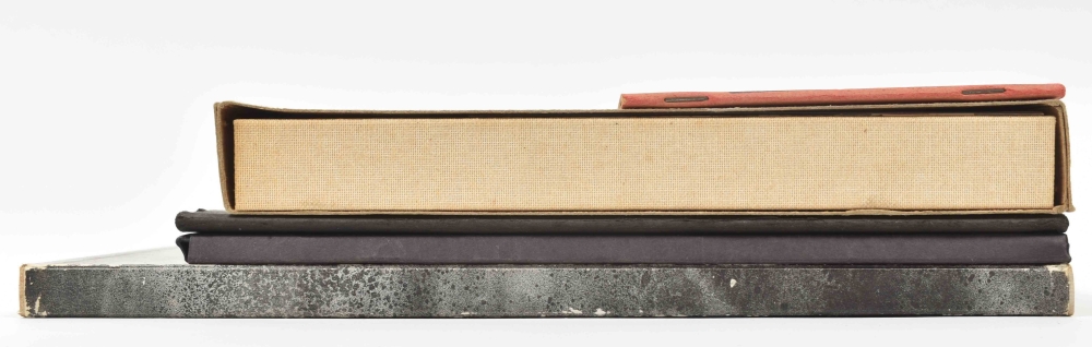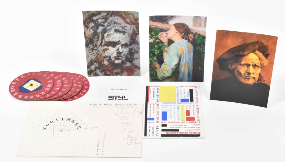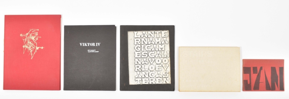 With extensive manuscript dedication signed "Anton", to Thijs Chanowski "in dank voor medewerking happening living painting/ peinture vivante woensdagavond 15/ VII/ 64". Anton Kothuys (Kothuis) (1935-2007) was a cinematographer, Louis van Gasteren (1922-2016) was a director and Thijs Chanowski (1930-2017) was a television producer and director. (2) Rein Jansma. Stairs. Production Joost Elffers. N. pl., n. publ., 1982, pop-up book with ten plates depicting stairs, orig. cl., 25.5 x 19 cm, together with textleaf, booklet "De reiziger en de cartograaf" by Jaap Goudsmit and vinyl single with the composition "Circles" by Philp Glass, in board slipcase. Spine a bit faded. Slipcase with fold along the back. (3) Johnny Friedlaender. Oeuvre 1961-1965. Published by Roland Hanßel. New York/ Stuttg., Touchstone/ Manus Presse, n.d., one of 200 numb. copies with orig. signed lithograph and orig. signed col. etching loosely inserted (this copy numbered 104), 76, (4) p., richly illustrated (incl. tipped-in col. plates), orig. gilt cl., folio, in board slipcase. Cl. sl. faded/ stained; paper detaching from spine. (4) Leonel. Jan. Geluid en tekeningen door Leonel. Holland, privately published, October 1971, printed in 100 copies, 14 lvs. printed with illustrated text on 1 side only, orig. stapled wr., obl. sm. 8vo (spine faded). And 4 others, incl. orig. material of the project "Nooit meer zeker weten" by Anne van Priel (1994). (total 8)