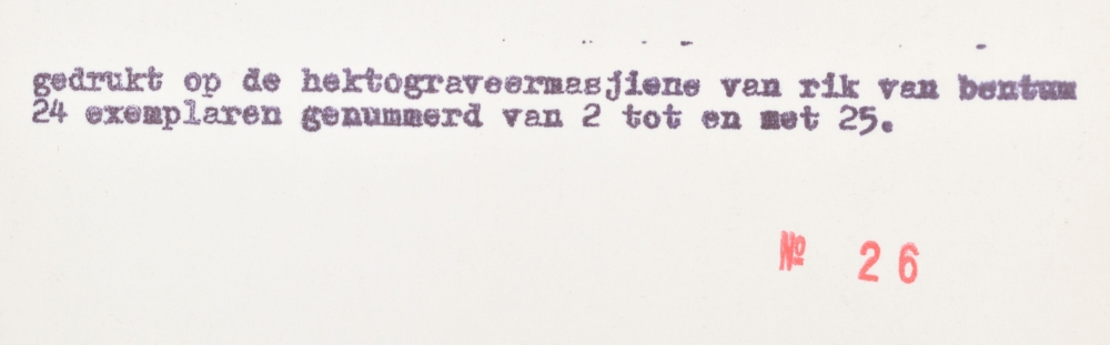 Een toverlantaarn met 24 plaatjes voor Lou van Gasteren. Amst., "maart april mei 1964", privately published in 24 stencilled ("gedrukt op de hektograveermasjiene van Rik van Bentum") numb. copies (this copy numbered 26 [sic]), (50) p. printed w. text and w. 24 sets of 2 ills. on 1 side only, orig. stapled wr. w. mounted xeroxed title on front, 28 x 23 cm.