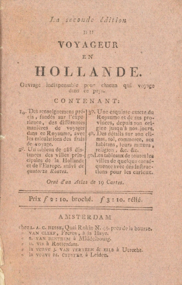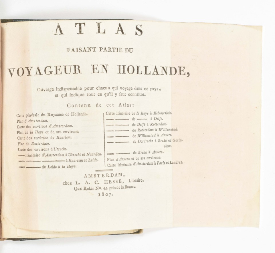 The 1st ed. appeared at Hesse in 1804, with only 1 map. This 2nd ed. is expanded with an "Atlas faisant partie du Voyageur en Hollande" w. separate fold. title page w. address of Hesse. Extremely rare and very nice travel guide.
