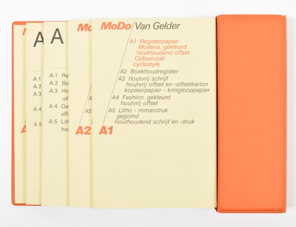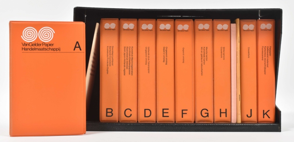 Set of 10 folders containing a "Monster collectie". Paper samples such as Manilla karton, Doorslag-Luchtpost, Hollands druk and Simili Japnon. Ca. 1975. In orig. plastic case, 24 x 40.5 x 17 cm.