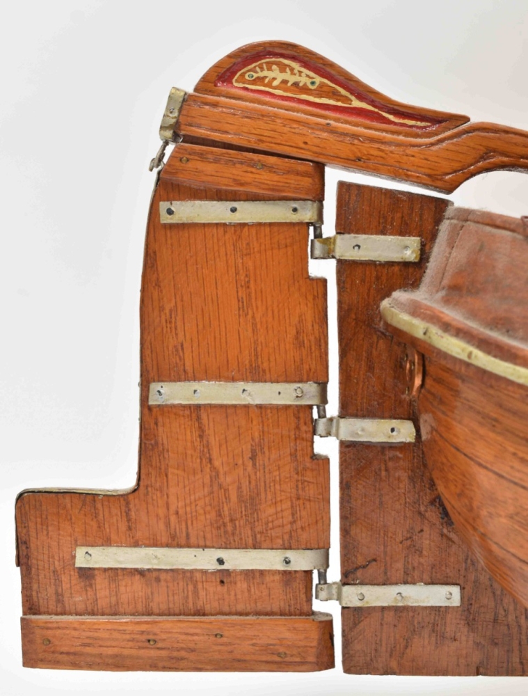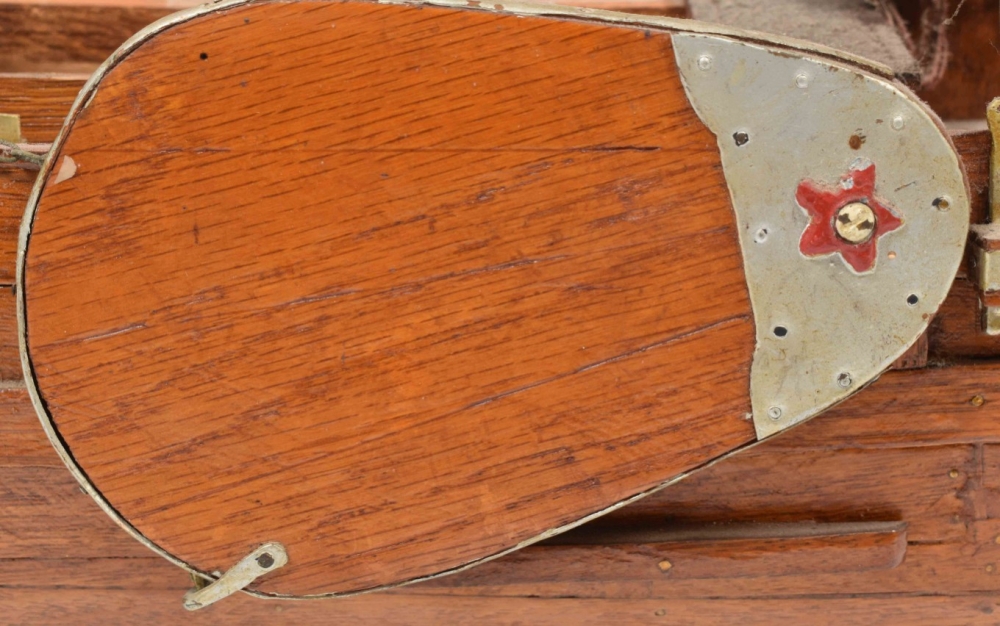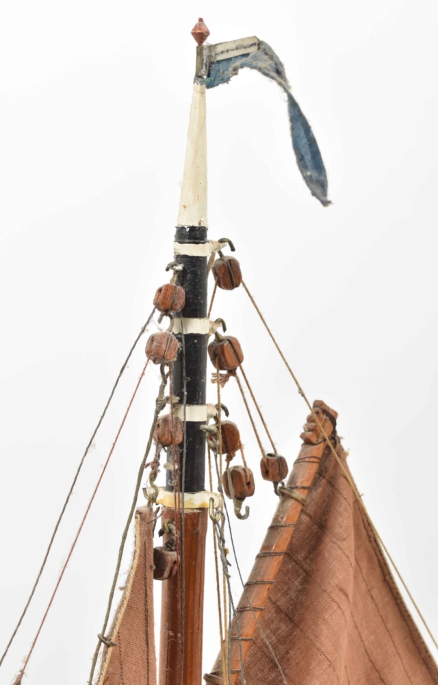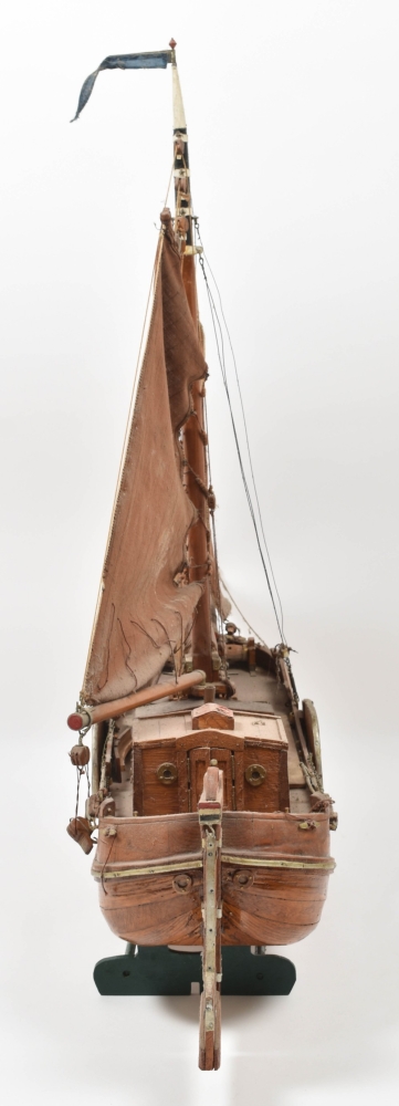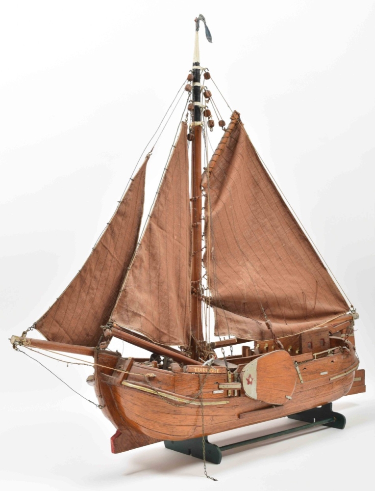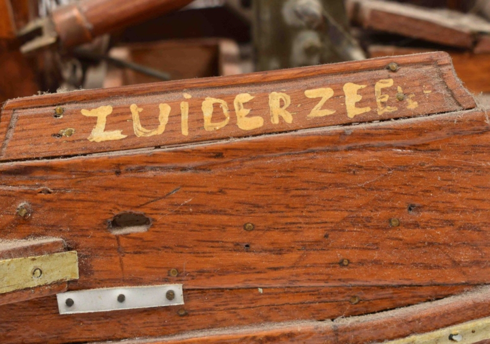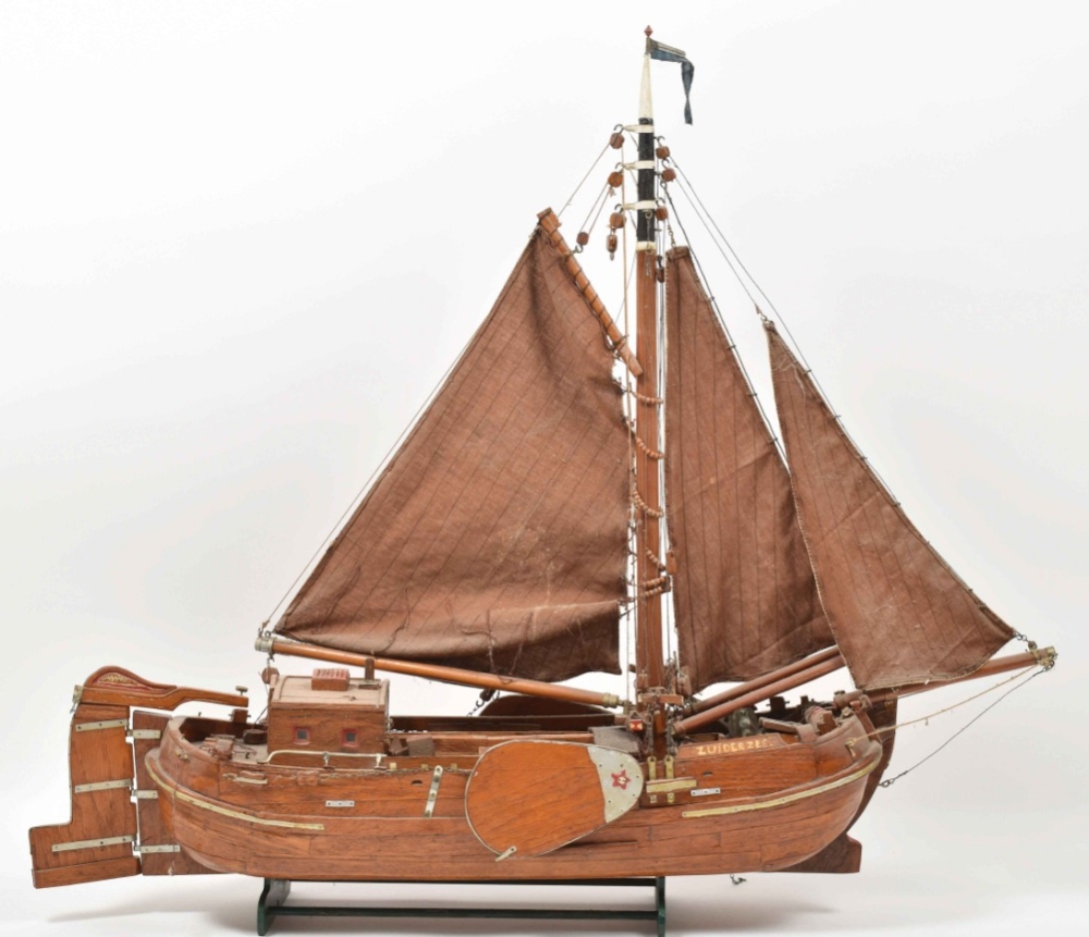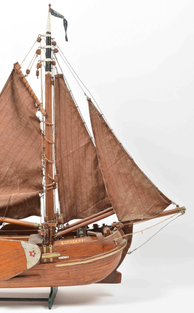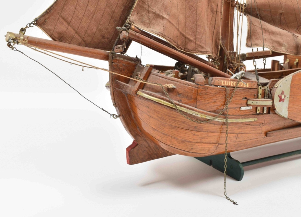 A traditional flat-bottomed Dutch sailboat named "Zuiderzee", ca. 1900. Oak, w. a pair of large leeboards on each side of the hull and rudder w. small painted dec. and Dutch flag, copper and other metal details, dark brown sailcloth. Length 99 cm (from bow to stern), height 83 cm (including mast).