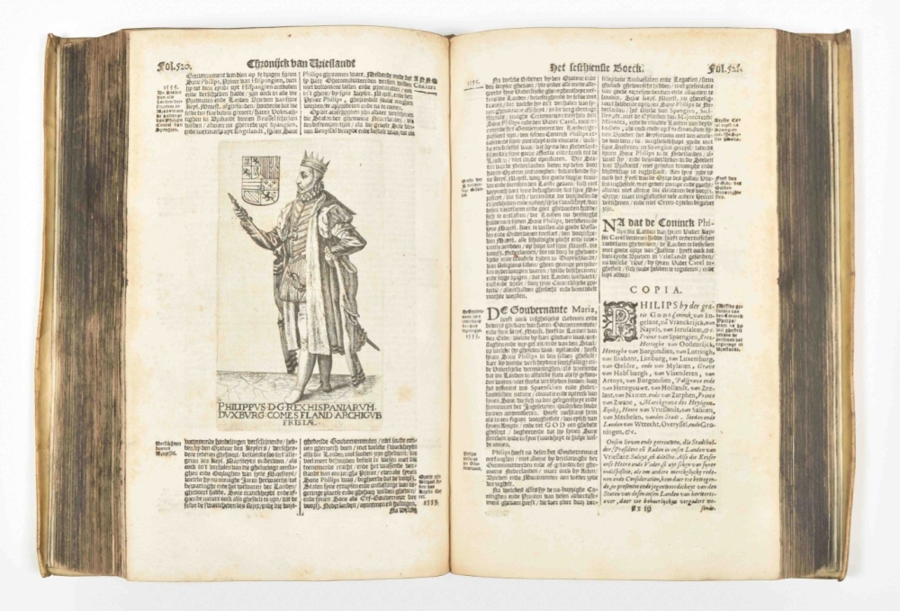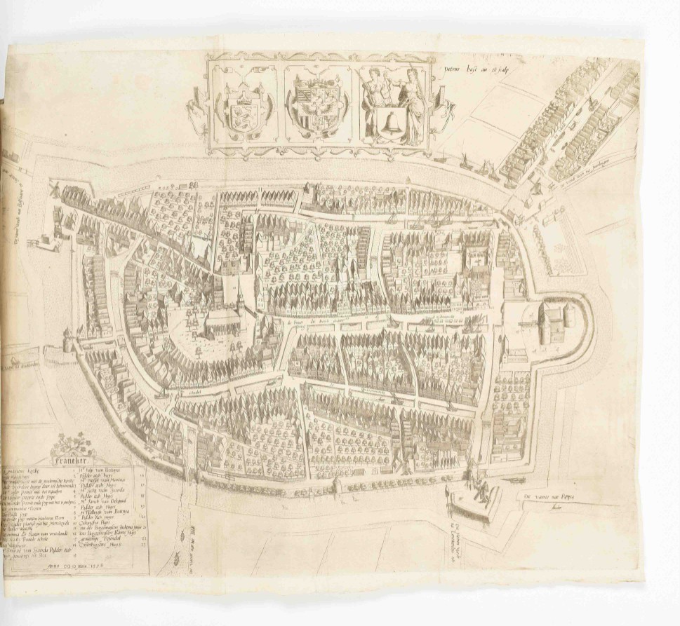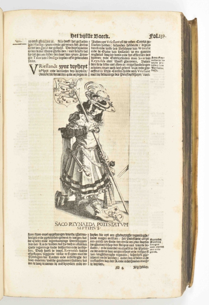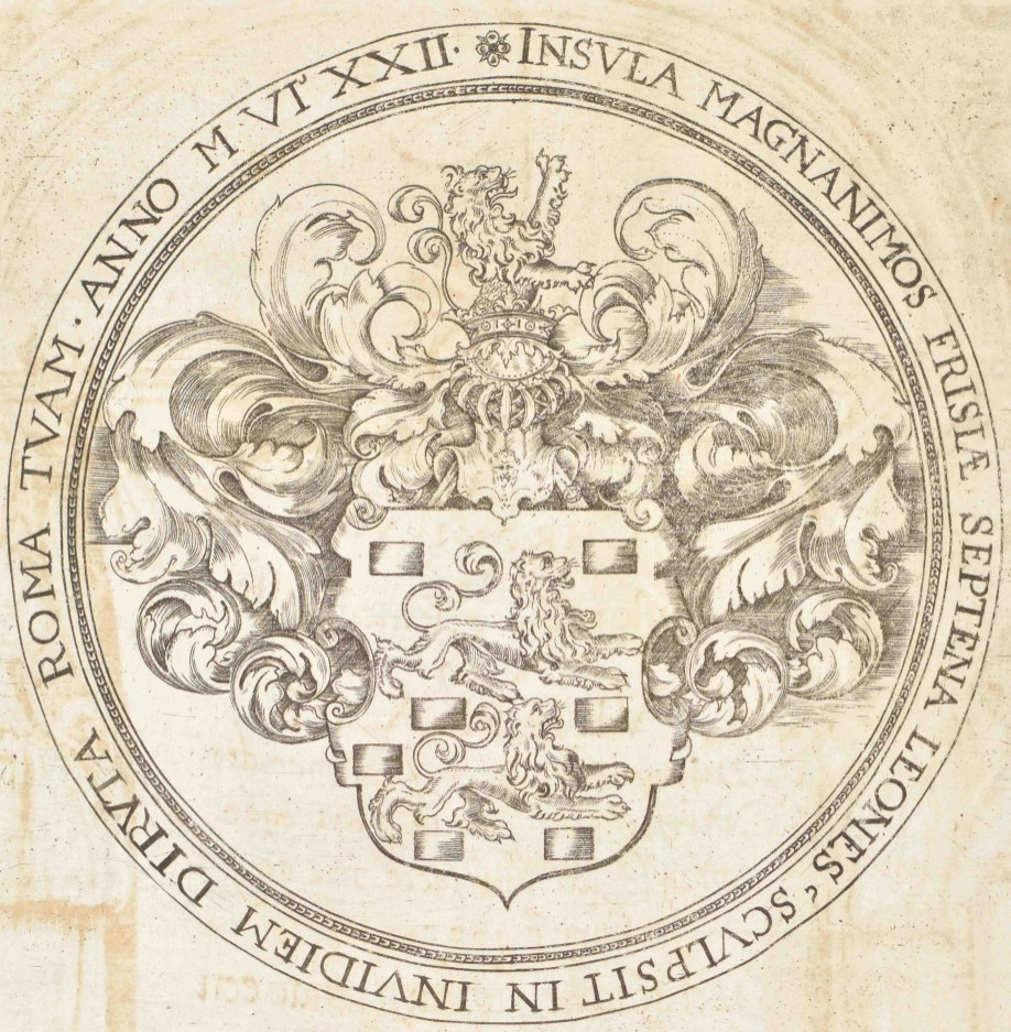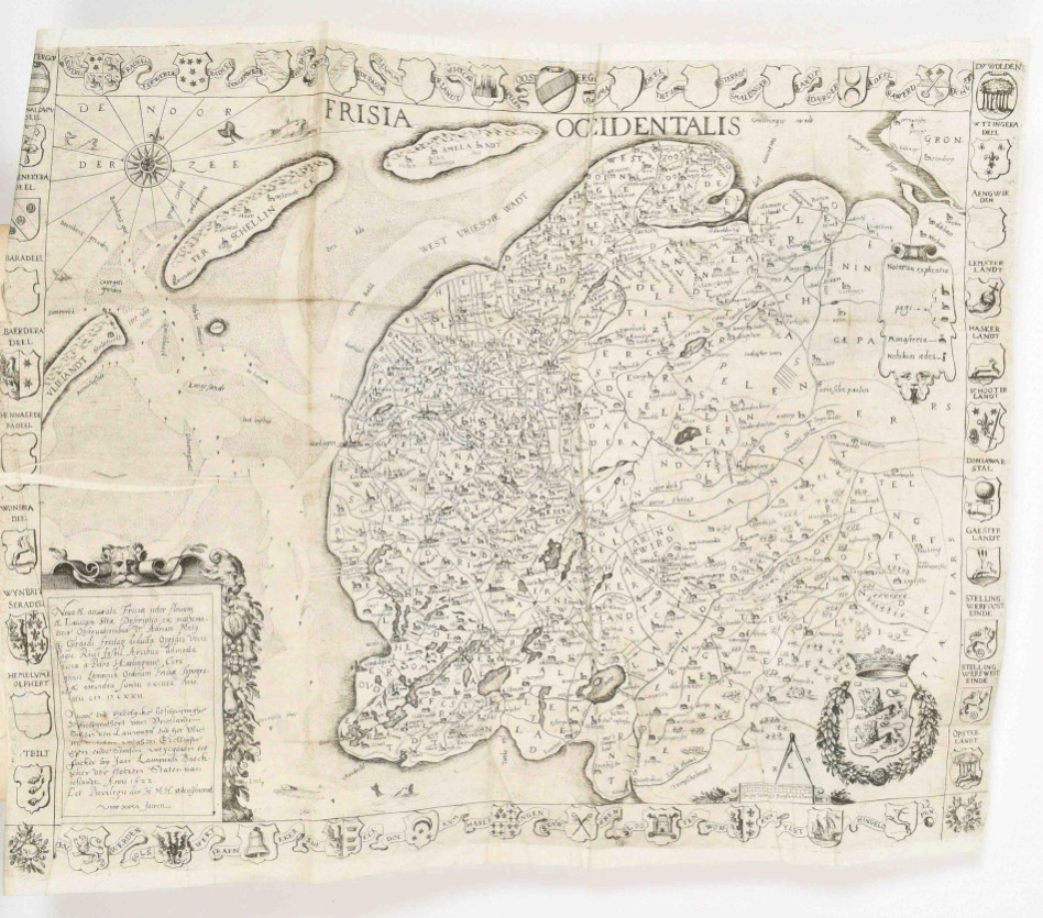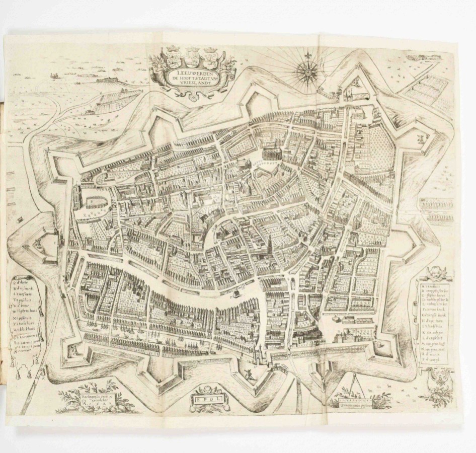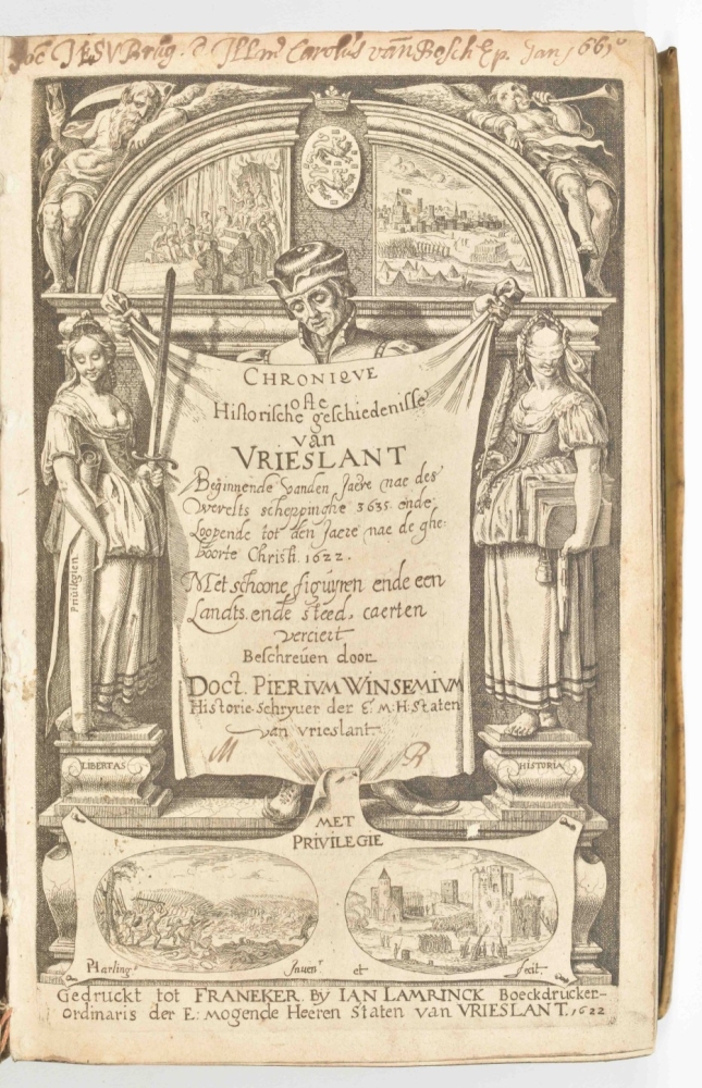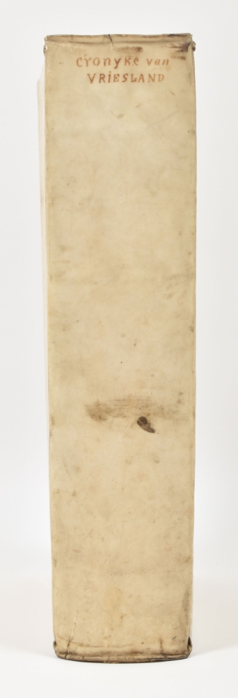 van Vrieslant, beginnende vanden Jaere nae des Werelts scheppinghe 3635 ende loopende tot den Jaere nae de gheboorte Christi 1622. Franeker, J. Lamrinck, 1622. (12),913,(61) p. 1st ed. Vellum, engr. allegorical title, large fold. map surrounded by coats of arms of the Frisian towns and districts by A. Metius and G. Freitag, engr. by Pieter van Harlingen, fold. plan of Franeker by Pieter Bast and a folded plan of Leeuwarden by P. van Harlingen, num. portraits and ills. incl. sieges of Franeker and Leeuwarden.