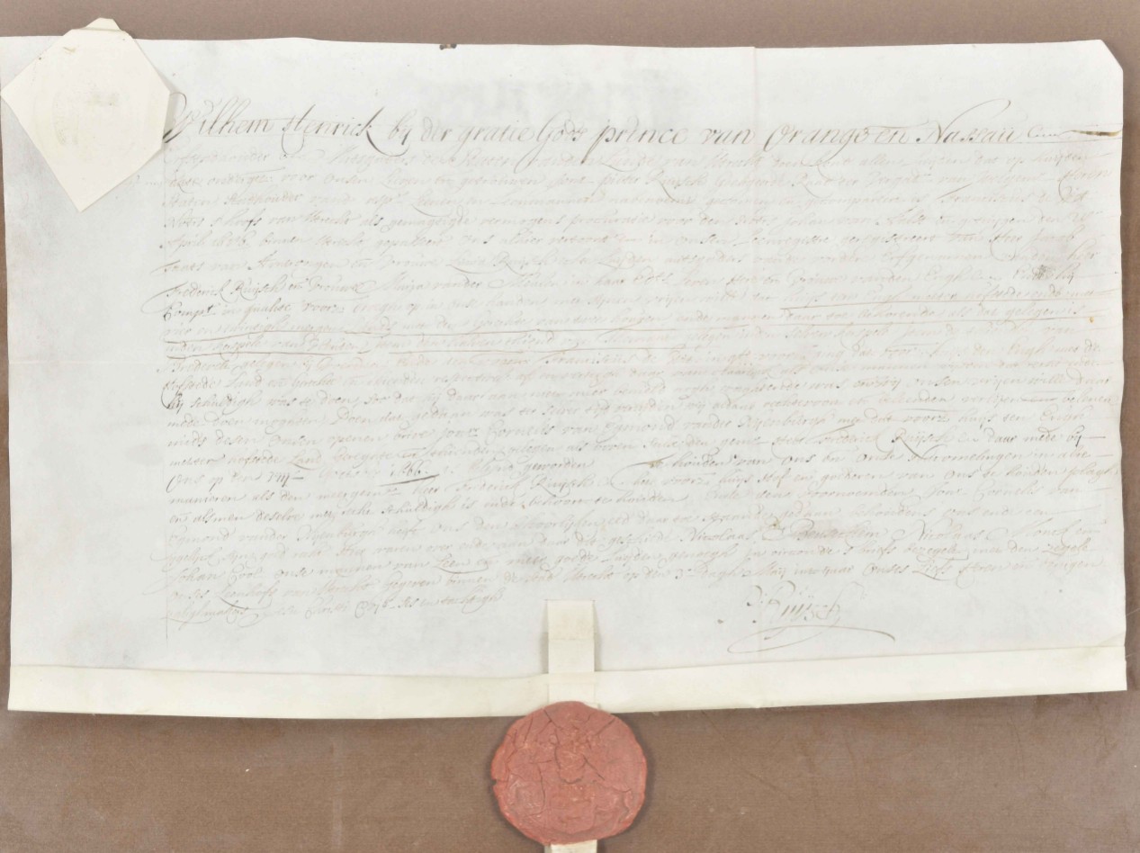 "Wilhelm Henrick (...) prince van Orange en Nassau (...) mitgaders de Staten vanden Lande van Utrecht doen kond (...) Johr. Pieter Ruijsch Geeligeerde Raad der Vergad.(...) resp. leenen en leenmannen nabenoemt gecomen en gecompareert is Franciscus de Wit (...) gemagtigde (...) voor (...) Johan van Aelst en getuijgen (...) dat Huys ten Enghmetter hofstede ende metter vier twintigh mergen lands (...) inden karspele van Vleuten (...) van Thernaat (...) Bredevelt gelegen bij Woerden (...) verlijen en belenen midts desen onsen openen brive Jonkr. Cornelis van Egmond van der Nijenburgh (...) in oirconde 's briefs bezegelt met den zegele van onses leenhofs van Utrecht (...)."