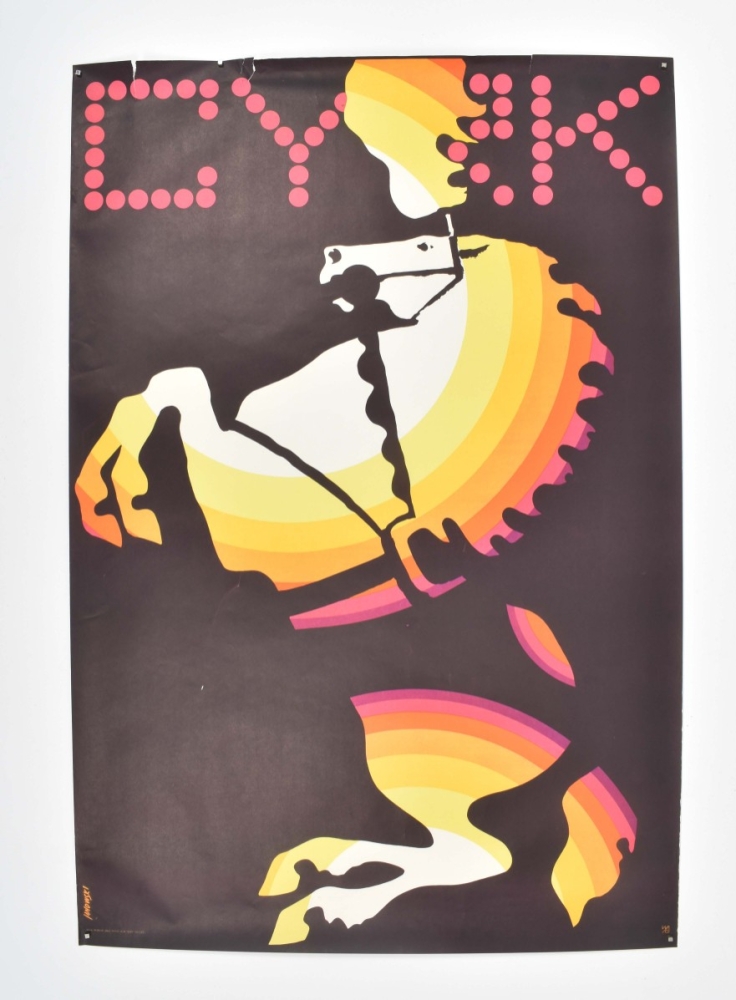 (1) Prancing horse. Poland, 1969. Lithograph, ca. 68 x 99 cm. Small tears along top edge. (2) Woman swinging, ca. 1973. 68 x 99 cm. Small pinmarks in corners, mild wear to edges. (3) Two headed woman, 1974. 66.5 x 98 cm. (4) Clown on skates, 1968. ca. 66 x 98 cm. Small pinmarks in corners, edges with occ. small tear.