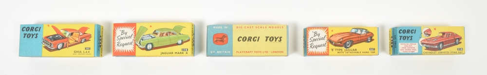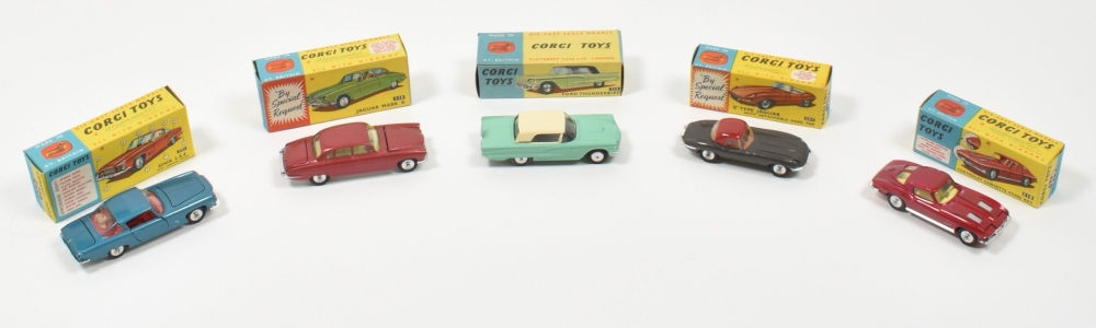 No. 307. Die-cast scale model. Corgi, ca. 1964. Scale 1: 43. In box in mint condition. (2) GHIA L. 6.4. No. 241. (3) Ford Thunderbird no. 214. (4) Chevrolet Corvette Sting Ray no. 310 and (5) Jaguar Mark X. No. 238.