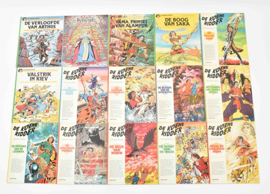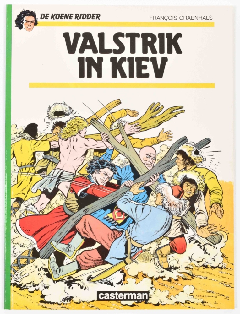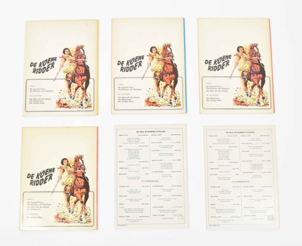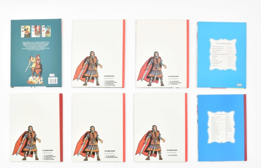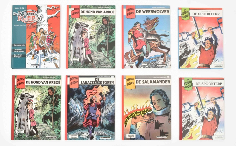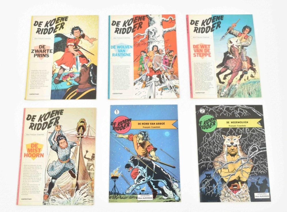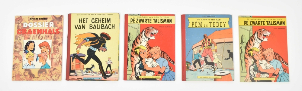 Lombard Collectie, 1956. Fair copy, cover sl. dam. in image with (amat.) rest. and corners. With: (2) De Zwarte Talisman. Lombard, 1958. Fair copy, with dam. and rest. to edges and book-block. Ex-library stamp removed. (3) Het Geheim van Balibach. Book block re-attached, name on title-p. in pen, else good copy. All incl. Kuifjepunt. (4) Koene Ridder vol. 1-17, 19 and 20, sc., first ed. (5) Paul Rijperman 9x sc., 7x hc. (6) Kris de Saeger. Dossier Craenhals. Arboris, hc., 1990. (7) De avonturen van Pom en Teddy. De Zwarte Talisman. Lombard sc. Name on title p. in pen, else fine copy, including inlay 'De Craenhals Fanclub'. Added: (7) De Koene Ridder. Valstrik in Kiev. Casterman, 1985. With dédicace by Craenhals on verso cover in pencil.
