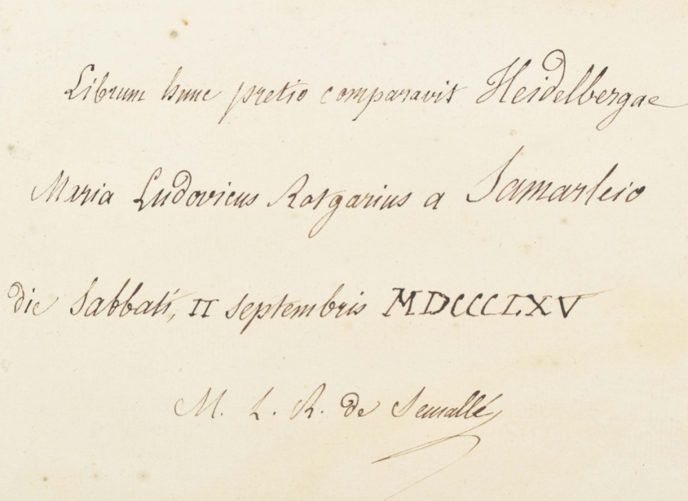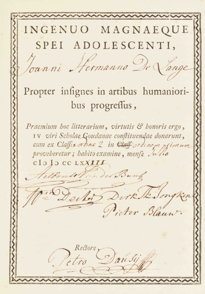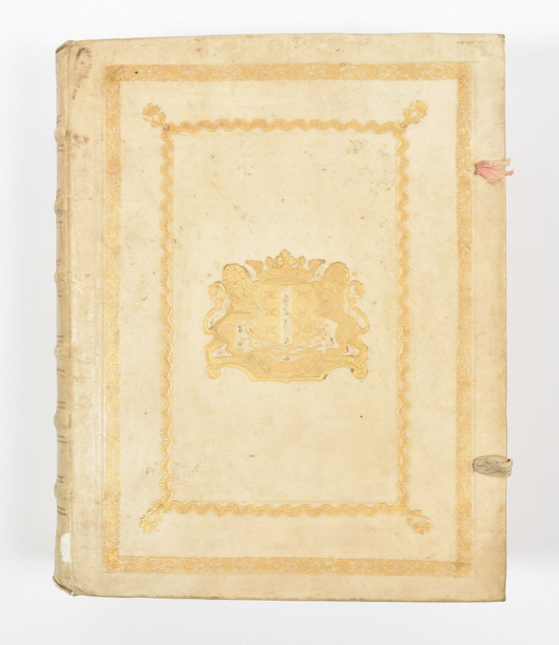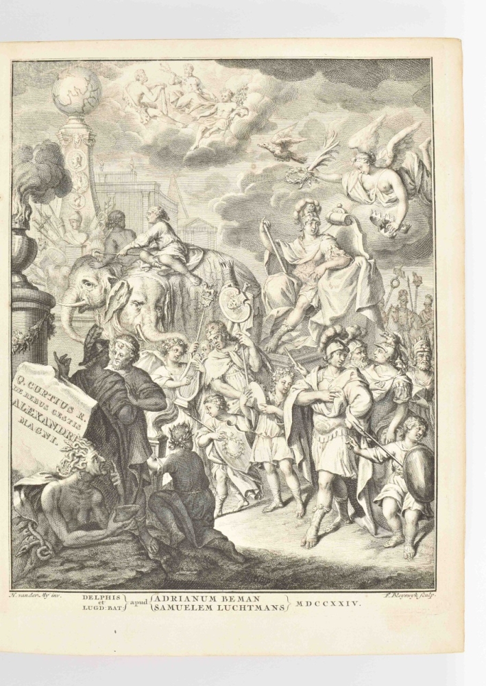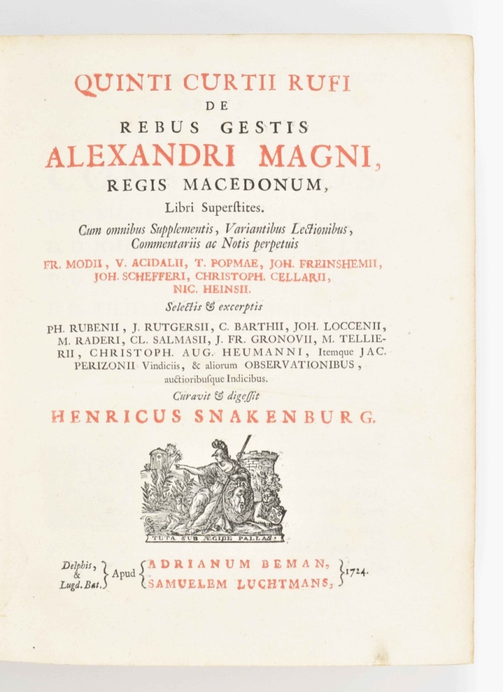 regis Macedonum, libri superstites. Cum omnibus supplementis, variantibus lectionibus, commentariis ac notis perpetuis Fr. Modii (...). Curavit & digessit Henricus Snakenburg. Delft/ Leyden, A. Beman/ S. Luchtmans, 1724. (74),824,(223) p. 4to. W. engr. frontisp., fold. map, 17 engr. plates (2 fold.), contemp. gilt vellum w. remnants of ties, both covers w. central coat of arms of Gouda, w. 2 gilt borders, corner fleurons, gilt and ribbed spine, 2 bookplates, 1 awarding the book to Joannes Hermannus de Lange (1773) and 1 of Maria Ludovicus Rotgarius a Samartini.