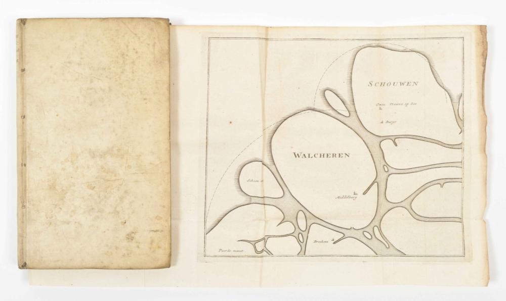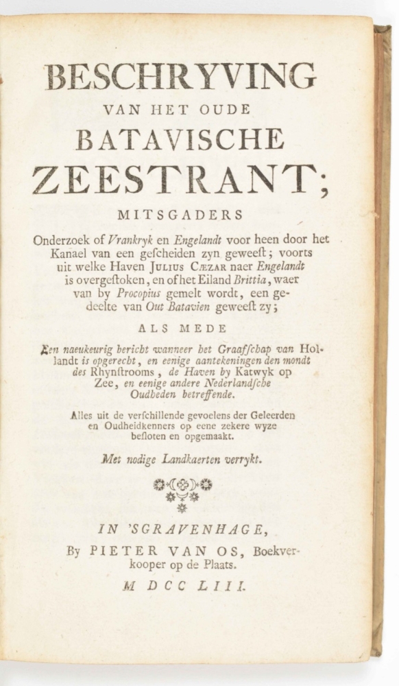 het oude Batavische zeestrant mitsgaders Onderzoek of Vrankryk en Engelandt voor heen door het Kanael van een gescheiden zyn geweest (...). Gravenhage, Pieter van Os, 1753. (12),141,(5) p. Contemp. vellum over boards w. manuscript titles on spine, 2 fold. engr. maps at end of text. Sl. foxing, some sm. stains on the binding, otherwise in excellent condition.