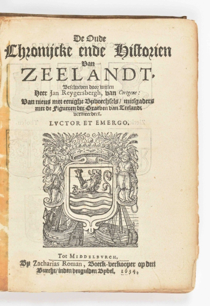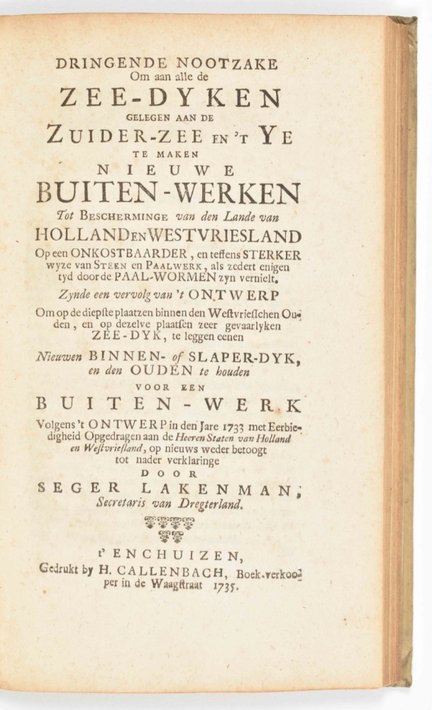 Bound w.: (2) Seger Lakenman (1687-ca. 1760). Dringende nootzake om aan alle zee-dyken gelegen aan de zuider-zee en 't ye te maken nieuwe buiten-werken (...). Enchuizen, H. Callenbach, 1735. (12),54 p. Bound w.: (3) Serger Lakenman. Ontwerp van een onkostbaar en zeker middel om de westervriesche zeedyken, door het afknagen van 't paalwerk (...). Amst., J. Ratelband, 1733. (6),38,(4) p. Lacking orig. title-p. and 2 engr. plates, but work is followed by 2 unidentified engr. foldouts on the topic of dyke construction. This work is the 1st and only ed. of a brief treatise by Lakenman on reinforcing the dikes of West Friesland. The dikes were dangerously weakened because "sea worms" were voraciously eating their wooden piles. Bound w.: (4) Pieter Straat and Pieter van der Deure. Ontwerp tot een minst kostbaare zeekerste en schielykste herstelling van de zorgelyke toestand der westerfriesche zeedyken zonder dat het voortknagend zeegewormte (...). Amst., Johannes Oosterwyk, 1735. 62 p. Incl. Nader ontwerp hoe men de dyken (...). 2 engr. plates. Added: (5) Jan Reygersbergh. De oude chronijcke ende historien van Zeelandt. Middelburch, Zacharias Roman, 1634. (20),348,(8) p. Contemp. vellum over boards w. manuscript title on spine, woodcut coat of arms of Zeeland on title-p., woodcut printer's device on last p., and over 50 woodcuts in the text (city arms and portraits). Spine dam., some p. loose, sl. foxing, edges worn. Important chronicle of the history of Zeeland, printed in Gothic type. (total 5 works bound in 2 books)