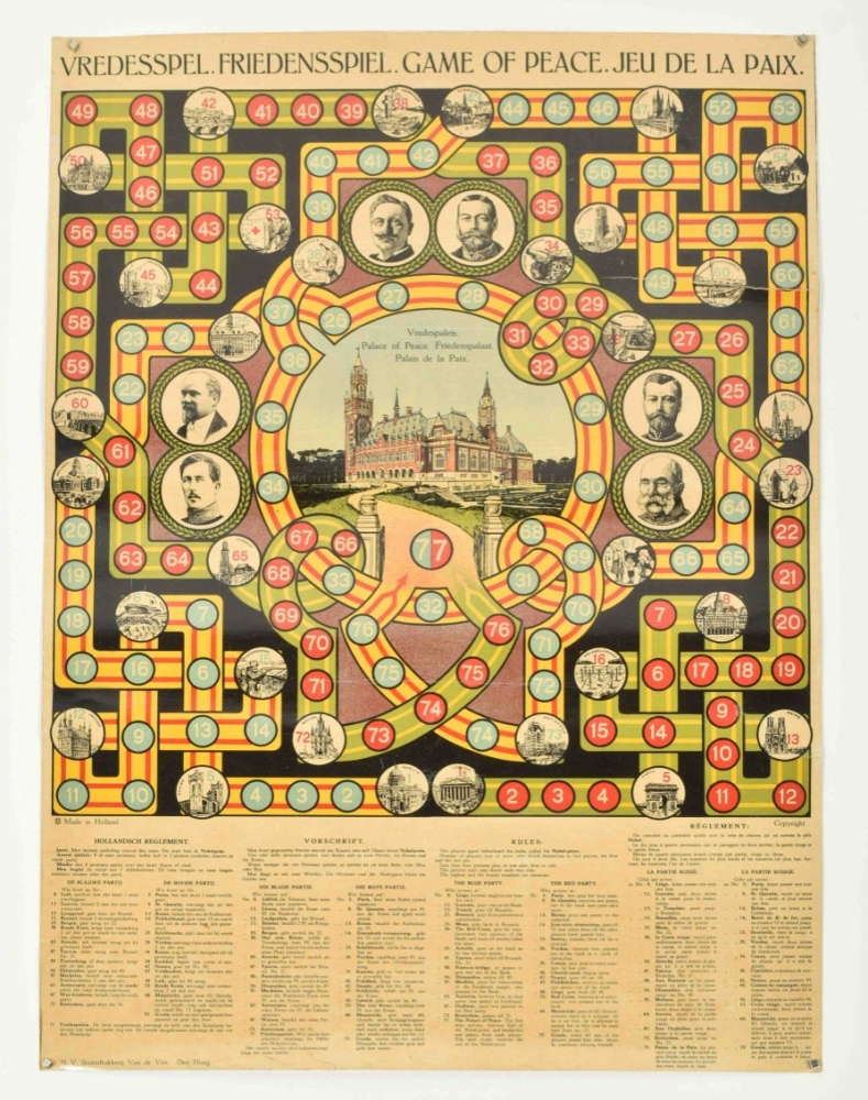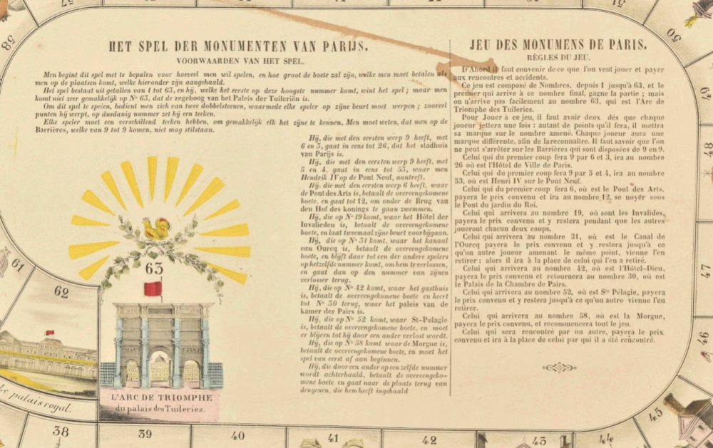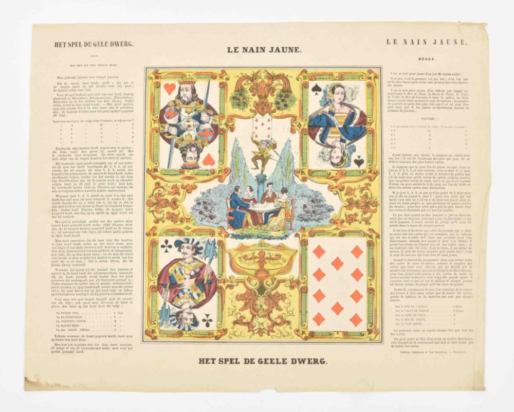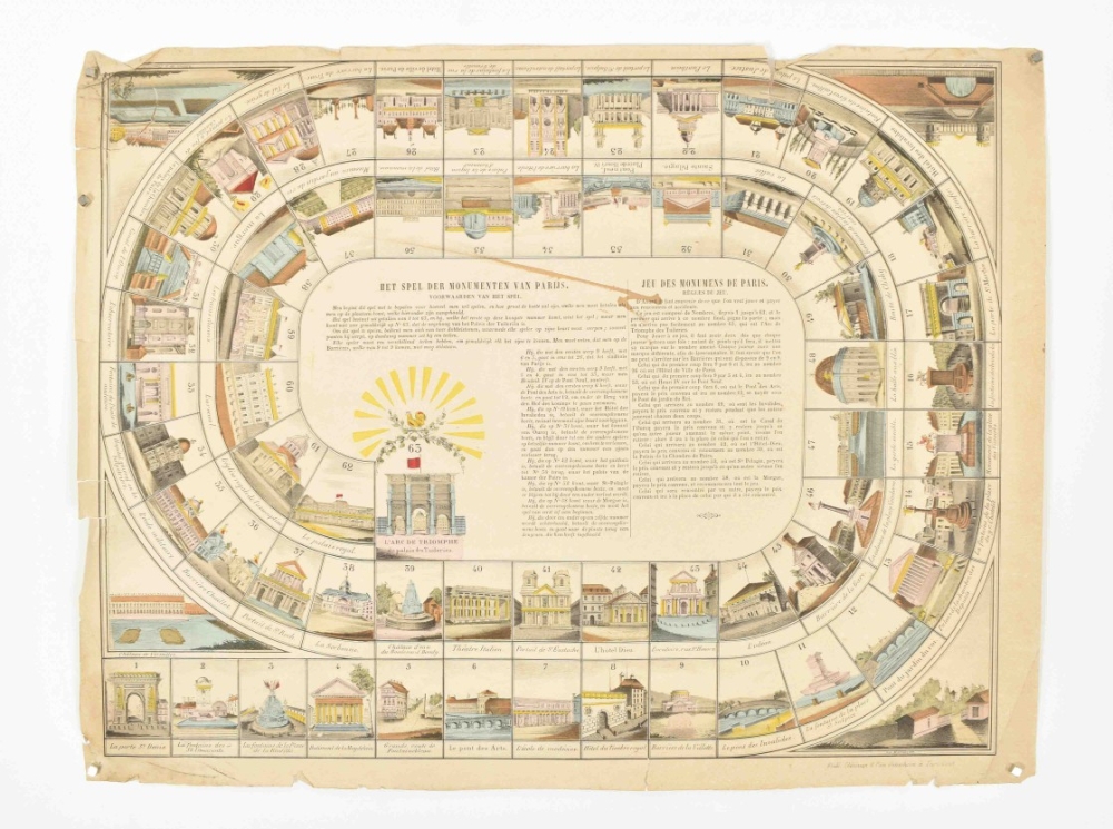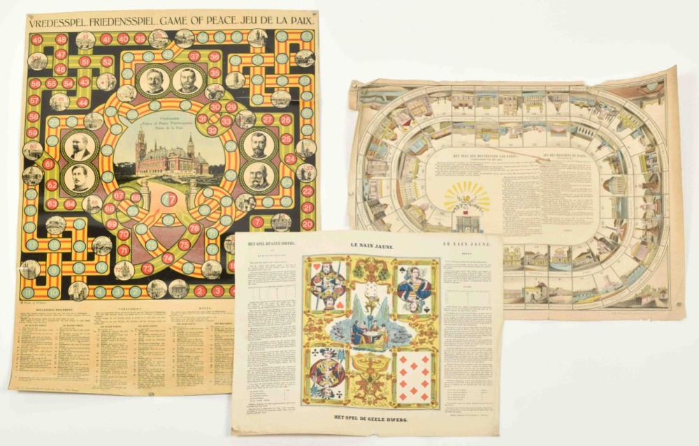 Jeu des monumens de Paris. Circular board-game track showing all the famous Paris monuments such as the Pont des Arts, L'Odéon and Le Panthéon. Col. lithography. Tournai, Etablissement de Glenisson et Van Genechten, ca. 1830. 54 x 41 cm. Edges with some tears. (2) Vredesspel. Friedensspiel. Game of Piece. Jeux de la Paix. Col. lith. Den Haag, N.V. Steendrukkerij Van de Ven, ca. 1915. Board game along First World War monuments ending with the Palace of Peace in the centre. Tear in upper part, reinf. on verso with sellotape. (3) Le Naine Jaune. Het spel de geele dwerg. Col. lith. with printed card game rules. Tournai, Etablissement de Glenisson et Van Genechten, ca. 1830. 42 x 34. Occ. wear along the edges.