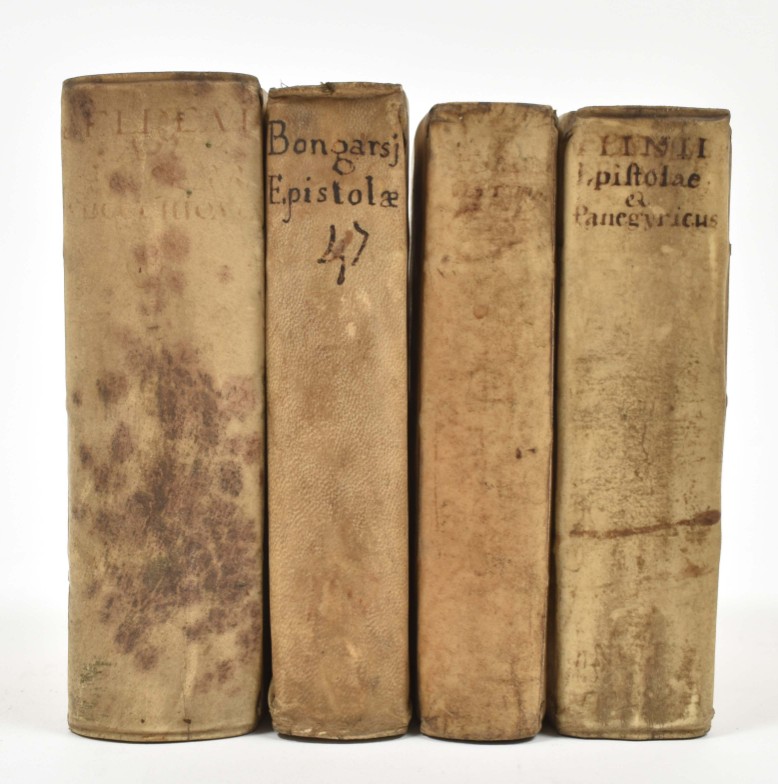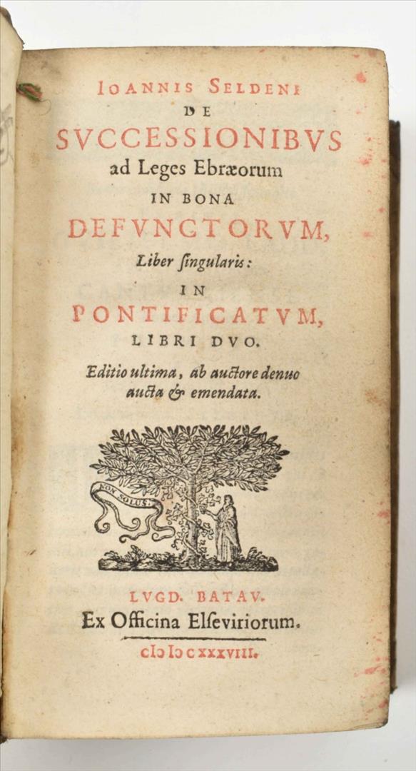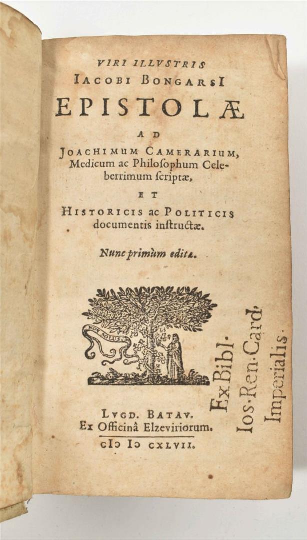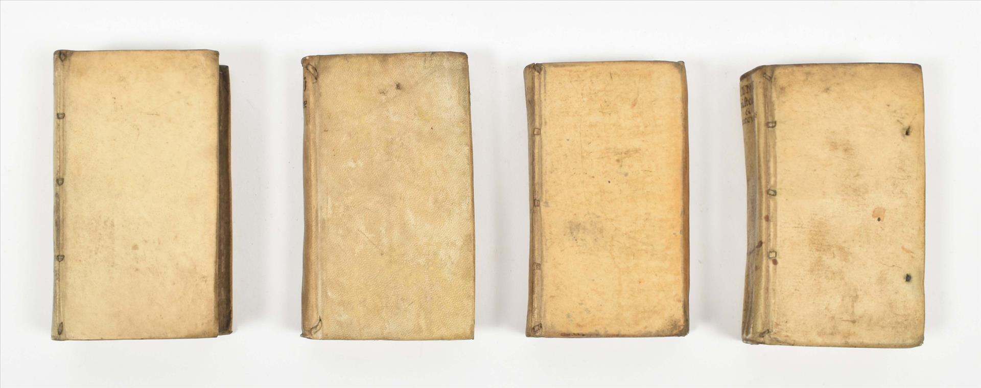 (2) Viri Illustris Jacobi Bongarsi. Epistolae ad Joachimum Camerarium, Medicum ac Philosophum Celeberrimum scriptae (...). Ibid., idem, 1647. (12),444 p. 16mo. Vellum, manuscript title on spine, title w. vignette, marginalia, stamp on title-p. (3) C. Sallustius Crispus cum veterum Historicum fragmentis. Ibid., idem, 1634. (16),310,(34) p. 16mo. Overlapping vellum, ill. title-p., wood engr. portrait of author. (4) Joannes Seldeni. De Successionibus ad Leges Egraeorum in bona defunctorum (...). Ibid., idem, 1638. (54),428 p. 16mo. Vellum, title in red and black w. vignette. All copies show much use. (total 4)