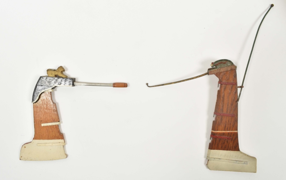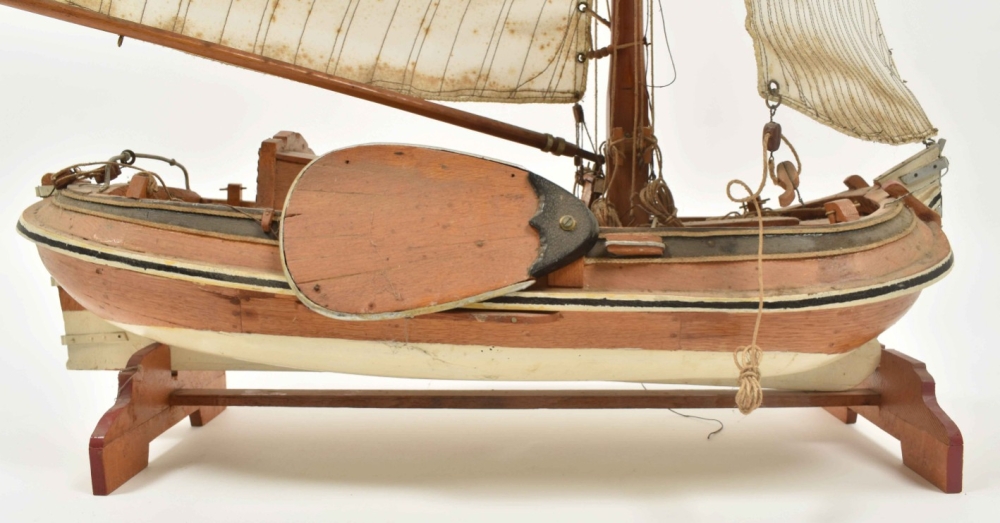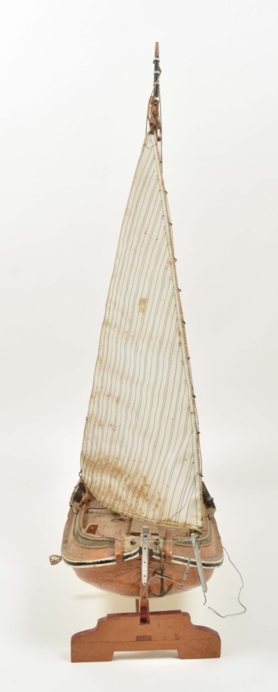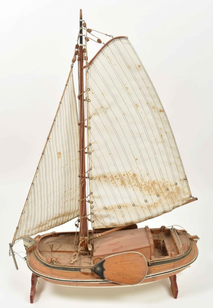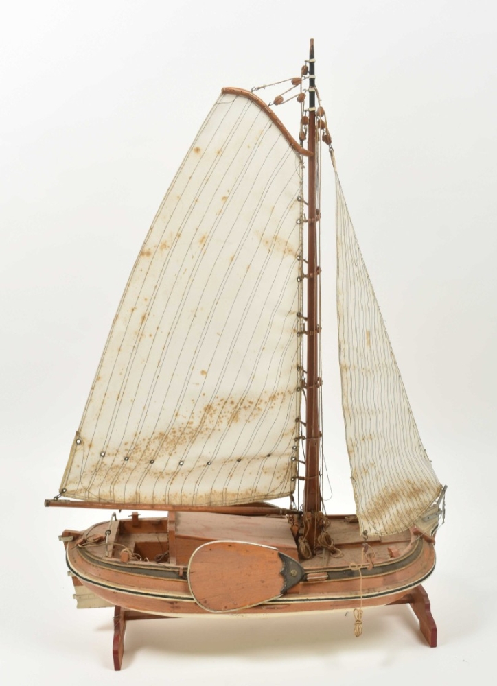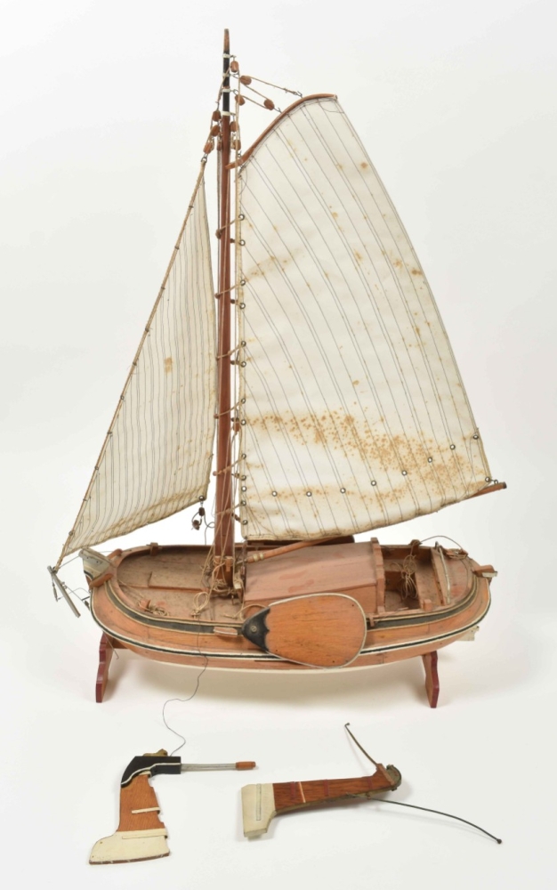 Hand-painted wooden model ship. Both sails in tact, some parts broken. Fragile. Measures approx. 69 x 23 x 88 cm.