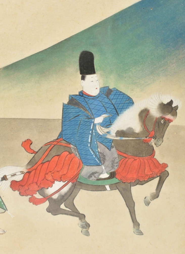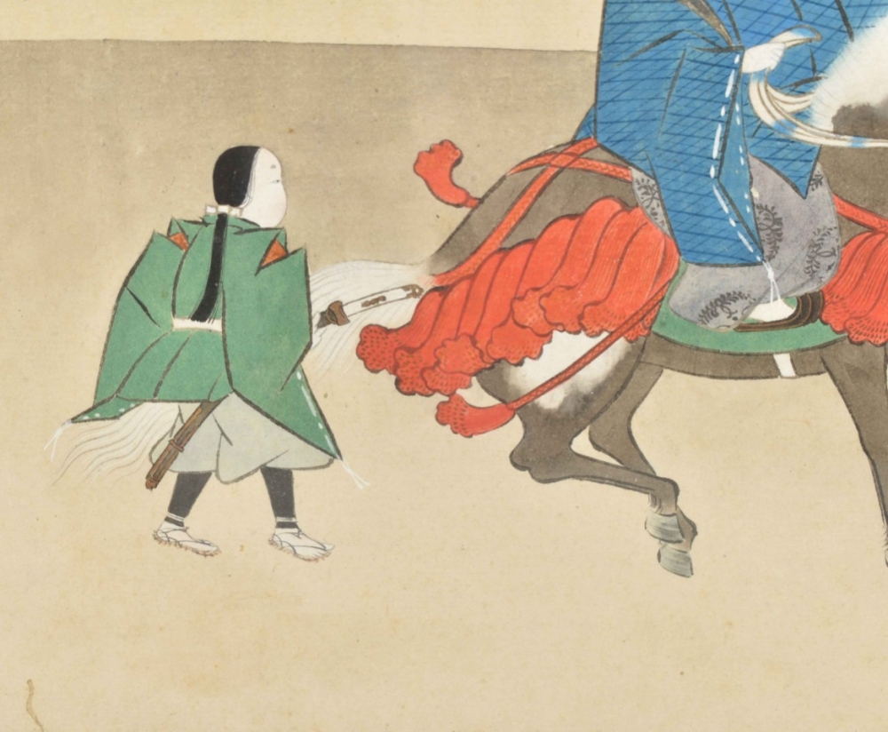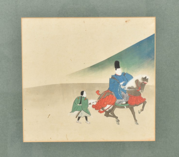 [Japan] Two drawings: (1) "Court noble on horseback, accompanied by a girl on foot"