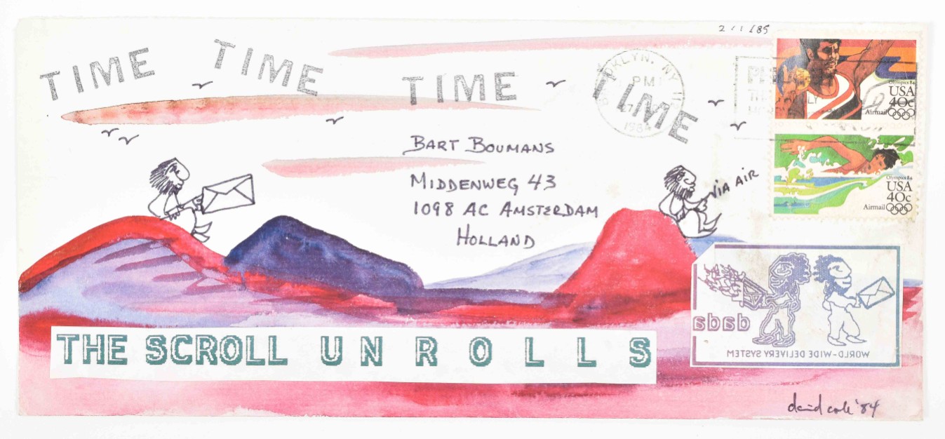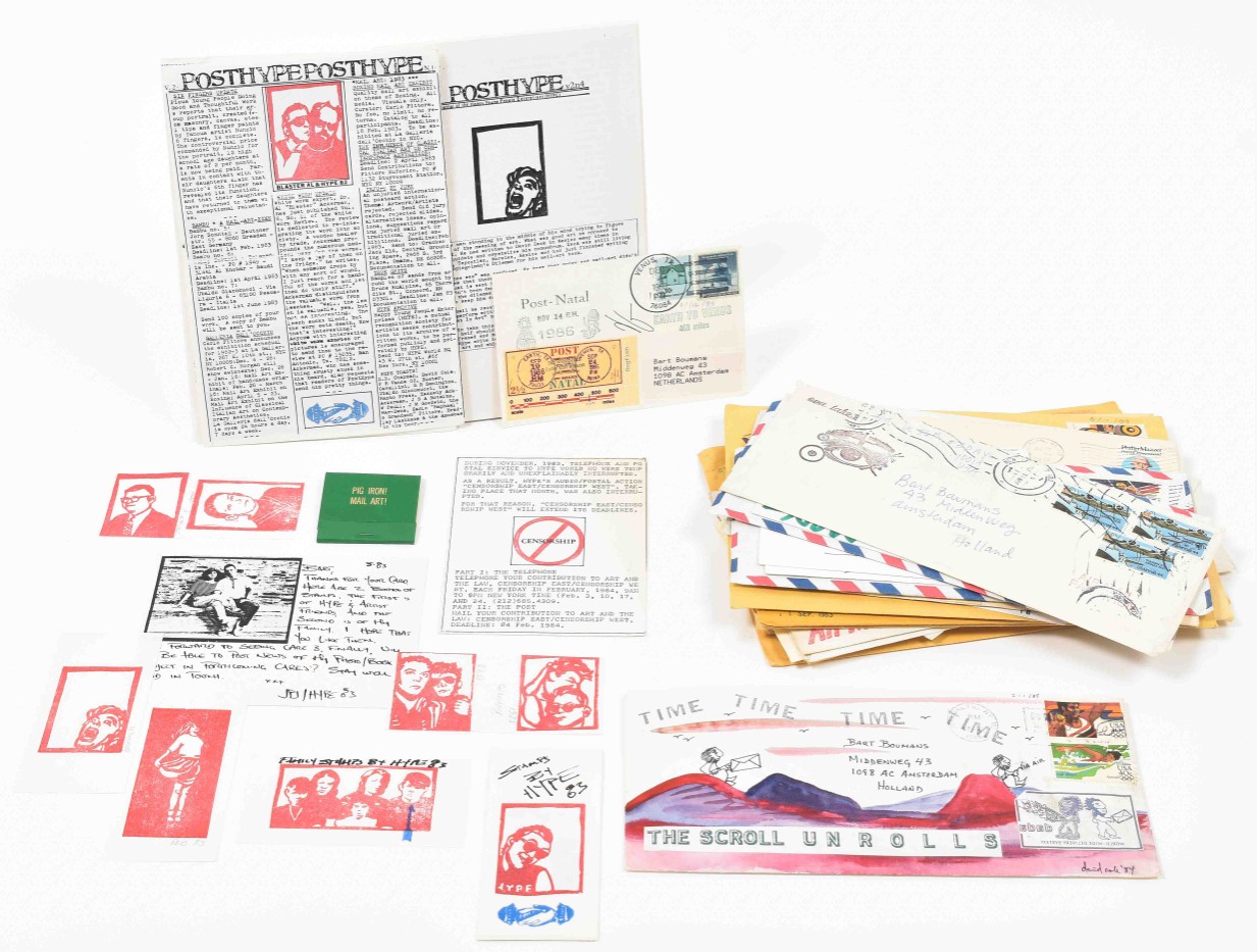 Mail art correspondence (1) ca. 40 letters (in original envelopes) and cards from the USA, sent by various artists such as Bern Porter, David Cale, Dogfish, Hype World (J. P. Jacob), E.F. Higgins III and the Ruth and Marvin Sackler Archive.