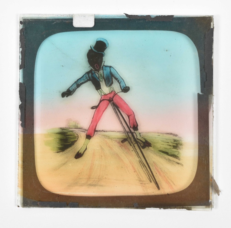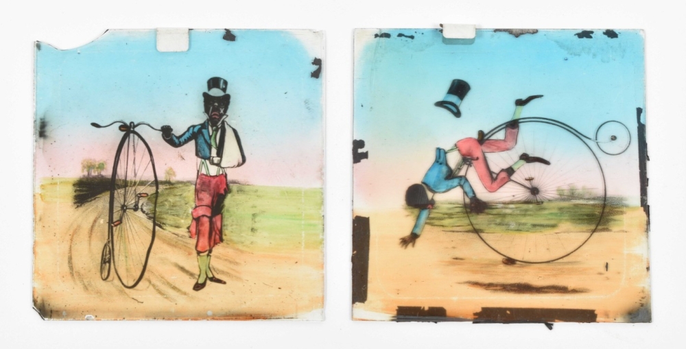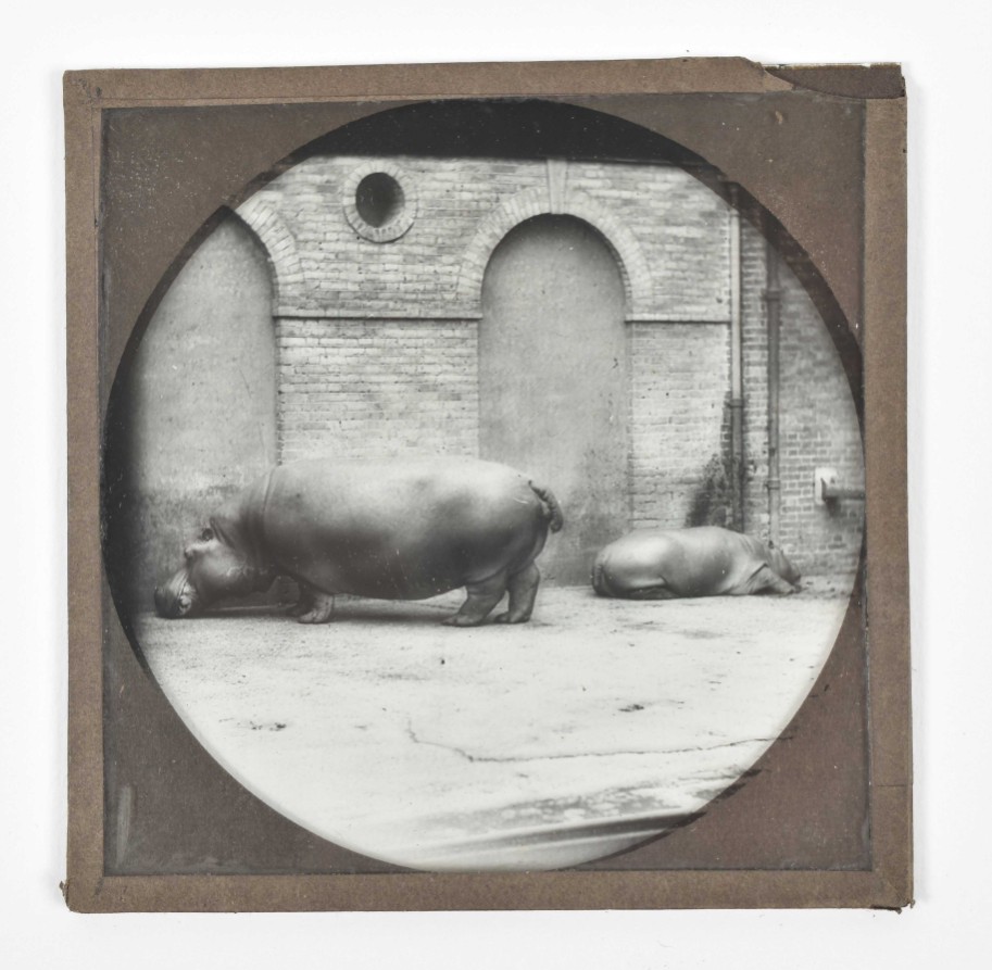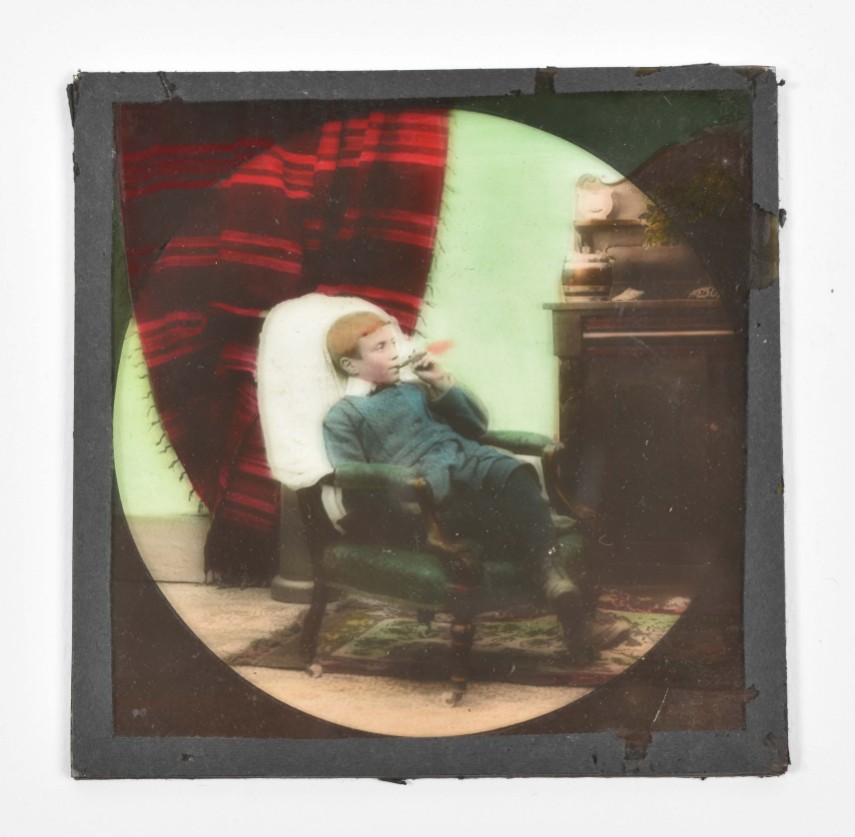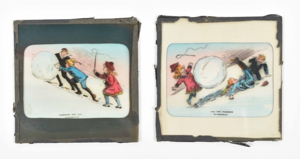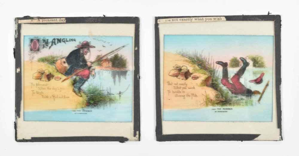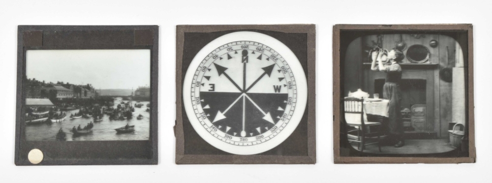 A number of slides w. the tape around the sides lacking, incomplete or loose. Comprises photographic touristical plates, reproductions of (series of) works of art (for instance images of the Doré-bible), ships, but also nice chromolithographed slides w. caricatures or scenes from daily life.