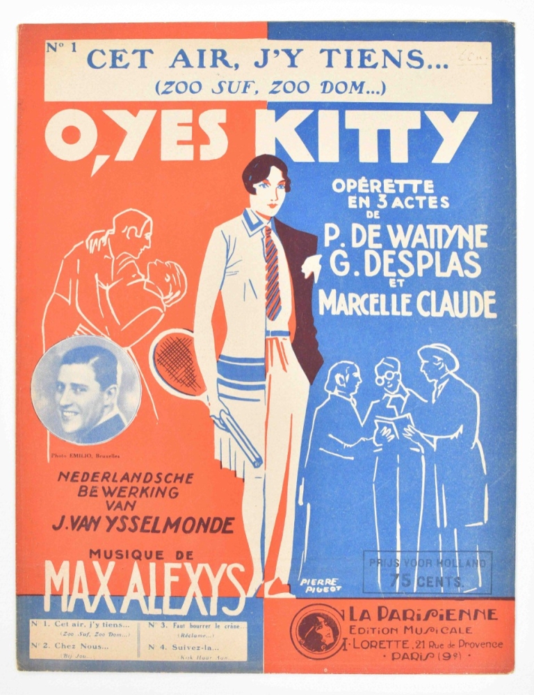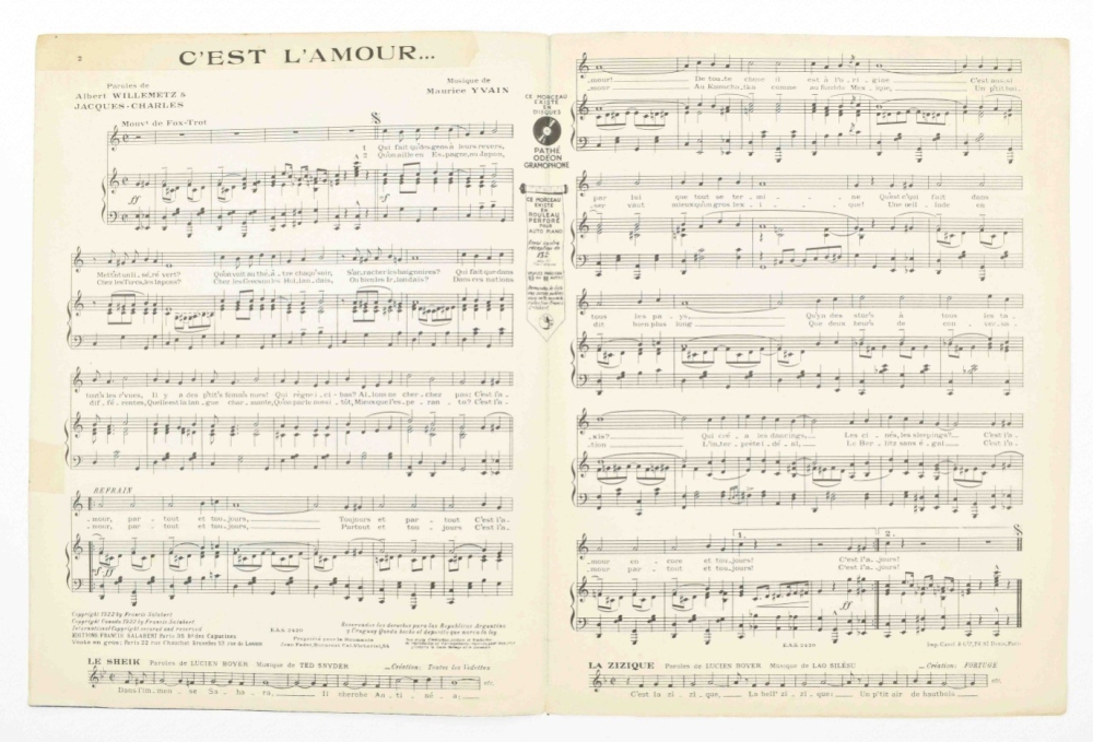 Added: sheet music to song "C'est l'amour" w. picture of tennis on cover. Some discol., sl. foxing, edges worn, some sm. tears repaired w. sellotape, 1 w. entire fold. edge repaired w. tape. Overall in good condition. (total 5 in 1 portfolio)
