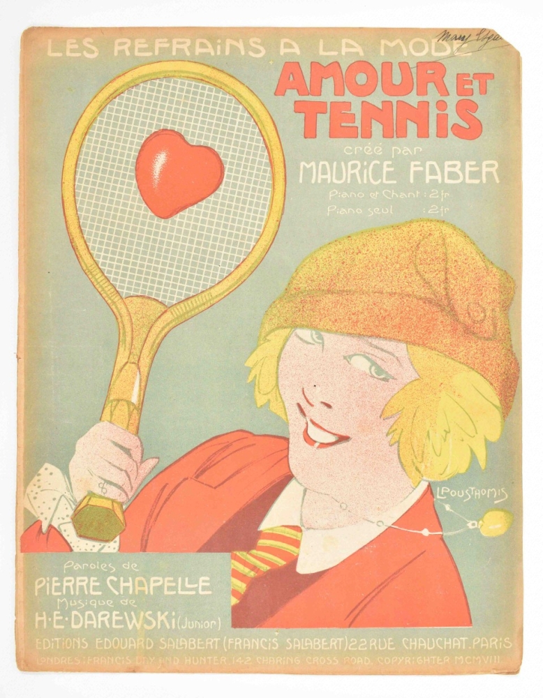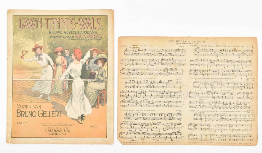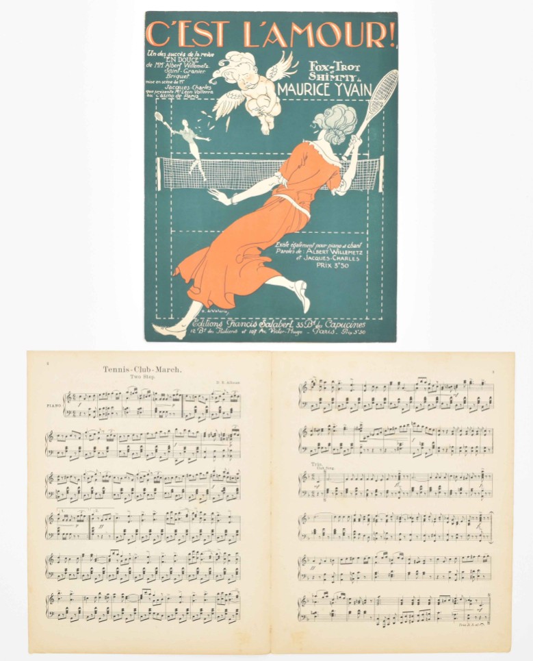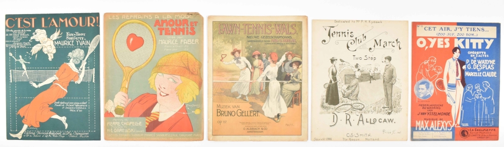 Sm. collection of 5 pieces of sheet music about tennis, early 20th cent. Incl.: Amour et tennis; Cet air, j'y tiens; Tennis-Club-March; and Lawn-Tennis-Wals.