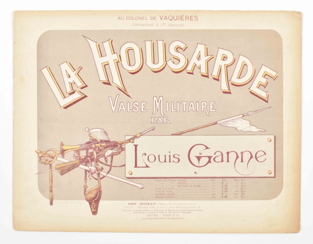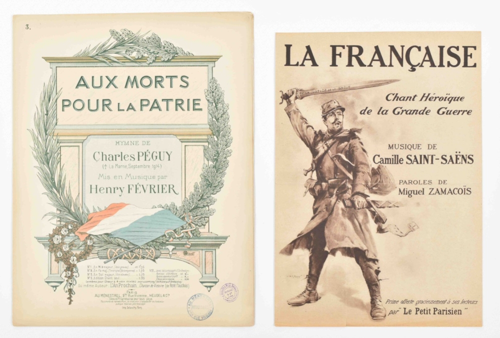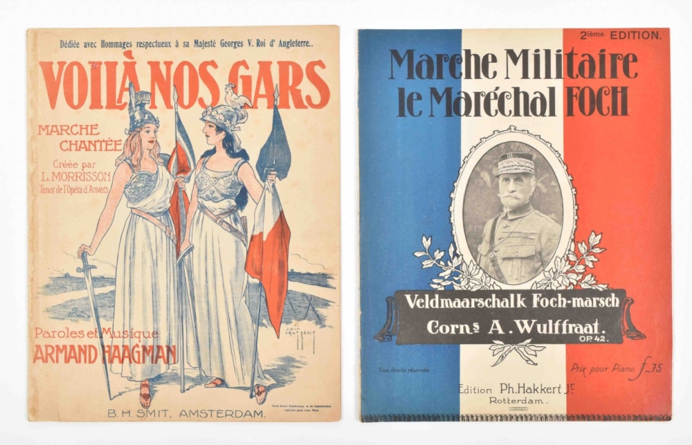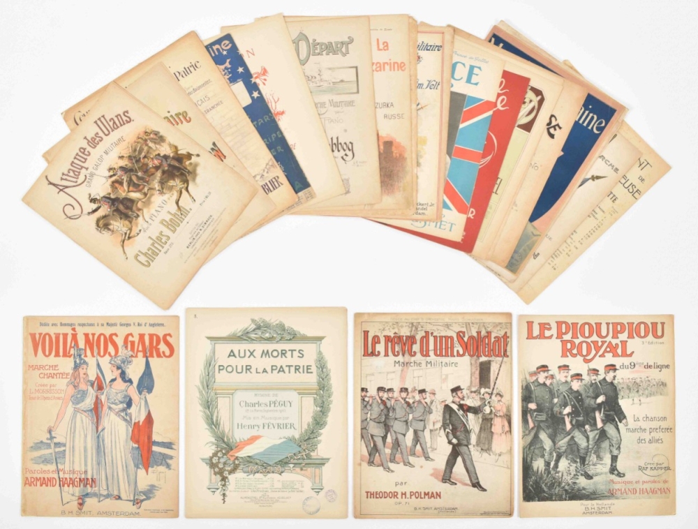 Approx. 30 pieces of sheet music in 1 portfolio. Collection of French military sheet music from various periods and wars, some from WWI and WWII. Incl. a.o.: Le Reve d'un soldat; Le Defile du regiment; Le Pioupiou royal; Viola nos gars; La Housarde; Marche militaire le Marechal Foch; La Francaise, chant heroique de la grande guerre; Aux morts pour la patrie; and Attaque des Ulans.