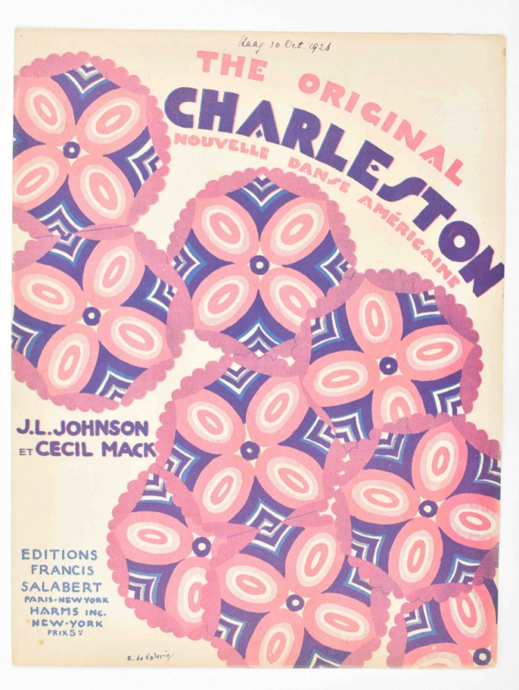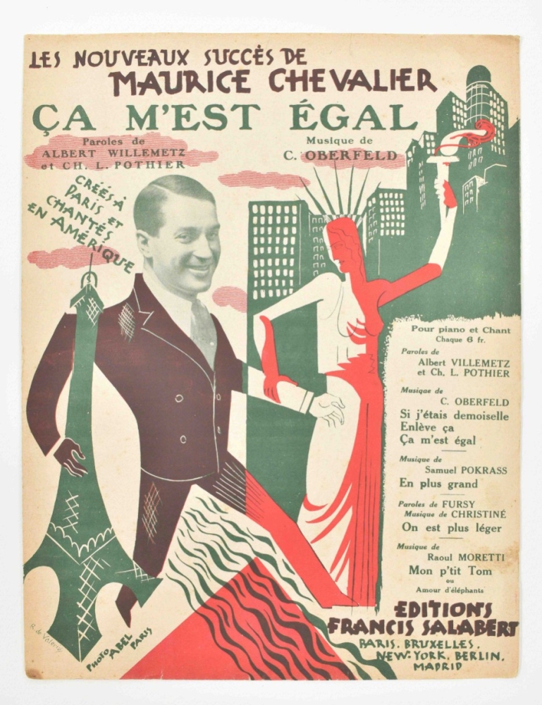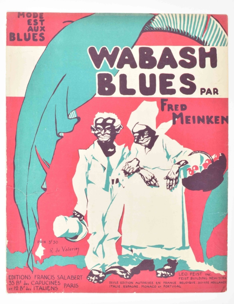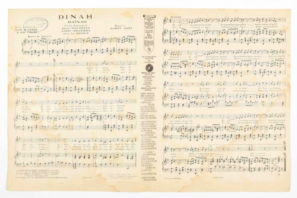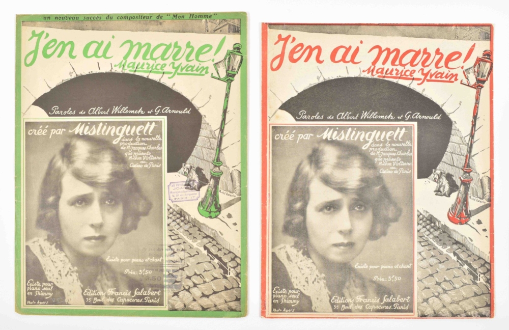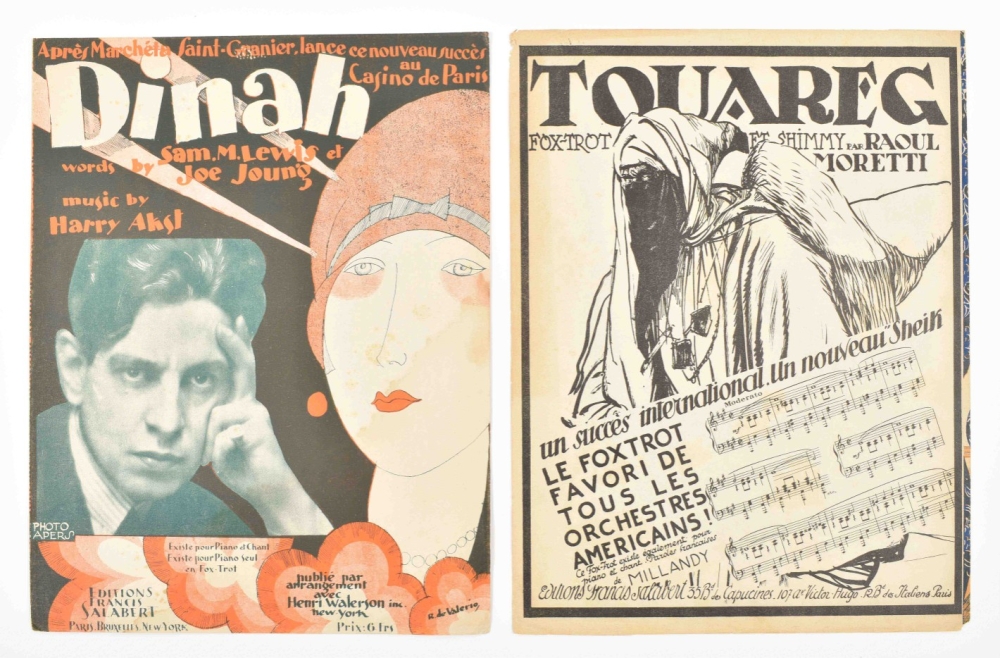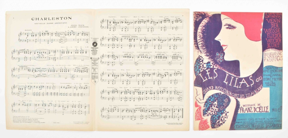 The French artist and illustrator Valerio was particularly well-known for his work in advertisement, making posters for many large companies. Music incl. a.o.: Fred Meinken, Wabash Blues; Maurice Yvain, J'en ai marre; Albert Chantrier, Eleonore; H. Christine, C'est une gamine charmante; Henry R. Cohen, Why Dear?; and Harry Akst, Dinah. Some discol., sl. foxing and waterst., edges worn, some sm. tears repaired w. sellotape, a few w. tape along entire fold. edge. Overall in good condition. (total approx. 40 in 1 portfolio)