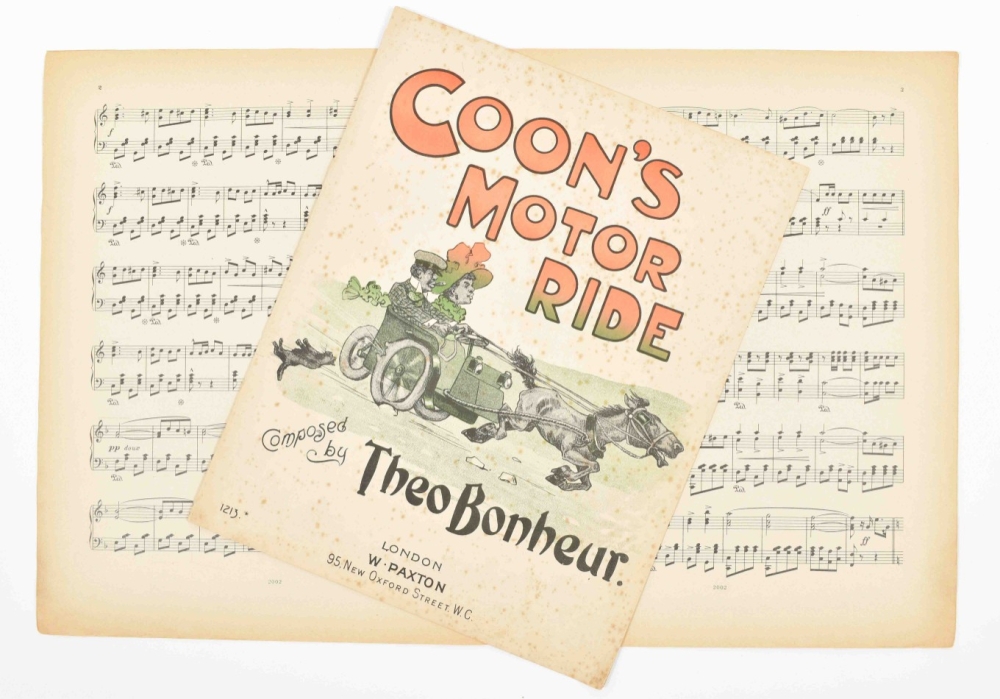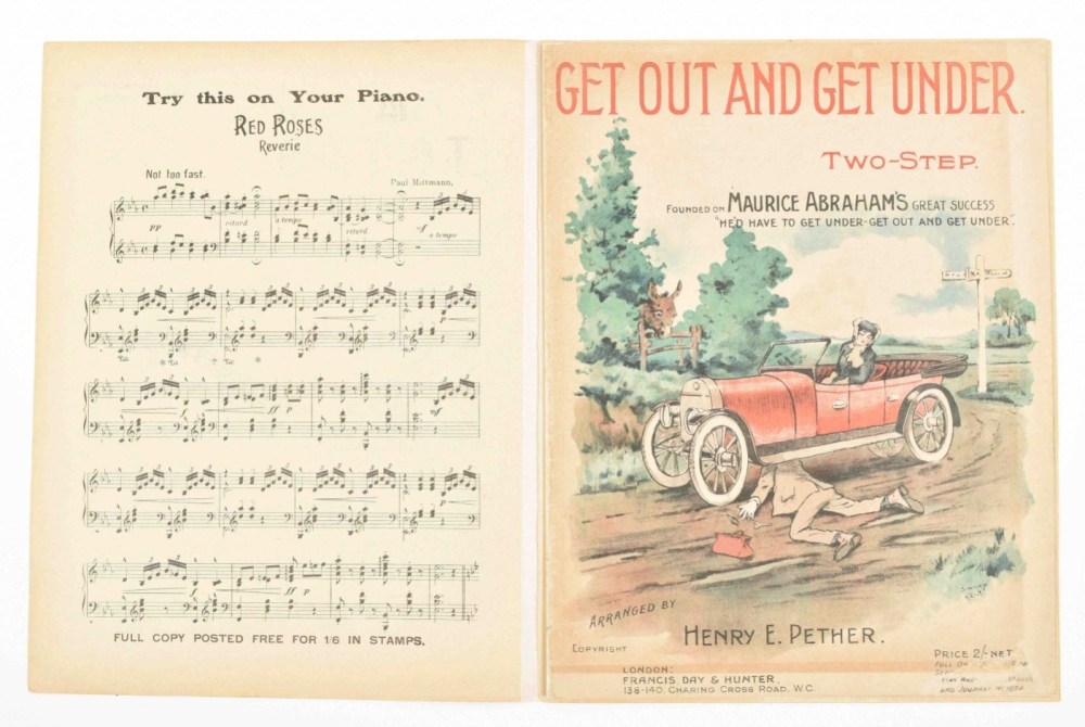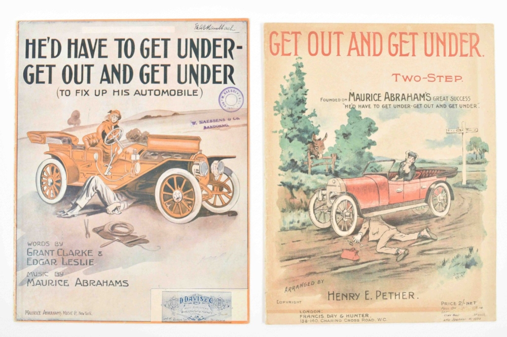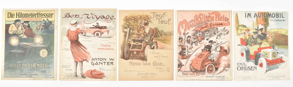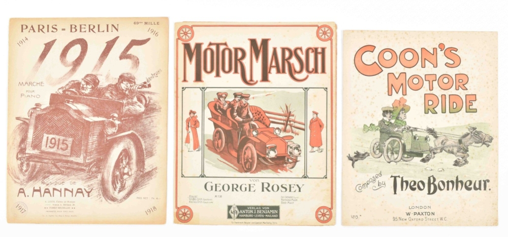 11 pieces of sheet music loose in 1 portfolio. Early 20th cent. Incl. a.o.: Theo Bonheur, Coon's Motor Ride; George Rosey, The Motor March; Henry E. Pether, Get Out and Get Under; A. Hannay, Paris-Berlin Marche; and C.R. Foster & Byron Gay, The Little Ford Rambled Right Along.