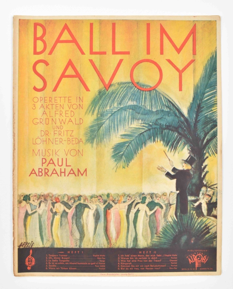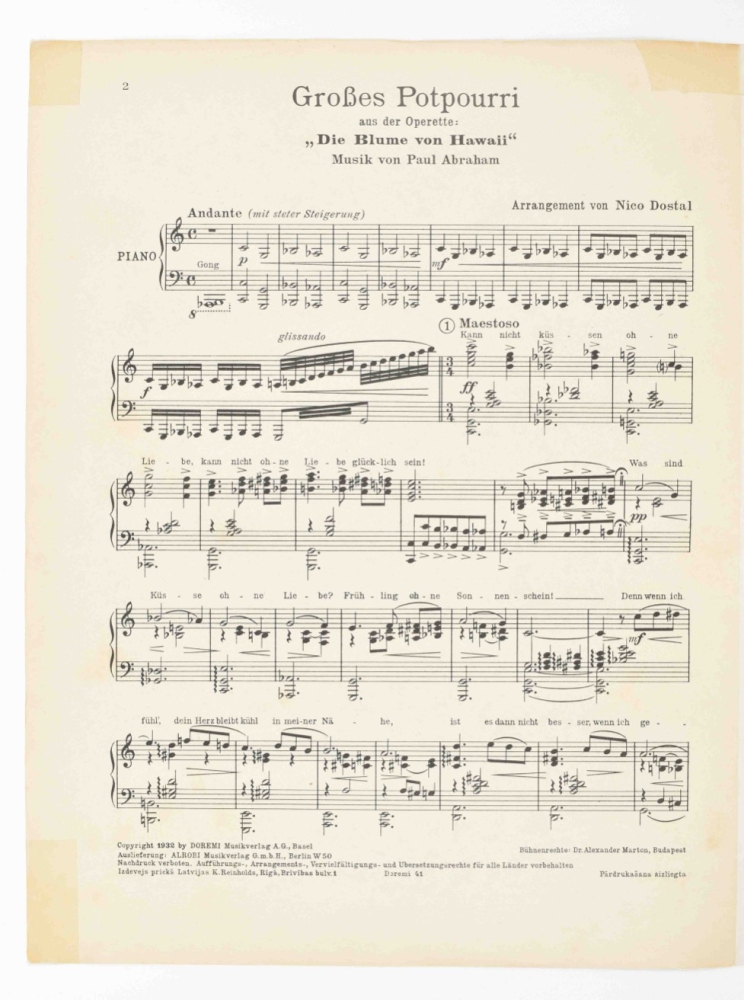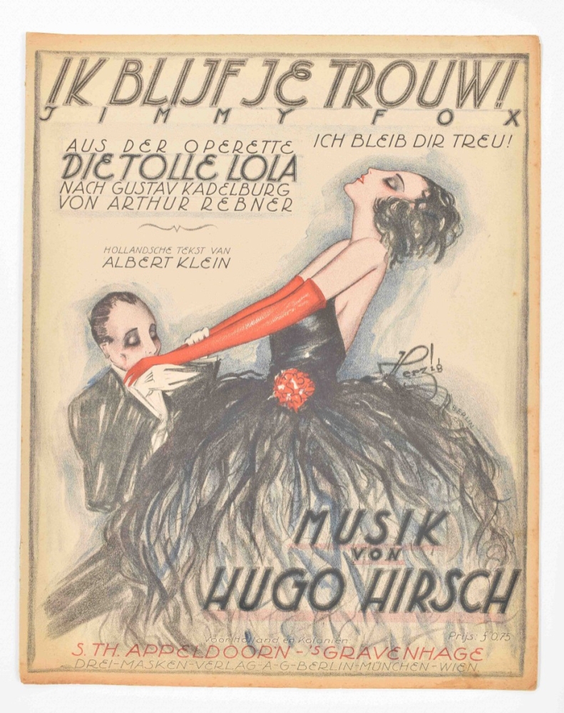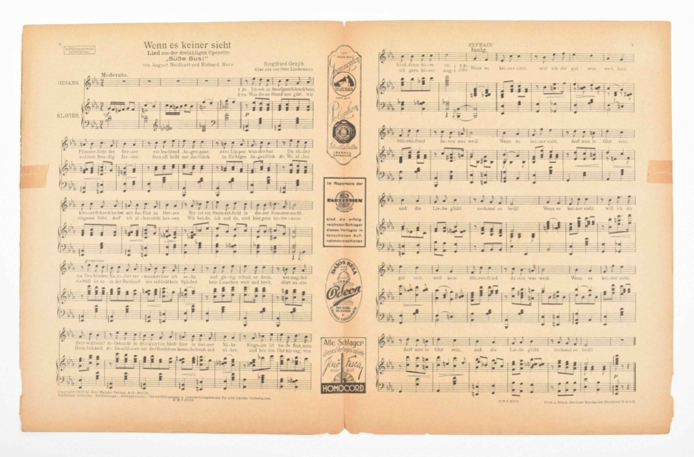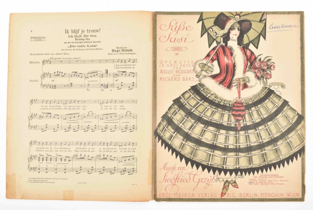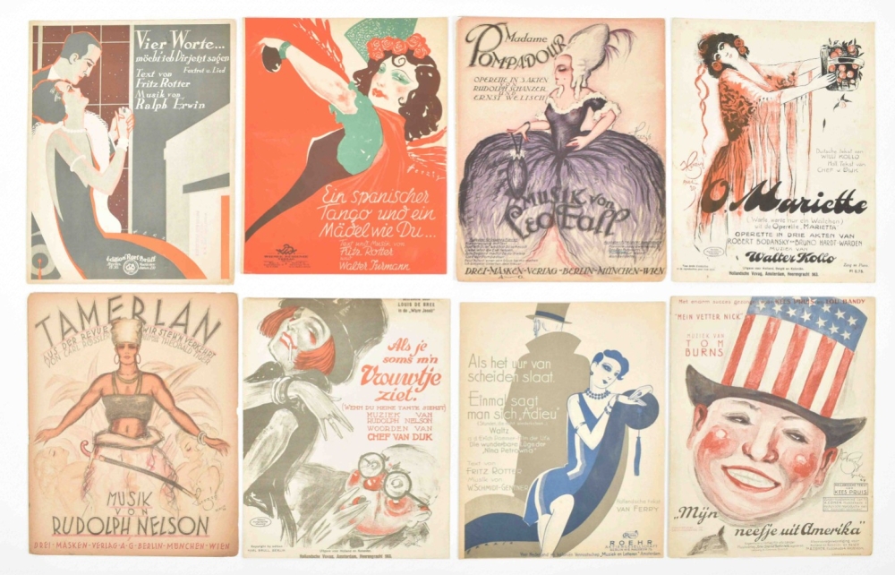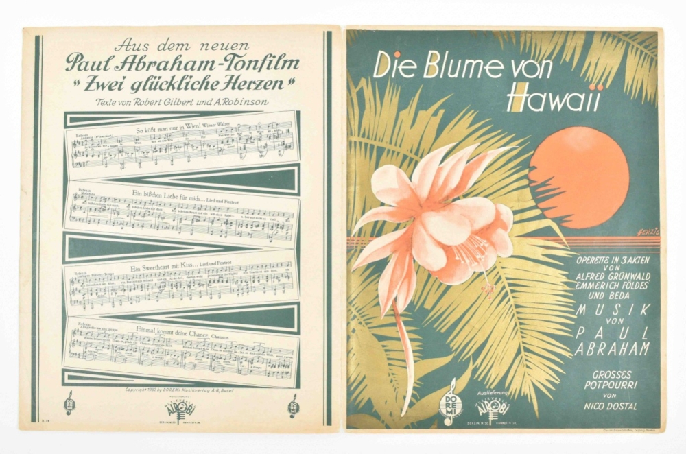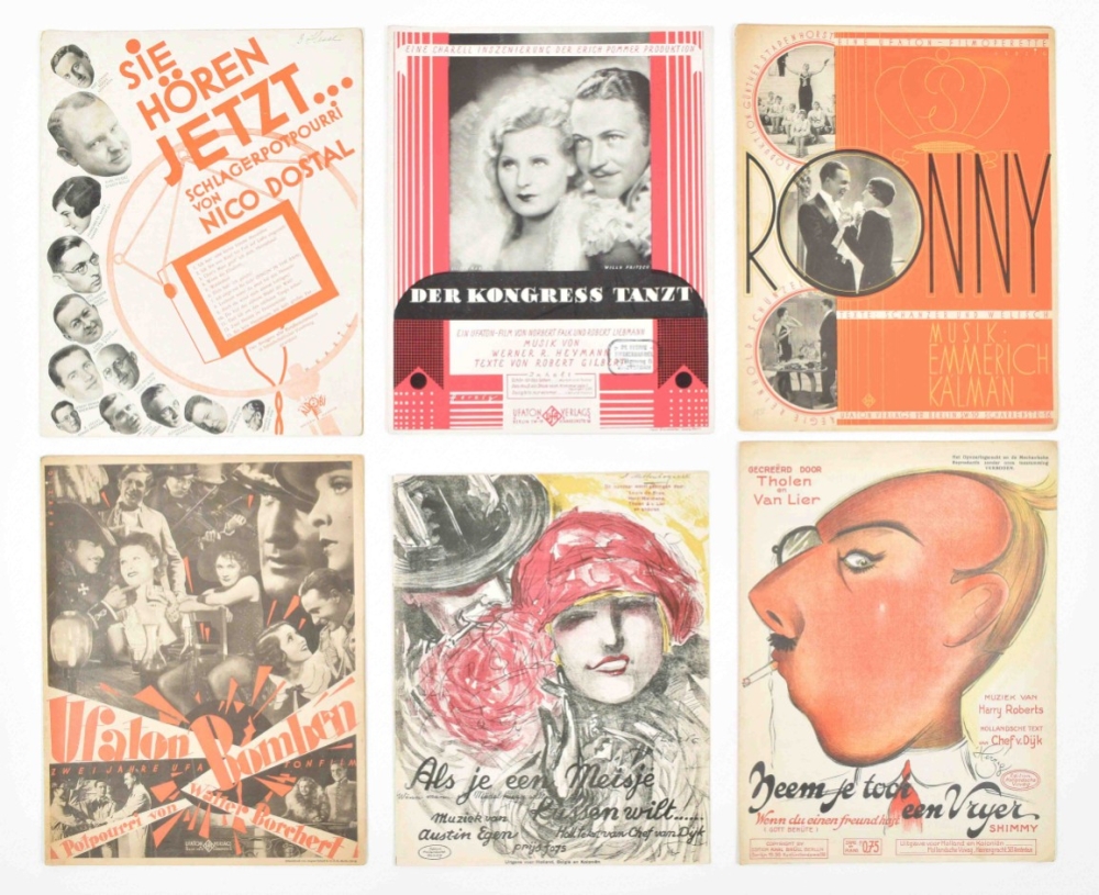 Music incl. a.o.: Nico Dostal, Die blume von Hawaii; A. Klein and H. Hirsch, Ik blijf je trouw; S. Grzyb, Wenn es keiner sieht; and A. Grunwald, F. Lohner-Beda, and P. Abraham, Toujours l'amour. Some discol. and foxing, edges worn, some sm. tears repaired w. sellotape, and a few w. tape along entire fold. edge. Overall in good condition. (total 20 in 1 portfolio)