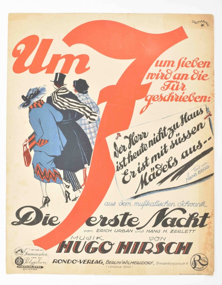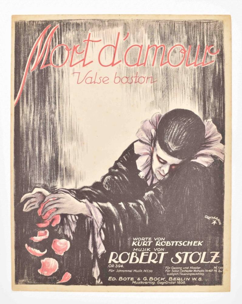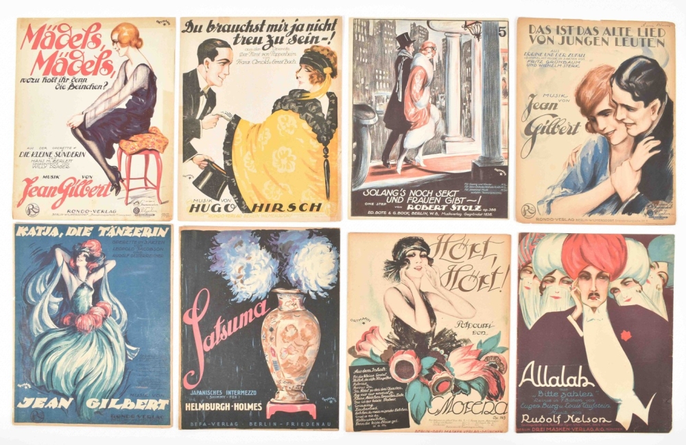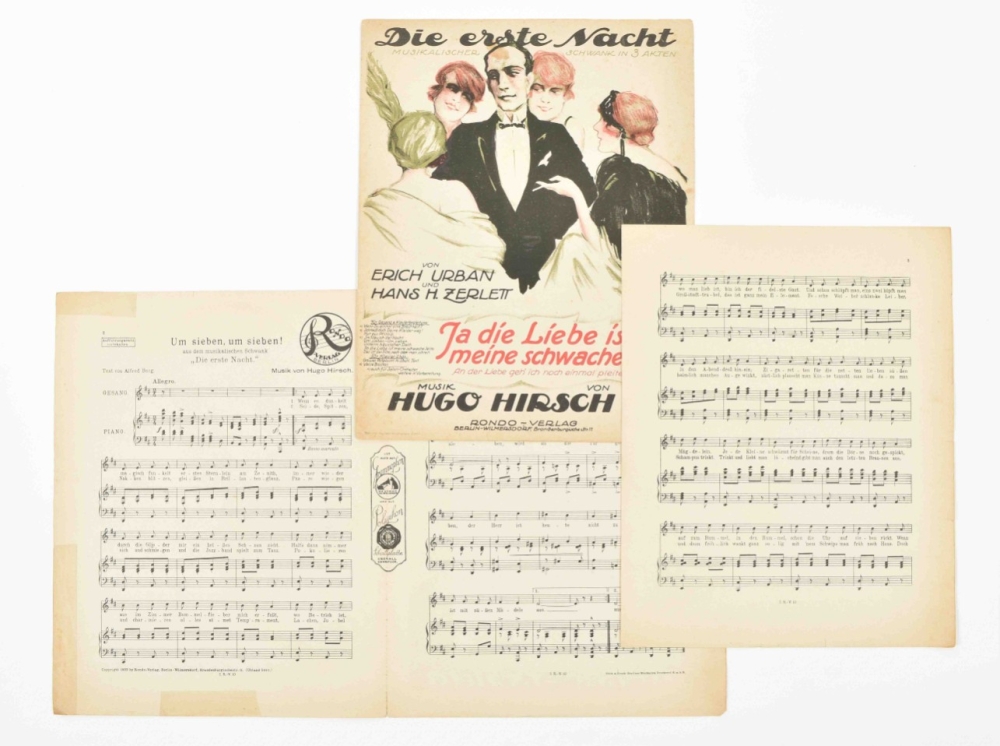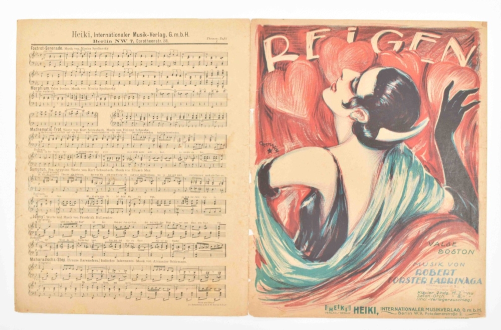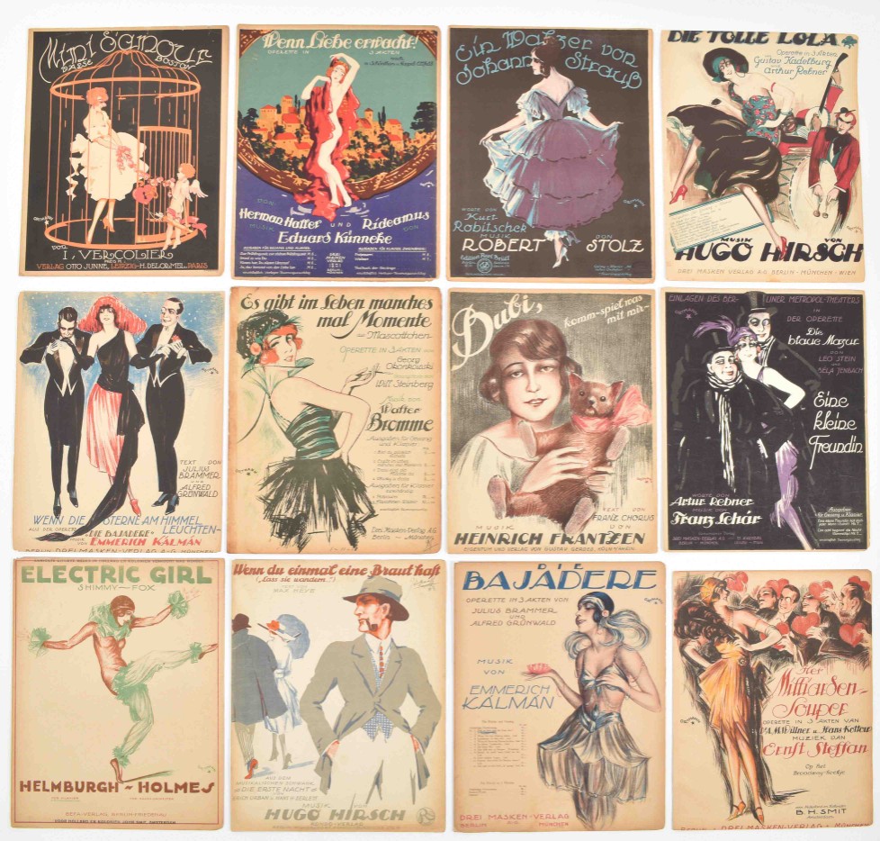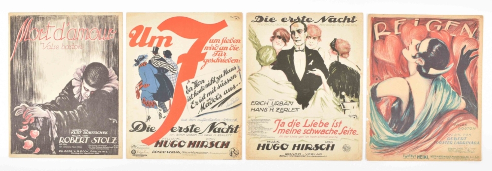 Music incl. a.o.: A. Berg and H. Hirsch, Um sieben, um sieben!; K. Robitschek and R. Stolz, Mort d'amour; H. Zerlett and H. Hirsch, Ja, die Liebe ist meine schwache Seite; and R. Forster Larrinaga, Reigen. Some discol. and foxing, edges worn, some sm. tears repaired w. tape, some w. tape along entire folding edge. Overall in good condition. (total 24 in 1 portfolio)