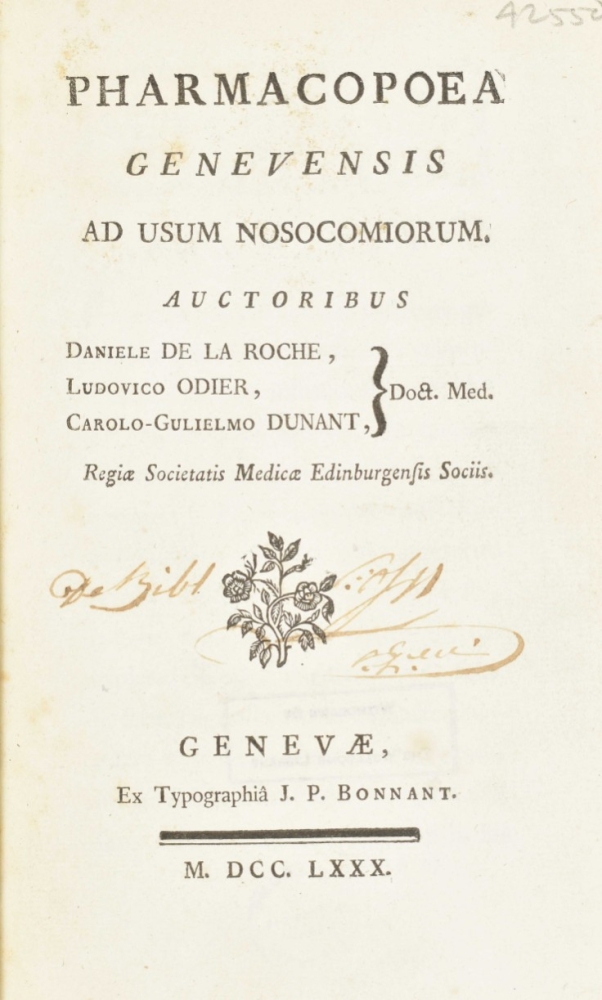 Ludovico Odier, and Carolo-Guielmo Dunant. Pharmacopoea Genevensis ad usum nosocomiorum. Geneva, J.P. Bonnant, 1780. (10),199,(20) p. Large 12mo. Leather binding w. gilt title and ornamentation along spine, a.e.g., some library stamps and former owner's signature on title-p., sm. title and preface vignette.