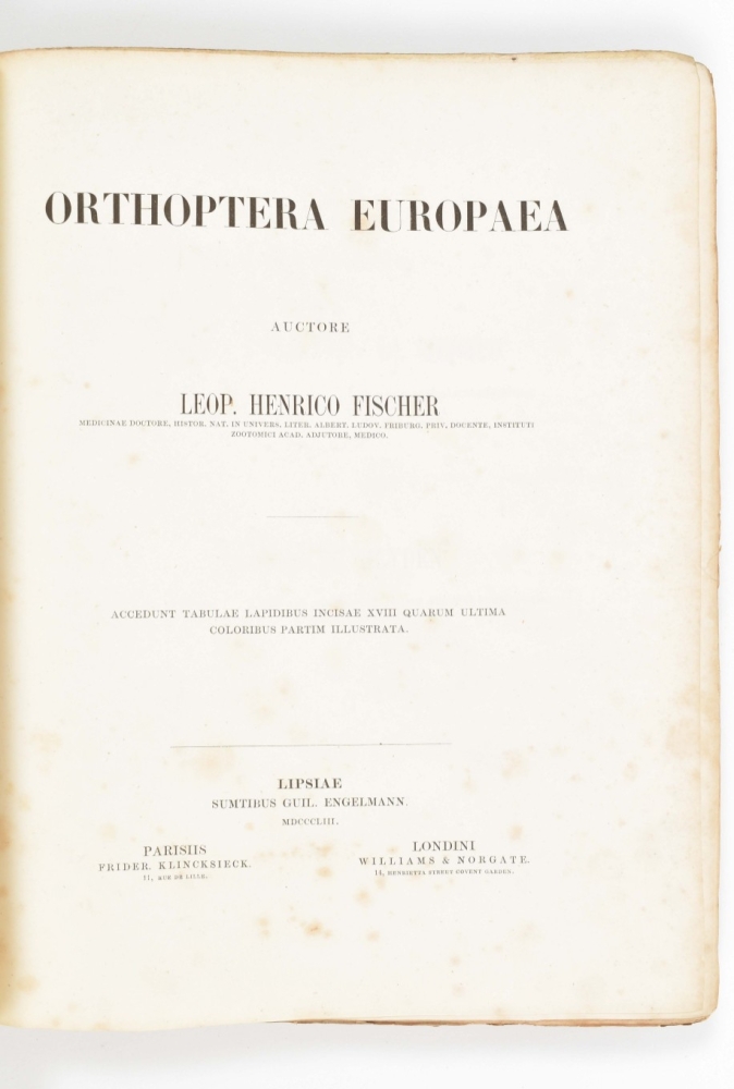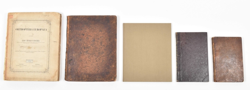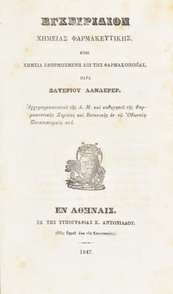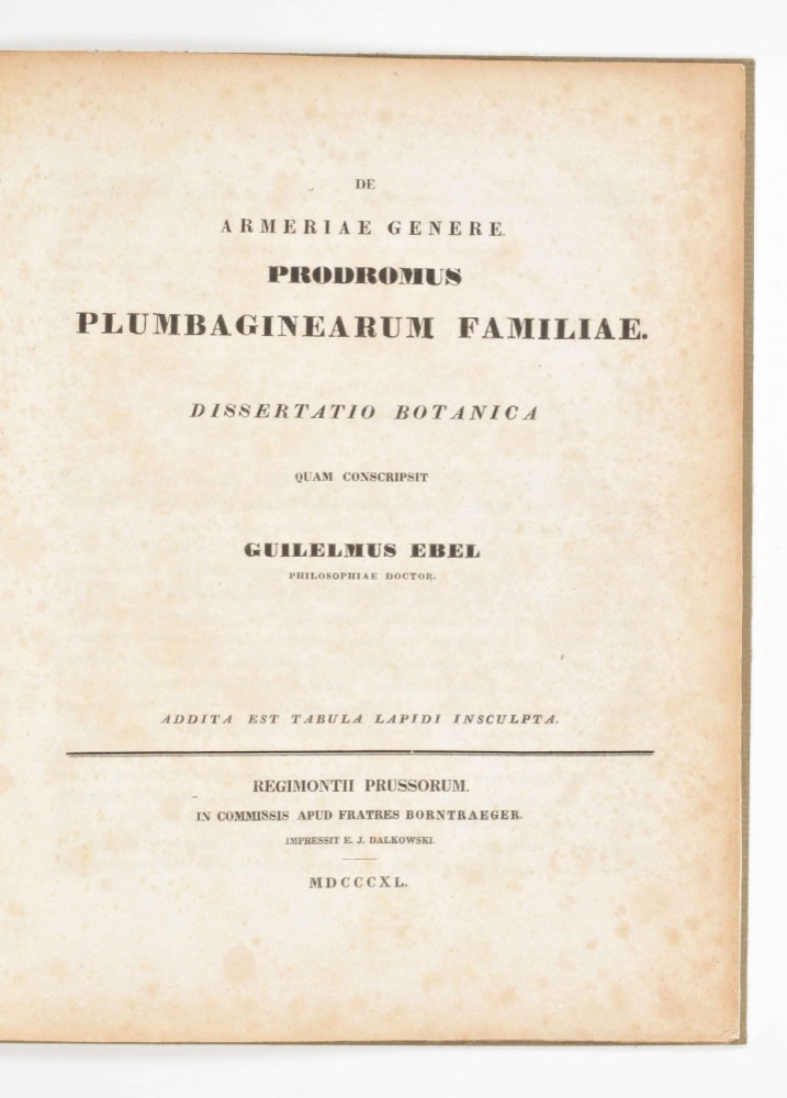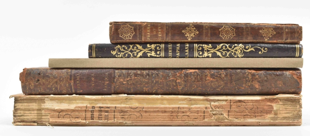Spine worn, front cover loose, sl. foxing, otherwise in good condition. (2) Xaver Landerer. Ekcheridion chemeias pharmakeytikes (...). Athens, 1847. (4),247 p. Sm. 8 vo. Orig. boards w. gilt letters and ornamentation on spine, printed in Greek, sm. title vignette. Landerer (1809-1885) played an important role in the modernization of Greek science in the 1st half of the 19th cent. In excellent condition. (3) Guilelmus Ebel. De Armeriae genere prodromus plumbaginearum familiae. Regimontii Prussorum in commissis apud fratres borntraeger impressit E.J. Dalkowski, 1840. (iv),44,(6) p. Sm. 4to. Contemp. paper-covered boards, 1 lithogr. plate. Discol and foxing, otherwise in good condition. Rare. -and 2 others. (total 5)