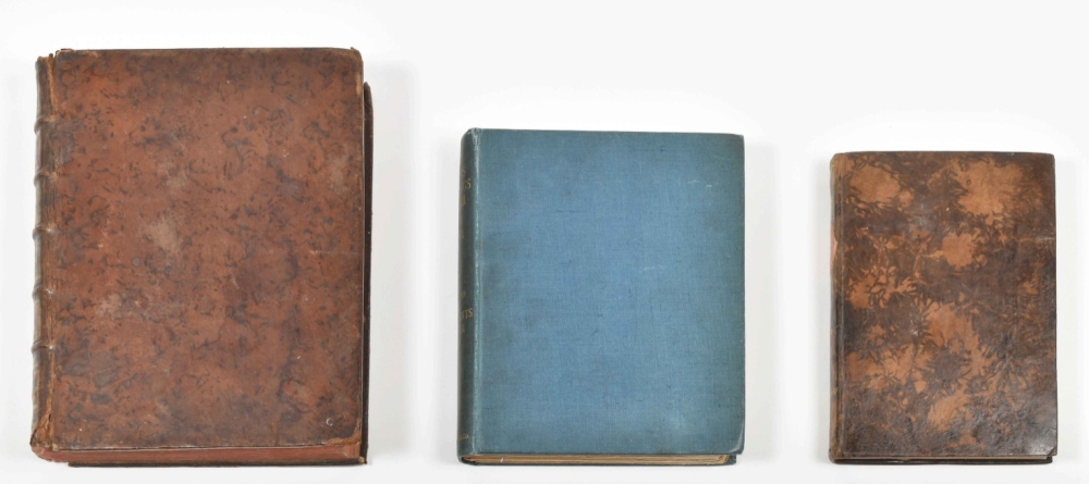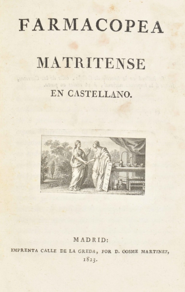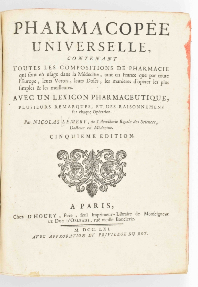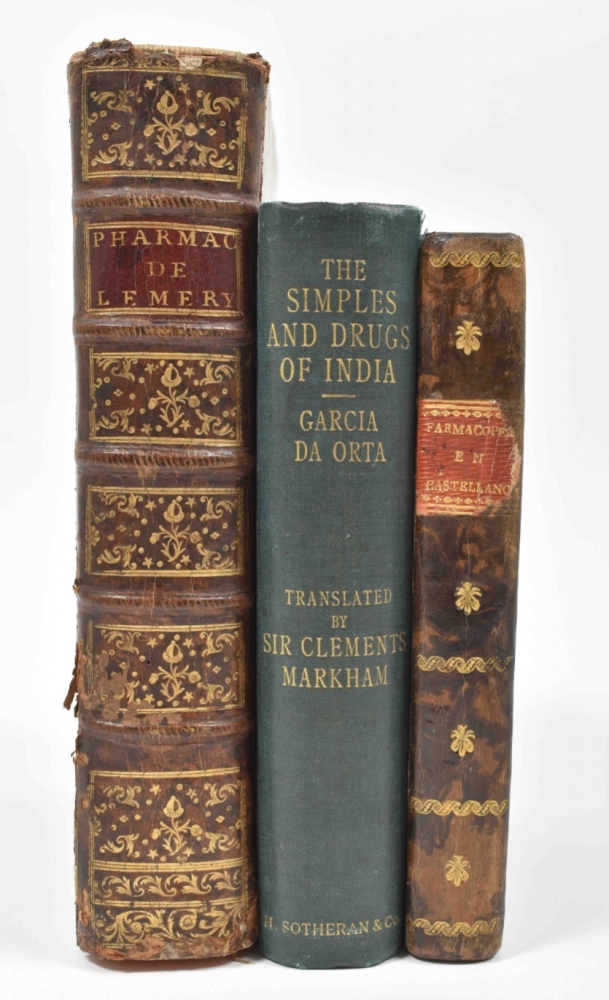 (2) Farmacopea matritense en Castellano. Madrid, Calle de la Greda por D. Cosme Matinez, 1823. (XIV), 403 p. 8vo. Contemp. leather w. gilt letters and ornamentation on spine, marbled paper pastedowns and flylvs., sm. copperplate title-p. vignette. Spine sl. worn, title-p. sl. loose, minor foxing. Overall in excellent condition. (3) Nicolas Lemery. Pharmacopée universelle, contenant toutes les compositions de pharmacie (...). Paris, D'Houry, 1741. 5th ed. (xvi),864 p. Sm. 4to. Contemp. leather binding w. gilt letters and ornamentation on spine, marbled paper pastedowns and flylvs., title-p. vignette. Spine and covers sl. worn, minor foxing, otherwise in excellent condition. (total 3)