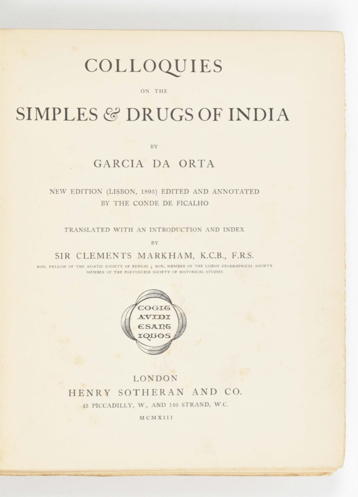 Colloquies on the Simples & Drugs of India. London, Henry Sotheran, 1913. (xxi),509 p. Large 8vo. No. 249 of 250 numb. copies, 23 numb. lithogr. plates of Indian plants, dec. majuscules begin each section, p. uncut. In excellent condition.