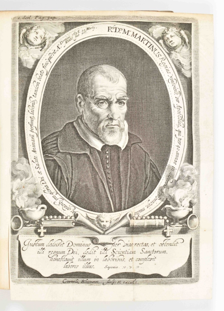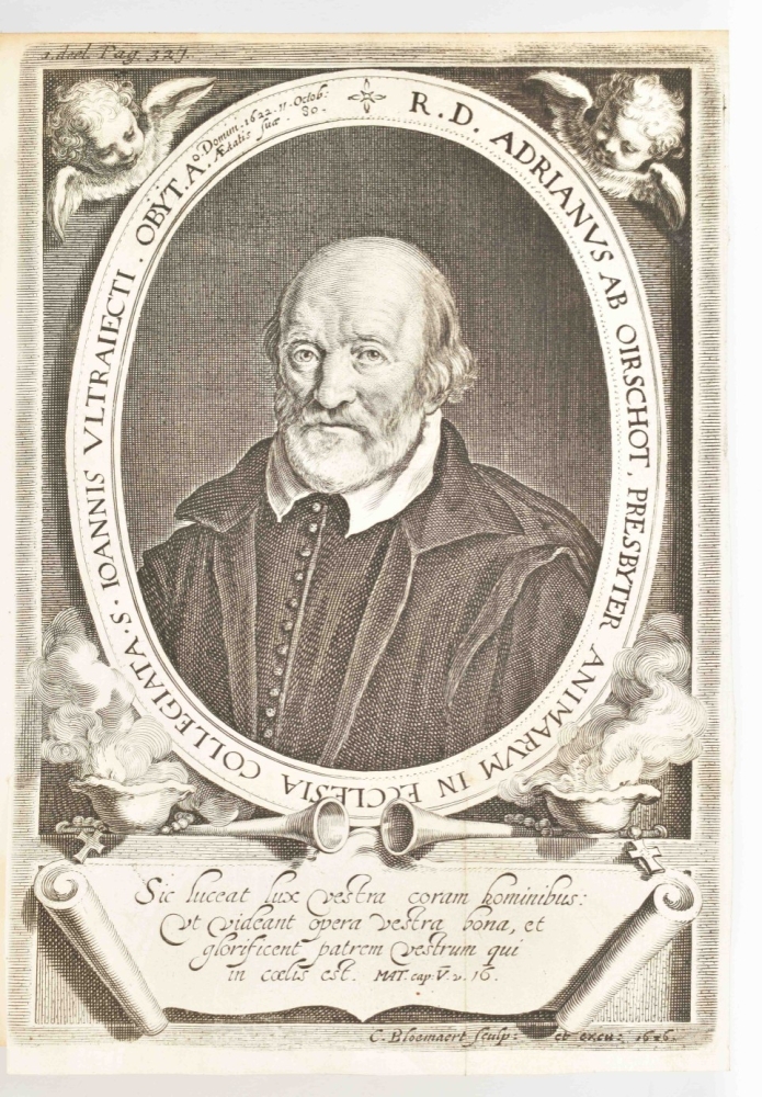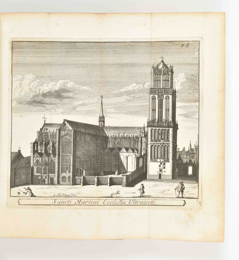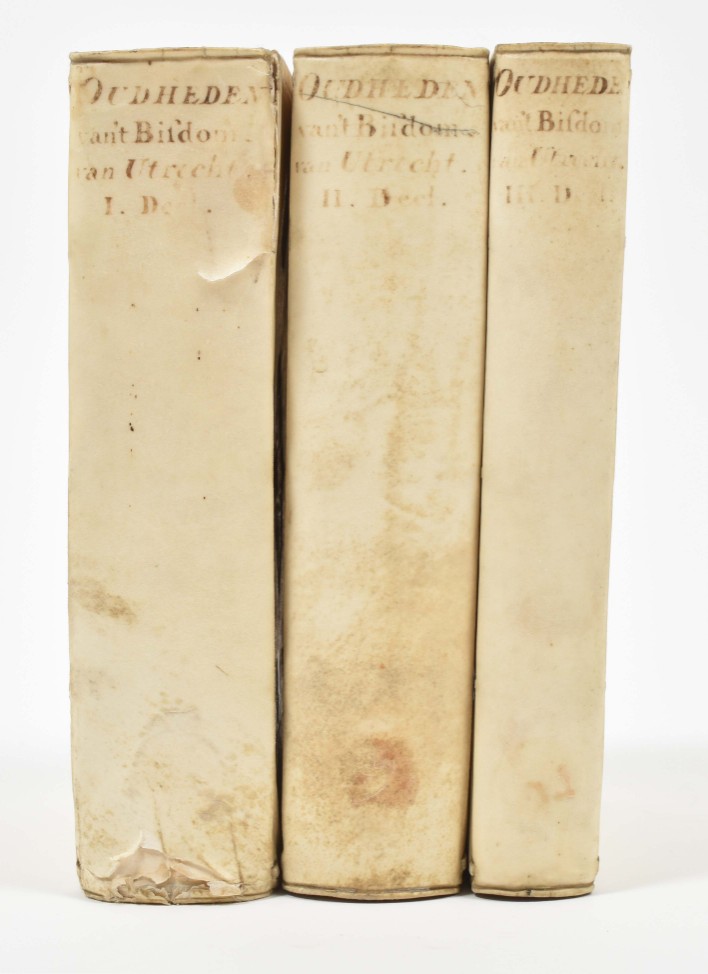 behelzende de oudheden, kerkelijke en geestelijke gebouwen, kapellen (...). Transl. H.V.R. (H. van Rijn). Leiden, C. Vermey, 1719. 3 vols. Contemp. vellum w. blindst. centerpieces and manuscript titles on spines, former library stamps on title-p., 2 fold. engr. views and 2 fold. portraits.