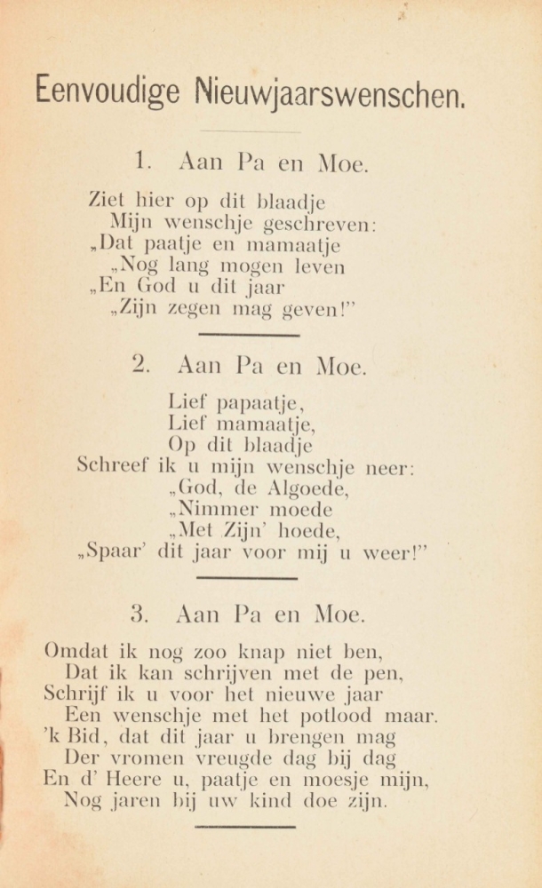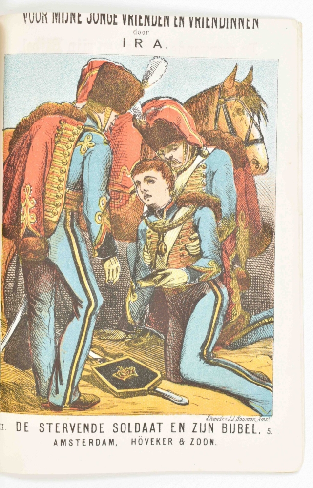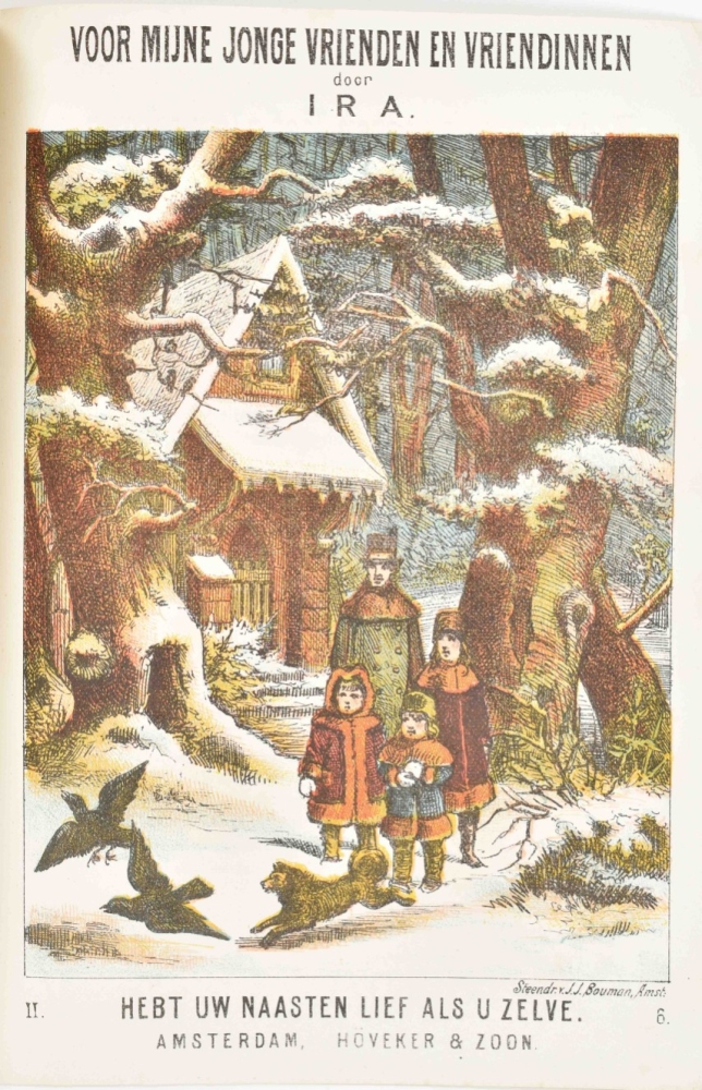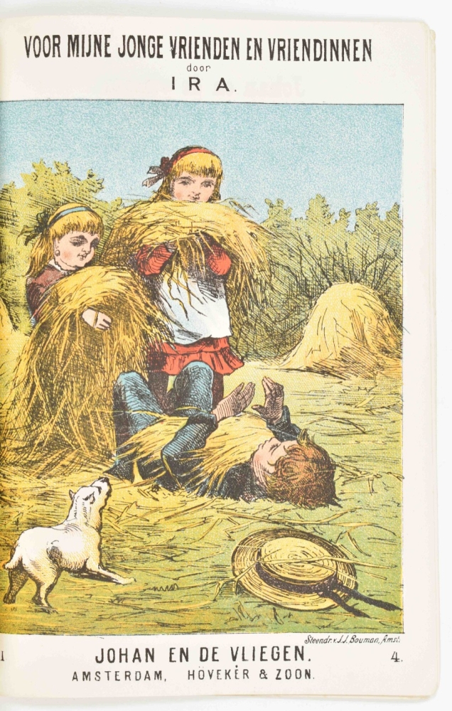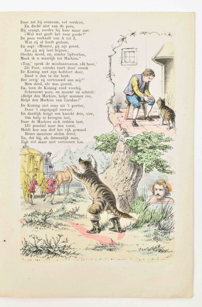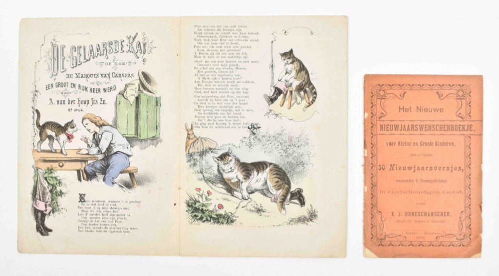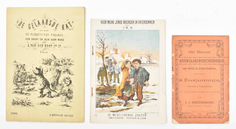 bevattende 50 Nieuwjaarsversjes waaronder 5 Naamgedichten, in Godsdienstigen Geest. J. Bakker, Drieborg, 1899. 20 p. 8vo. With: (2) A. van der Hoop Jrs. zn. De Gelaarsde Kat of hoe de Marquis van Carabas een groot en rijk heer werd. 6th pr. Leiden, D. Noothoven van Goor, ca. 1870. (3) Voor mijne jonge vrienden en vriendinnen . Serie II, vol. 1. De medelijdende zuster. Amsterdam, Höveker & Zoon, [1861] -and 13 more 19th cent. children's books.