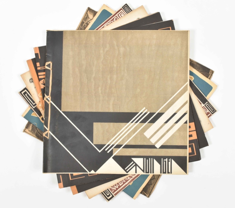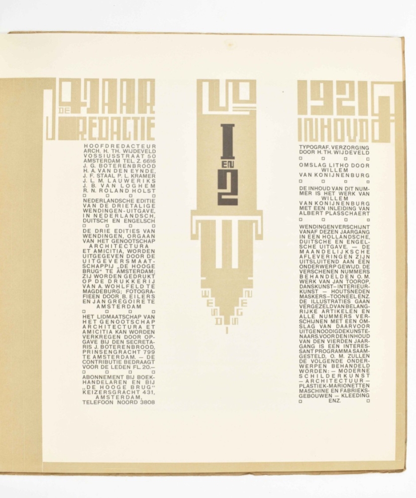 Vol. 4, nos. 1-10 and 12 (11 issues in 7 vols.). Amst., De Hooghe Brug, Jan. 1921-Dec. 1921. Large 4to. Raffia-bound, orig. covers, extensively ills. Cover des. by a.o.: W. van Konijnenburg; M. de Klerk; R.N. Roland Holst; J. Gidding; C.A. Lion Cachet; F. Lensvelt; and B. Bijvoet/ J. Duiker.