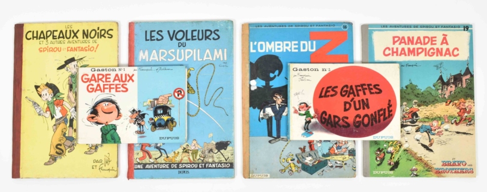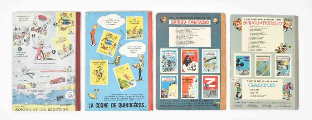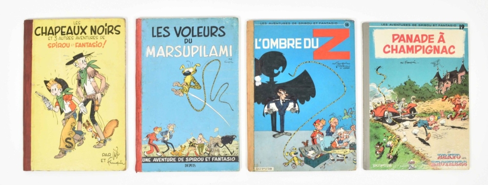 Les Chapeaux Noirs. Vol. 3. Dupuis, 1952. Spine restored, edges worn. (2) Les Voleurs du Marsupilami. Vol. 5. Dupuis, 1954. Spine restored, occas. recol. (3) L'Ombred Du Z. No. 16, 1962. Spine dam. (4) Panade à Champignac. No. 19. Dupuis, 1969. Very good copy.