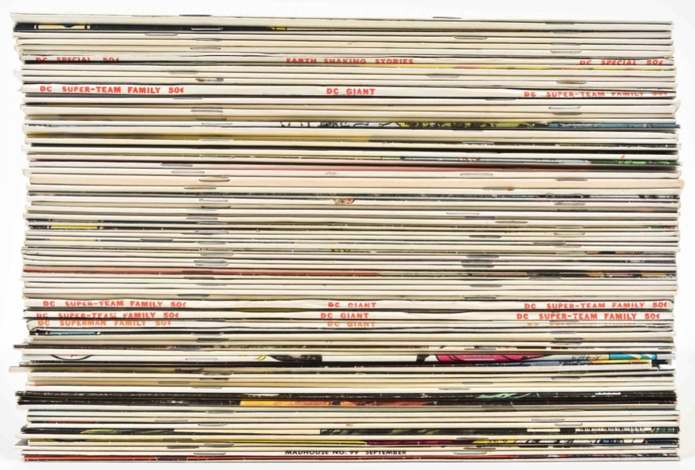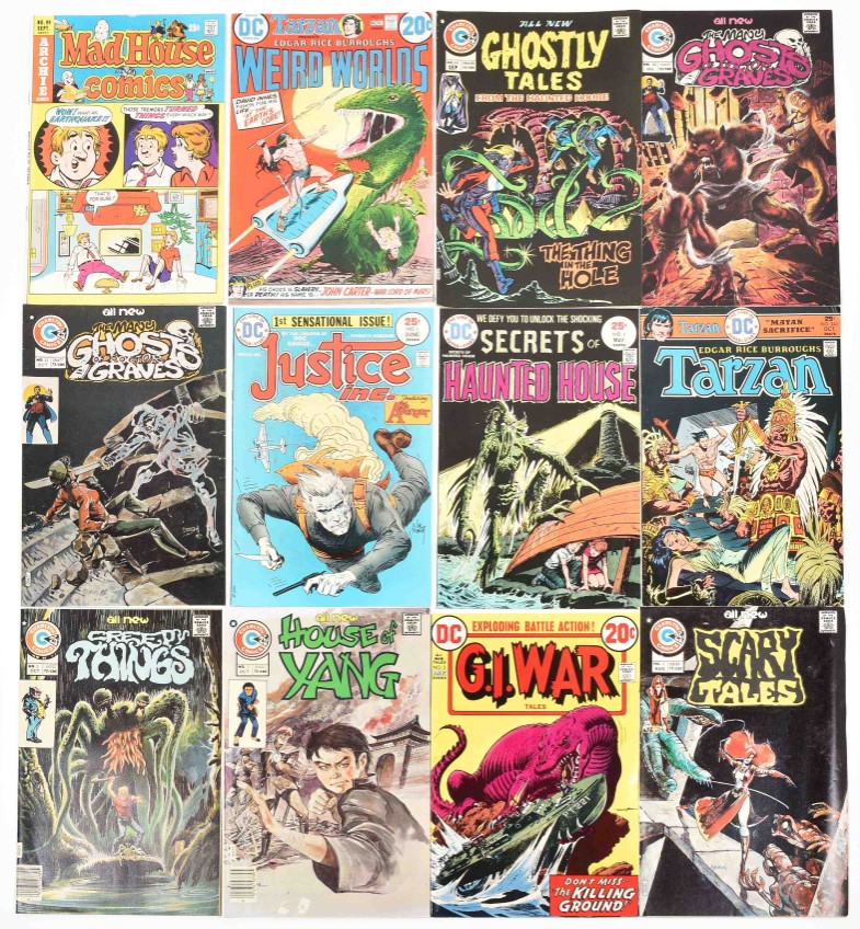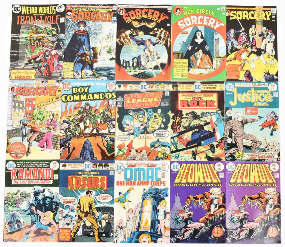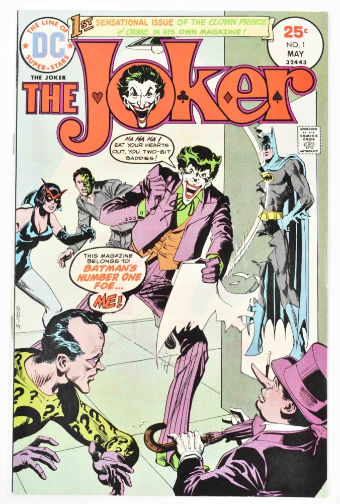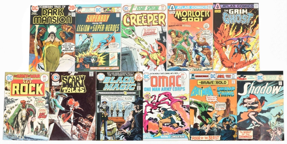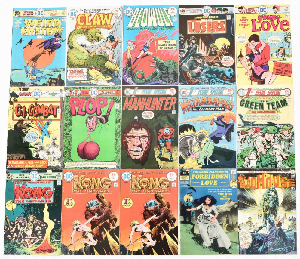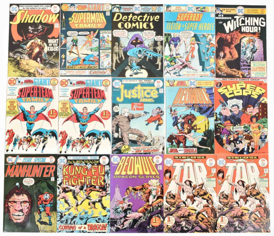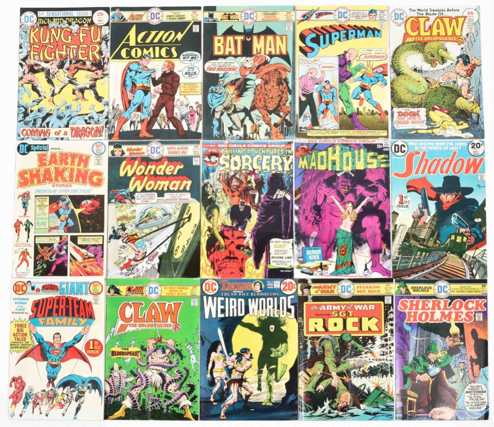 DC, 1975. Fine copy. With (2) Giant Super-Team Family no. 1,1975. (3) The Shadow. No. 1, 1973 (4) Richard Dragon Kung-Fu Fighter no. 1, 1975 -and 76 more comics, all 1973-75 incl. Mad House, Chilling Adventures in Sorcery, Wonder Woman, Superman, Batman, Action Comics.