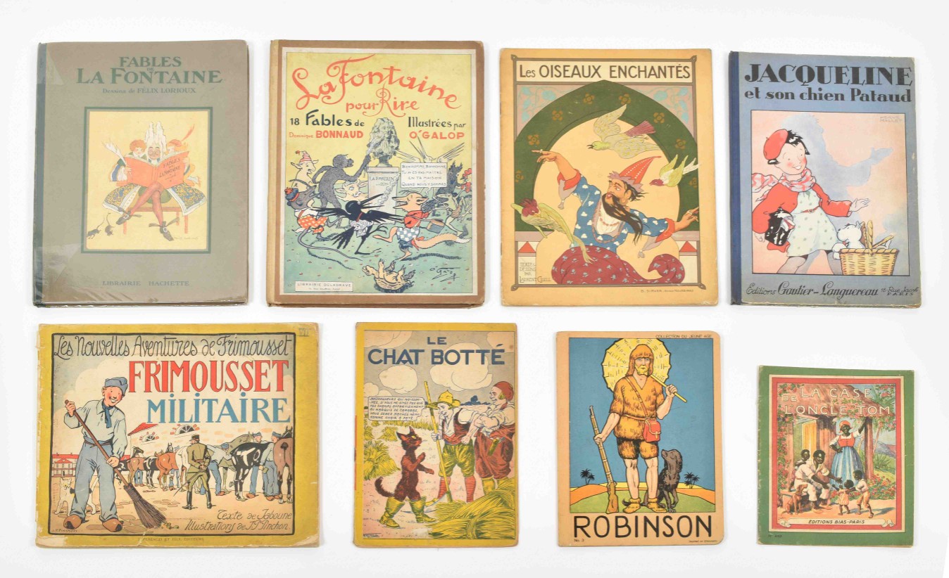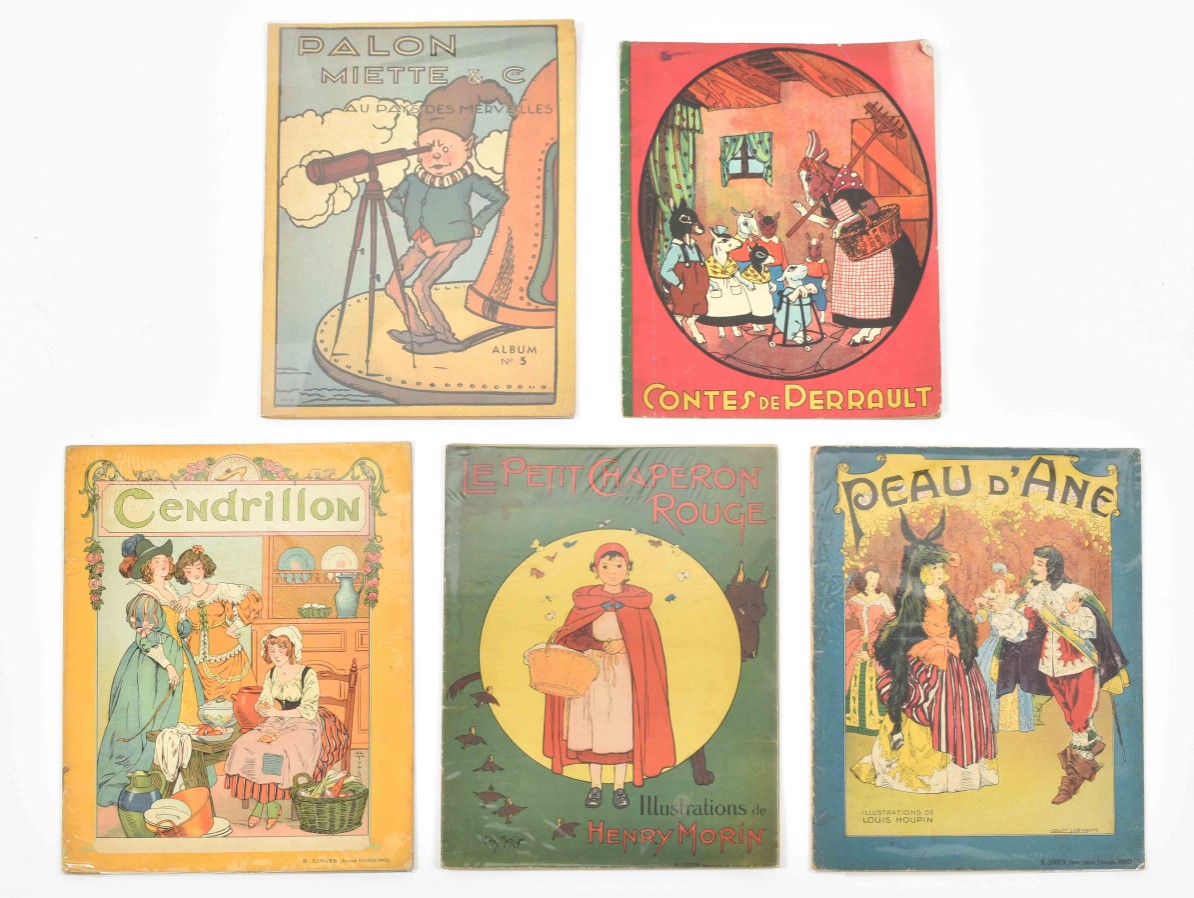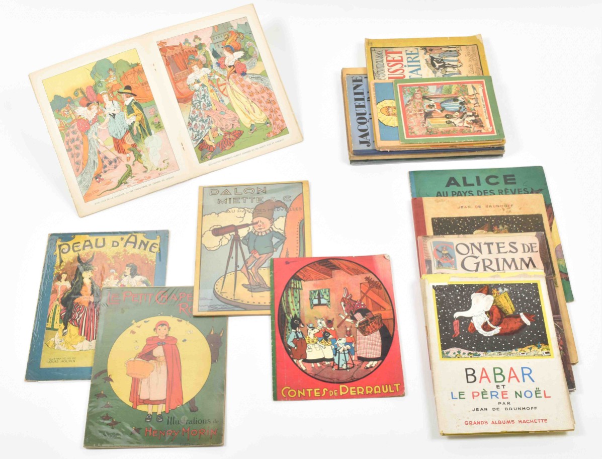 (Paris), Hachette, n.d. (1941), ills. and orig. clothbacked boards, folio. Covers a bit browned/ soiled. The first French edition. (2-5) 4 ills. Contes de Perrault. Incl. Le Petit chaperon rouge (2 copies) and Cendrillon. Ills. by a.o. Henry Morin, Louis Houpin and H. Thiriet. Some w. transparent wr., discol. and sl. worn. (6-9) 4 ill. Librairie Hachette publications, incl. Alice aux pays des rêves. Early 20th cent. Sl. worn, overall in good condition. -and 8 more similar works.