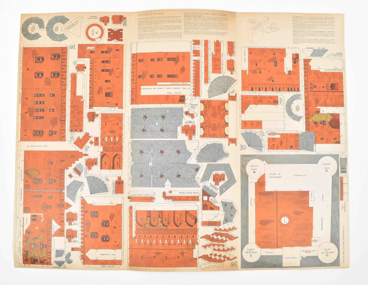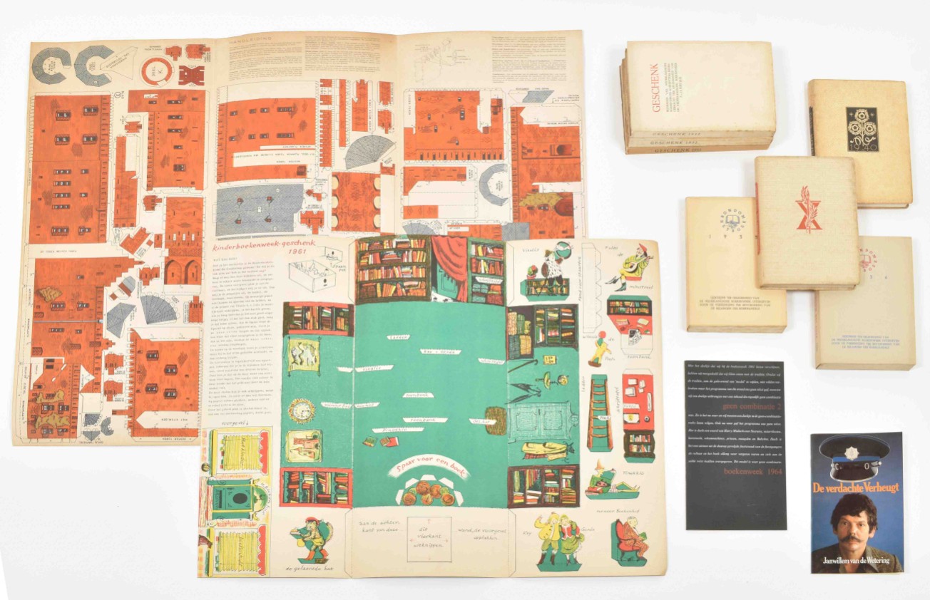 als geschenk ter gelegenheid van de kinderboekenweek 1958. (The Hague), Smulders, 1958. Col. lithogr. paper model toy, 80 x 62.5 cm, folded in 3 sections. Sl. browning to edges, foxed on title. (2) Kinderboekenweek-geschenk 1961, Wat zag Rob? Col. lithogr. paper model for a peep box of a bookshop. 63.5 x 49.5 cm. Folded in 3 sections. Sl. browning.