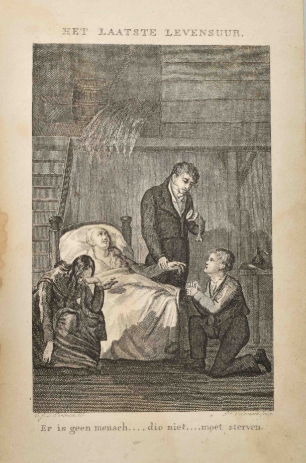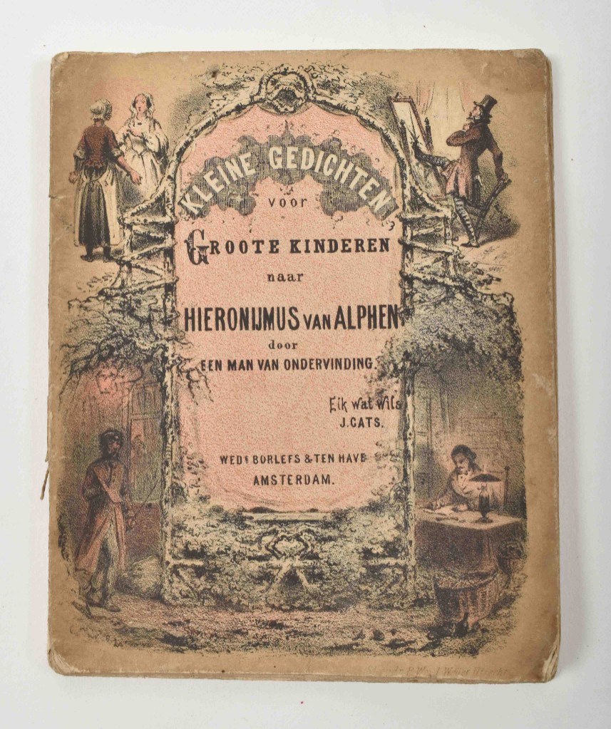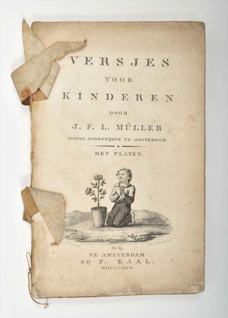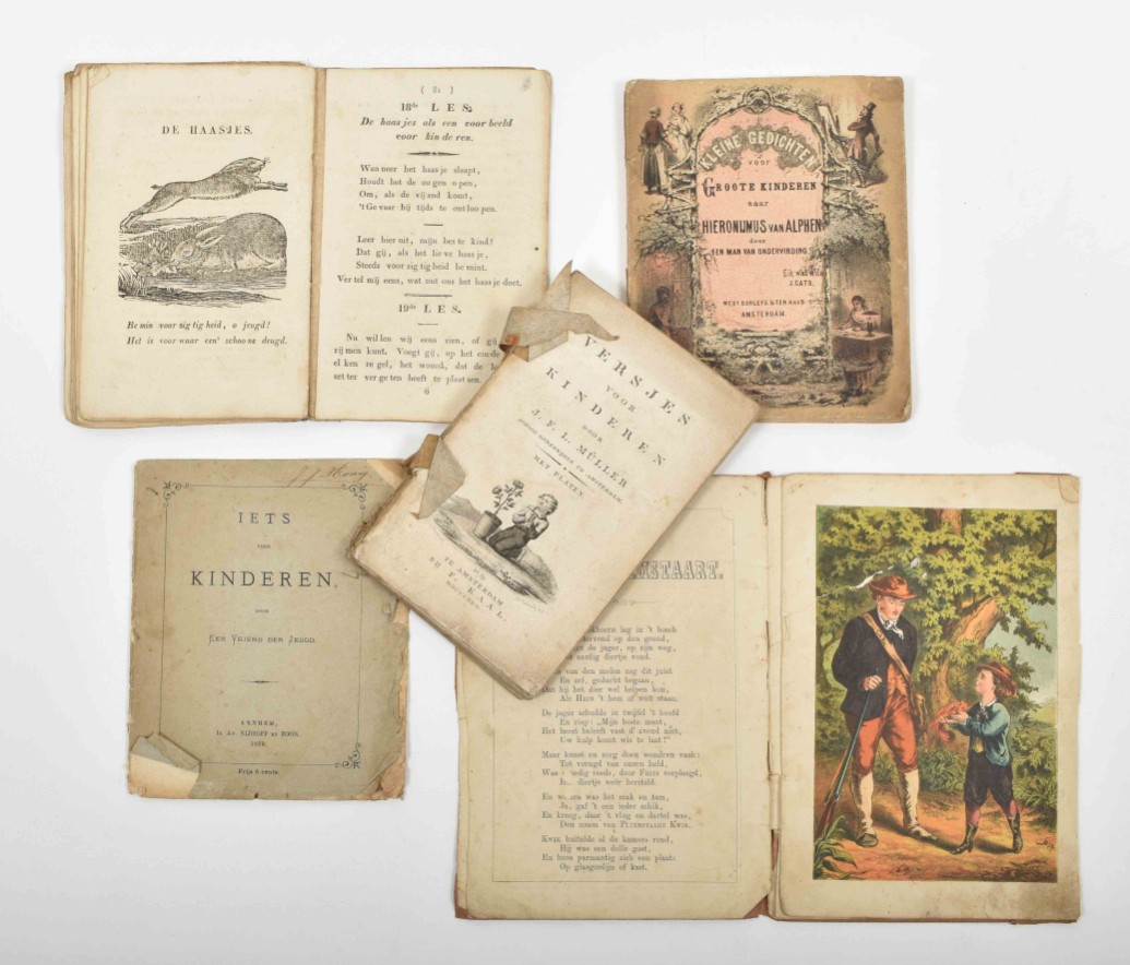 (1) J.F.L. Müller. Versjes voor kinderen. Amst., F. Kaal, 1825. (5),80 p. 16mo. Book block only. Title-p. vignette and 4 full-p. engr. Lacking covers, sl. staining. Good condition. Rare, not in the STCN. (2) (Hieronymus van Alphen). Kleine gedichten voor groote kinderen. Amst., Wed. Borlefs & ten Have, (1859). 59,(3) p. 16mo. Orig. ills. sc. Spine sl. worn, some foxing. -and 3 other sm. 19th cent. children's publ.