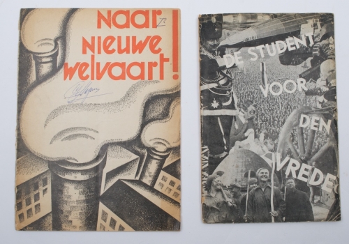 De Baanbreker/Servire, den Haag, 1931. Published by the Studenten-vredesactie. Photo montage J.W. Bottenheim. Spine sl. dam., otherwise good. + Pamphlet "Naar nieuwe Welvaart!. Tegen dictatuur. Voor de vrijheid. voor de democratie. N.V.V., 1935. Design Reen.