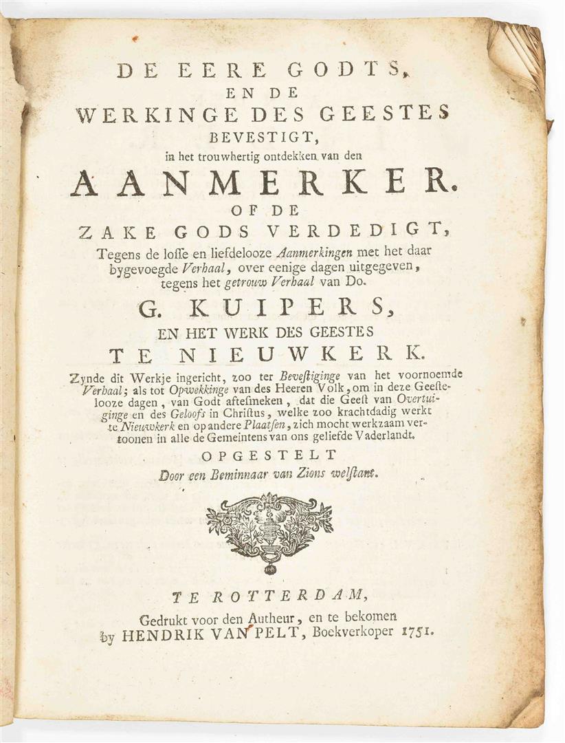 Partly loose. The 2nd part (p. 25 onwards) present twice. This copy numbered "No. 13" on every leaf. (2) C. Streso. Danck-Predicatie, uuyt den CXXII. Psalm, gedaen in 's Graven-Hage den 21 Augusti 1651. Op de groote zaele, in de doorluchtige ende hoogh-aensienlicke vergaderinge van de Hooge Machten der Seven Gheunieerde Nederlandtsche Provintien. (...). The Hague, J. Doll, 1651, (4),20 p., old wr., 4to. Partly nibbled on in blank outer margins (also affecting backwr.). -and 8 others (1720-1780). (total 10)