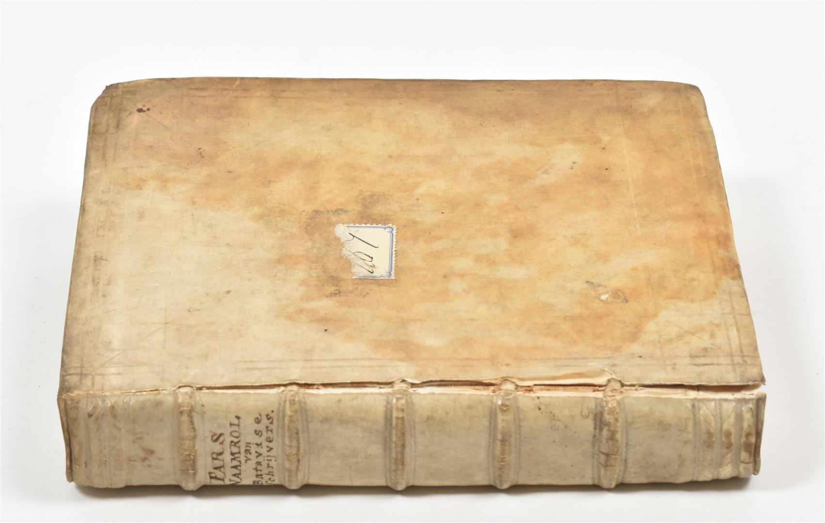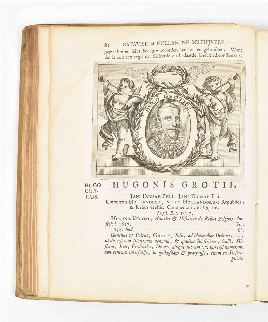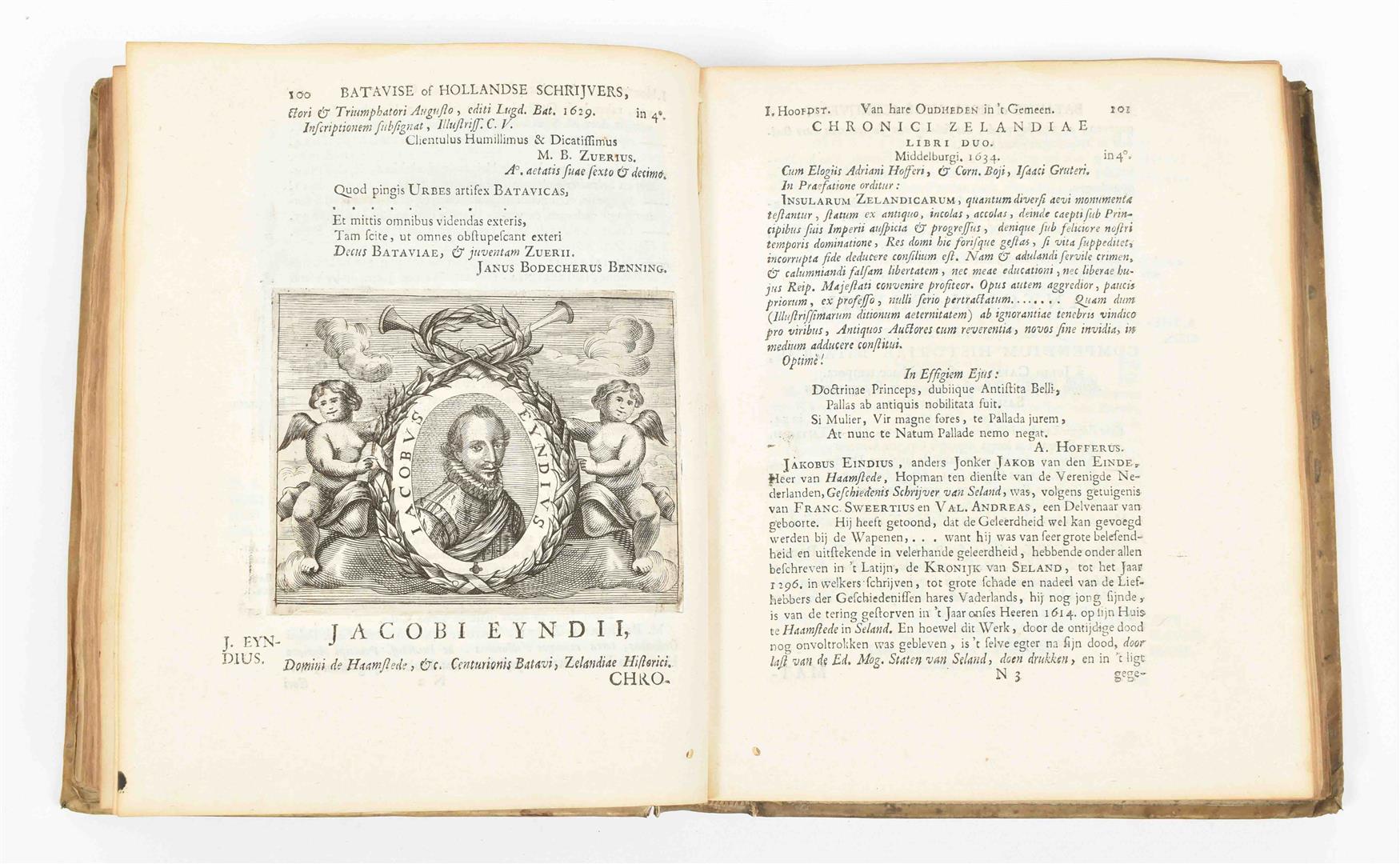 en Hollandse schrijvers. Van Julius Cesar af, tot dese tijden toe. Leiden, A. de Swart, 1701. 60,483,(13) p. Large 8vo. Contemp. vellum w. manuscript title on ribbed spine. Engr. frontisp., fine engr. printer's mark, and complete w. 30 half-p. engr. portraits within medallions.