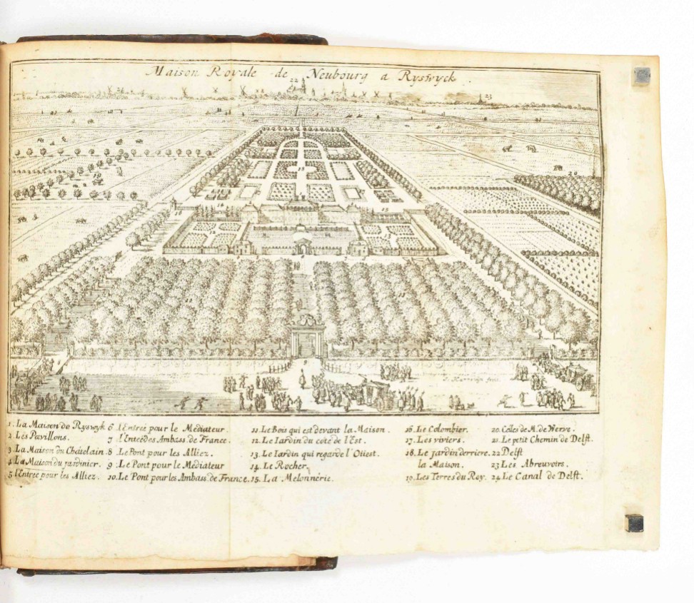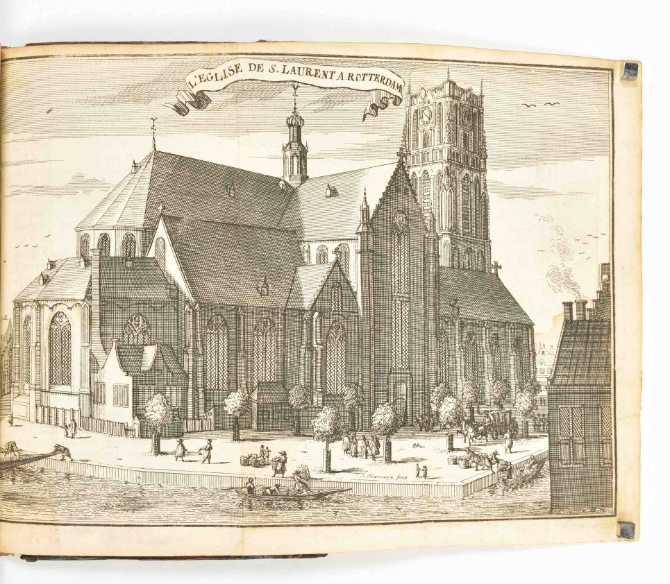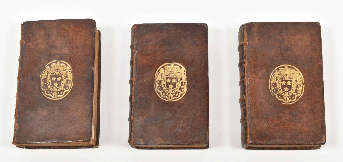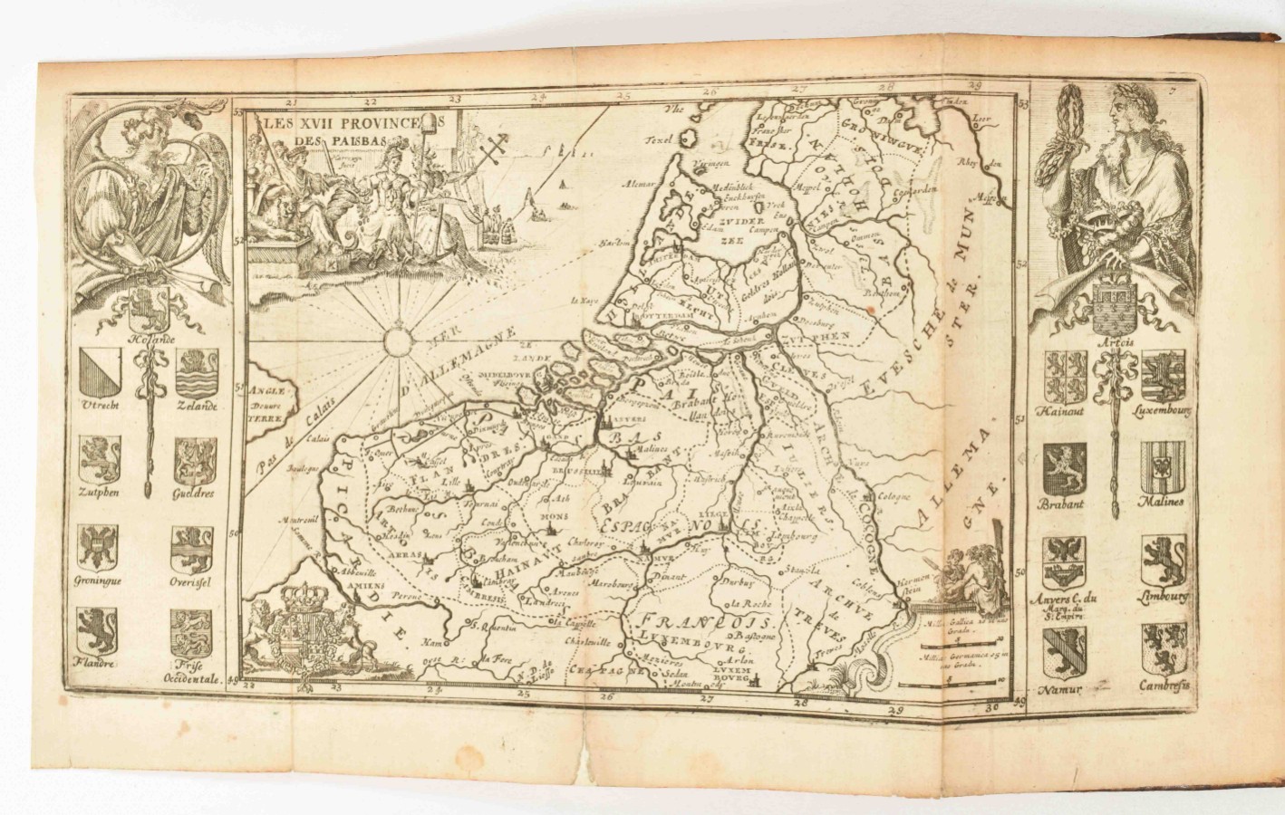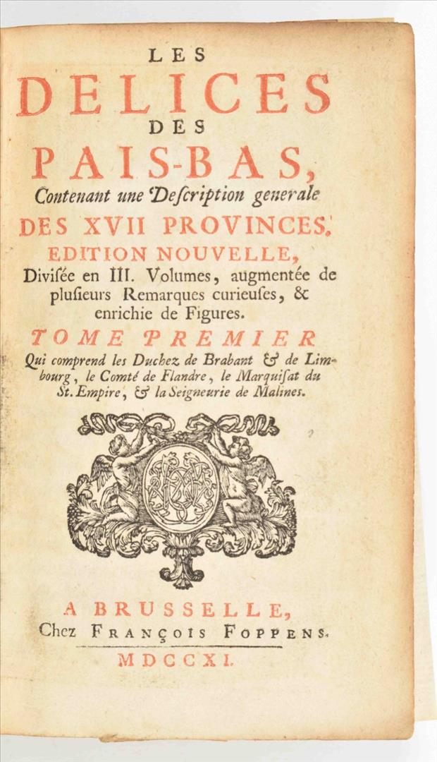 Contenant une Description generale des XVII provinces. (...). Brussels, Francois Foppens, 1711. 3 vols. Title-p. in red and black, title-p. vignettes, complete w. 81 engr. plates (mostly fold.) by J. Harrewijn or P. Devel: 3 frontisp., 1 map of the 17 Provinces w. coats of arms, 1 portrait, 23 city maps, and 53 views. Unif. calf w. gilt centerpieces (upper and lower covers), fleurons and title on spine. Sm. 8vo.