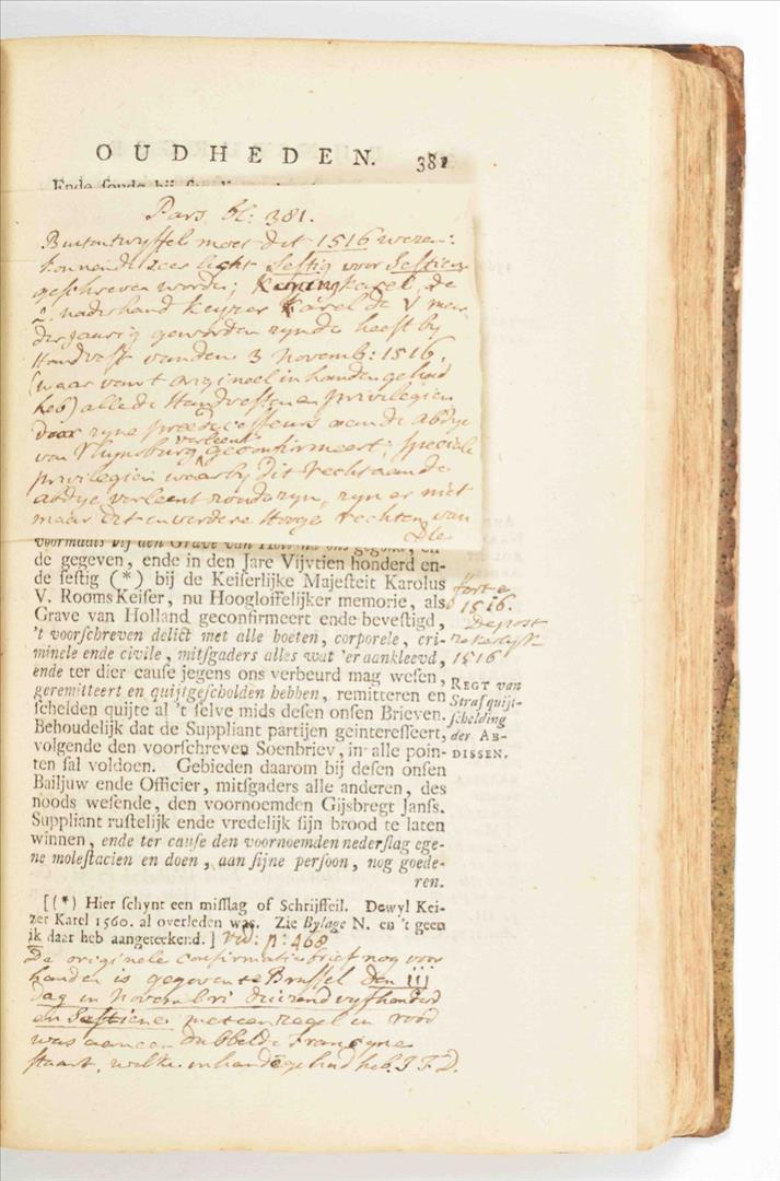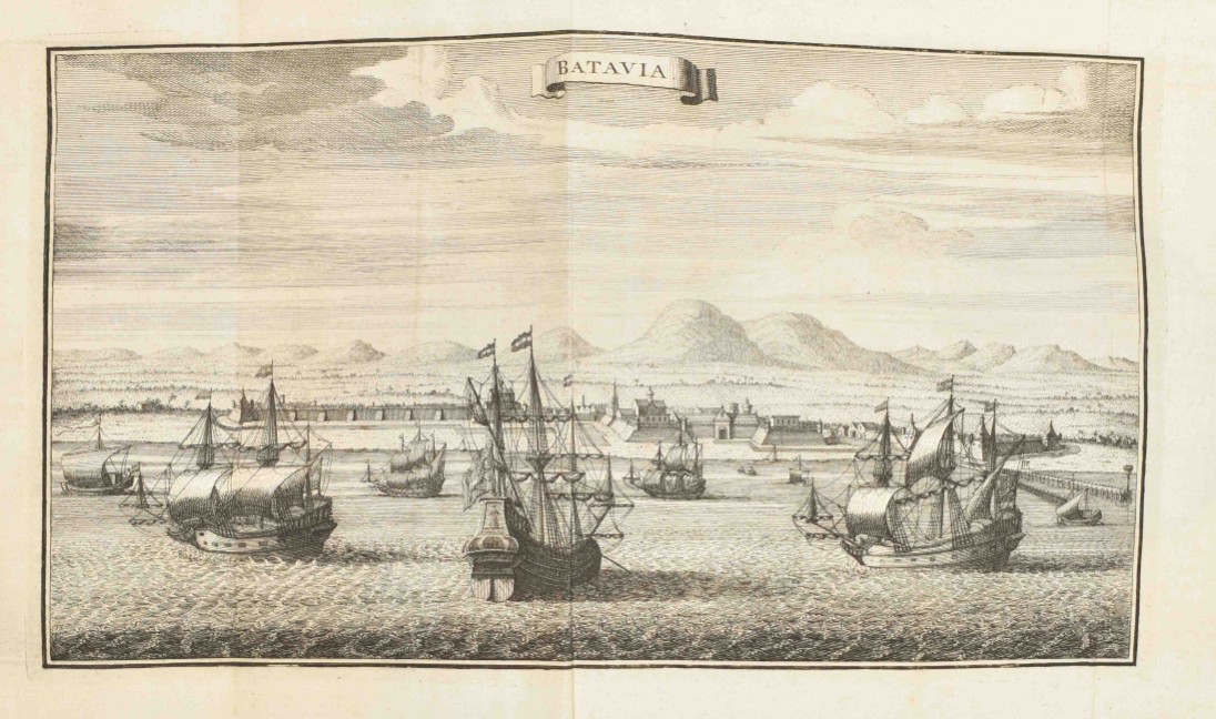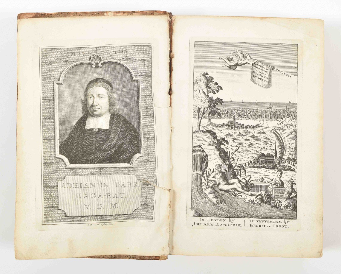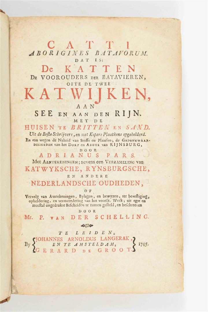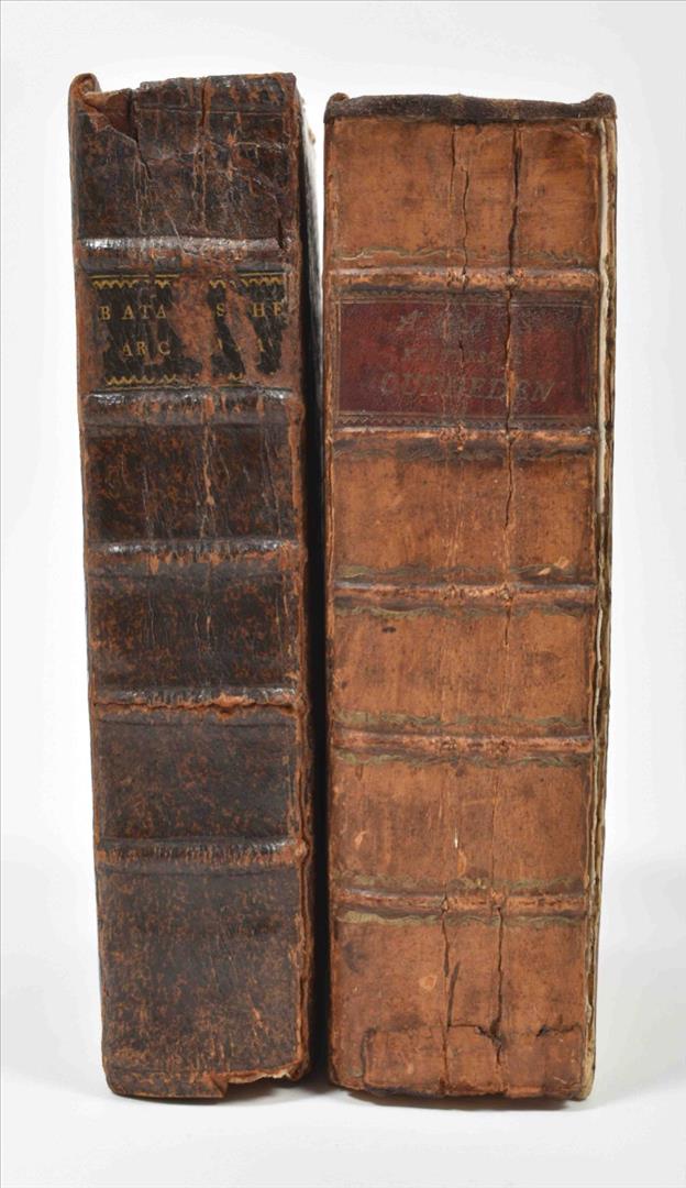 Dat is: De Katten De Voorouders der Batavieren, ofte de twee Katwijken, aan See en aan den Rijn. Met de Huisen te Britten en Sand. En van wegen de Naheid van Stoffe en Plaatsen, de Gedenkwaardigheden van het Dorp en Abdye van Rijnsburg (...). Ed. P. van der Schelling. Leiden/ Amst., J.A. Langerak/ G. de Groot, 1745. (122),604,(89) p. Engr. frontisp., armorial plate, portrait, 11 double-p./ fold. and 4 full-p. views and plates, a few sm. ills. throughout, untrimmed. Hcalf w. speckled paper boards. 8vo. Sm. ex libris front pastedown, some contemp. marginal annotations, incl. 2 tipped-in sheets, p. 381 and p. 471. Front cover loose, spine worn, portrait sl. torn, first few p. waterst. in upper left corner. (2) J. van Heemskerk. Batavische arcadia waar in: Onder 't Loof-werk van Liefkooserye, gehandelt werdt. Amst., A. & A. Schoonburg, 1751. (16),656,(48) p. Engr. frontisp., 5 fold. engr. plates (incl. a fold. perspective view of Batavia), untrimmed. Hcalf w. marbled paper boards. 8vo.