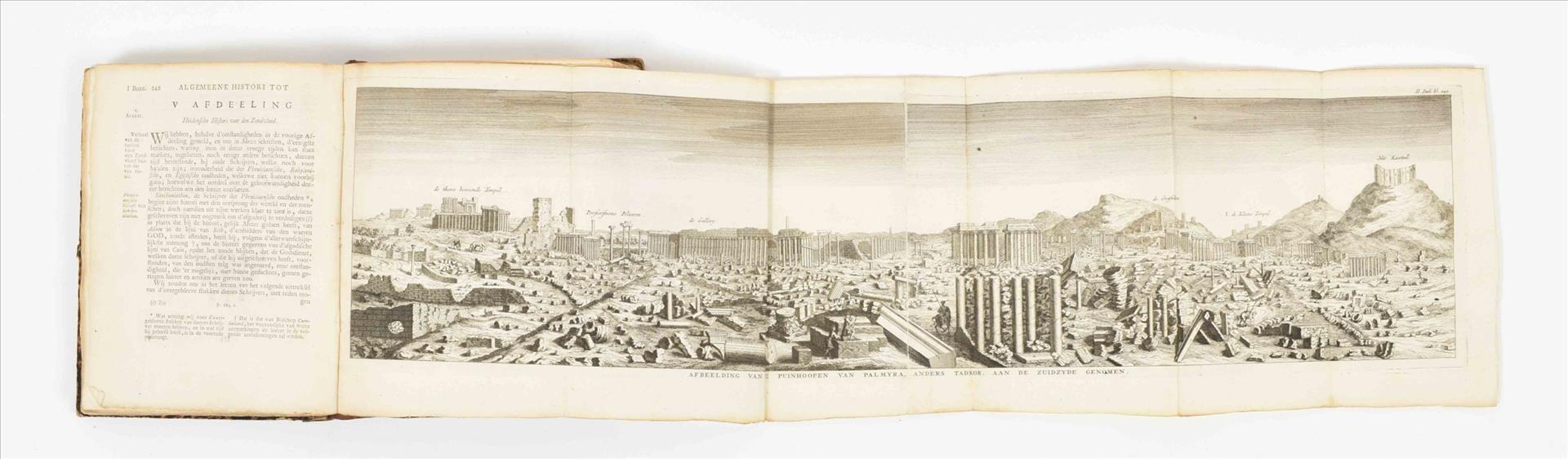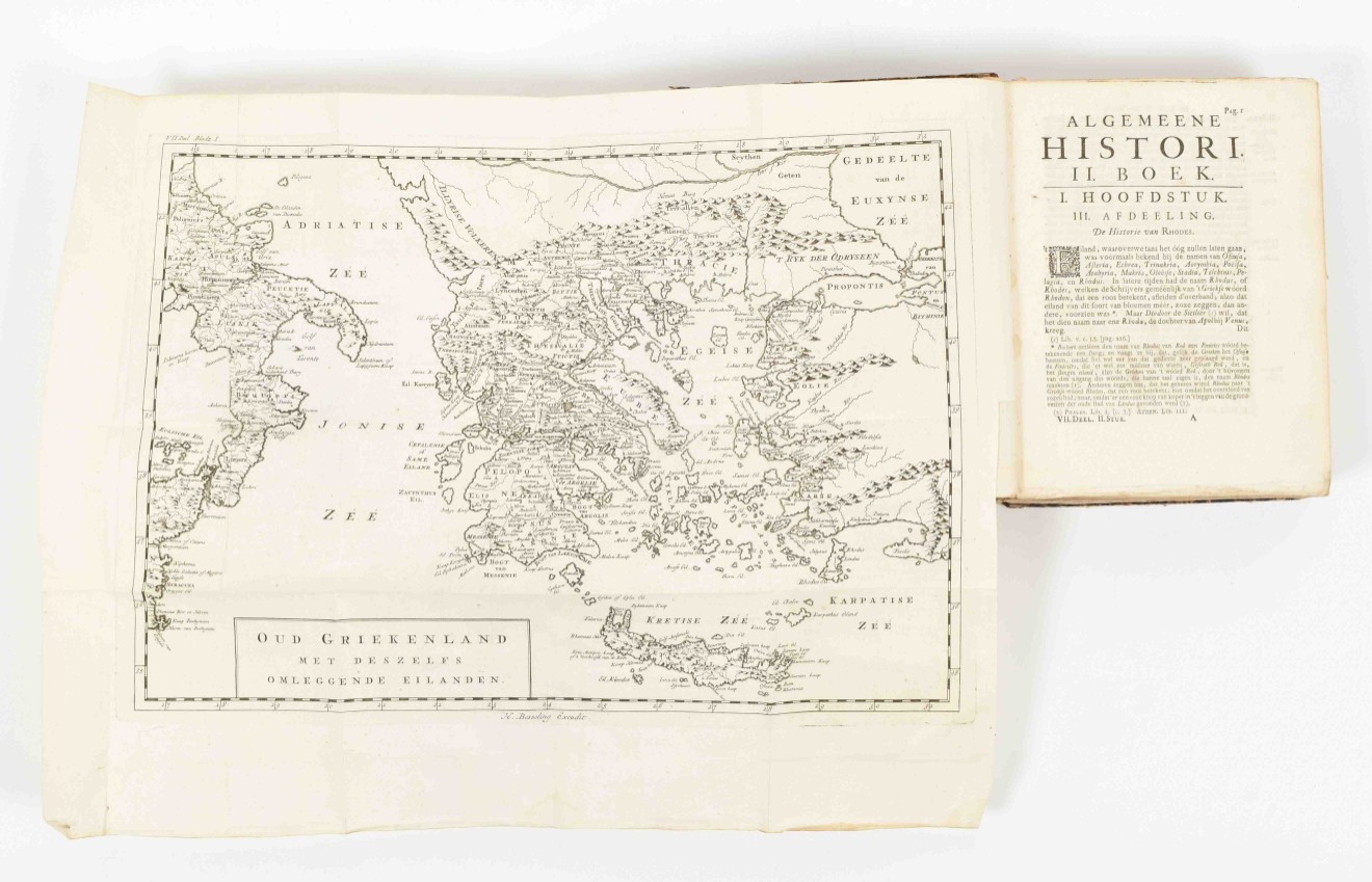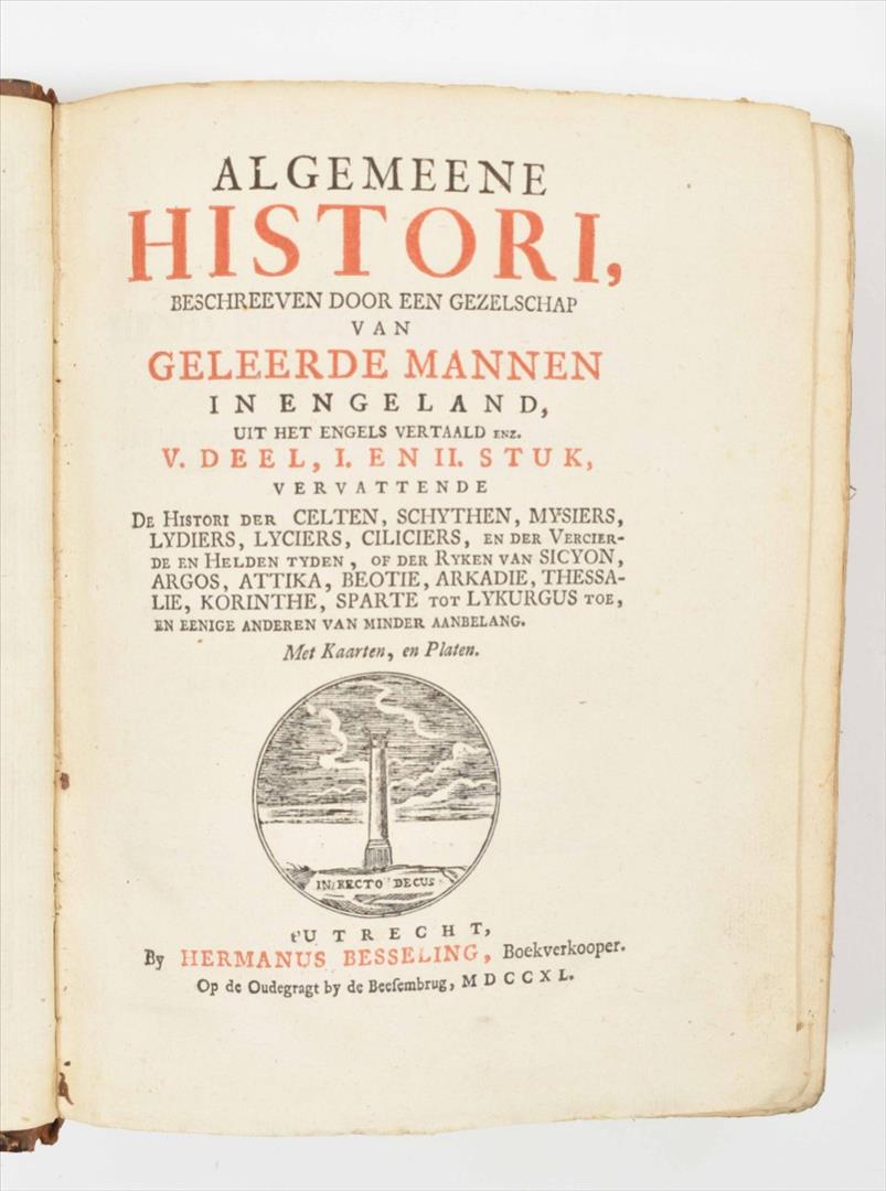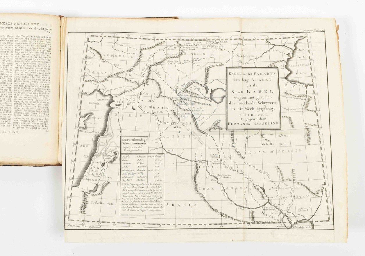 tijd toe. Getrokkken uit oorspongkelijke schrijveren: En opgehelderd met landkaerten, printverbeeldingen, tijdrekenkundige en andere tafelen. Beschreeven door een gezelschap van geleerde mannen in Engeland. Utrecht, H. & J. Besseling, 1741-55. 37 parts in 19 vols., incl. 1 index vol. 18 engr. frontisp., 109 (of 114) mostly fold. engr. plates/ maps/ views/ portraits. Unif. hcalf, marbled paper over boards, gilt title and vol. labels on raised spines w. fleurons in gold. 4to.